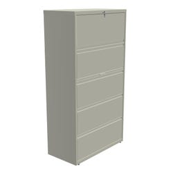 Keep the paperwork mess off your desk with the Lateral Filing Cabinet from Classroom Select. The 5 full-width pull drawers slide smoothly in/out with heavy-duty ball-bearing slide suspenders, while an interlock system prohibits the extension of more than one drawer at a time. The inside is ready to use with hanging file rails for side-to-side filing of letter-size, legal-size, or A4-size documents. The lateral design also comes with a core-removable lock and dual locking bars for reliable security. Cabinet has a reinforced base and 4 adjustable leveling guides that provide stabilization on any surface; the counterweight prevents tipping. The unit meets or exceeds applicable ANSI/BIFMA standards.Features
