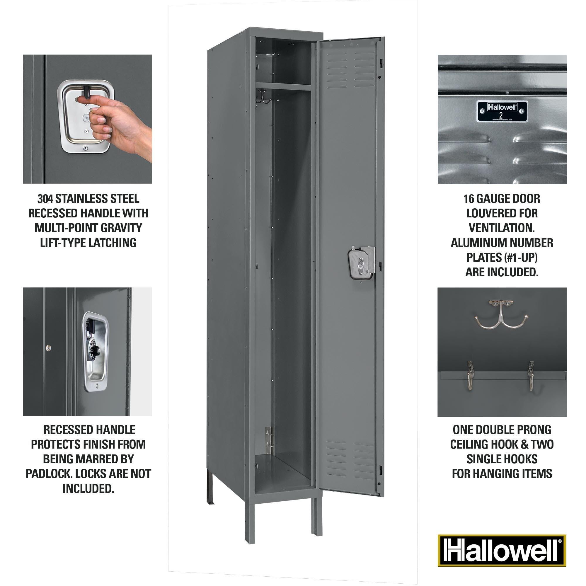 Hallowell’s Premium Wardrobe Lockers feature 16-gauge steel doors mounted in a 24-gauge steel frame for strength and durability, the perfect storage solution for your school, care center, or any public space that requires a simple visitor security solution. Stainless steel recessed handle with multi-point gravity lift-type latching for a modern look and added safety. Recessed handle protects finish from being marred by padlock. Includes 6-inch legs for an overall finished height of 66 or 78 inches. Locker is shipped knocked down or assembled. Comes in a variety of measurements and colors to best match your space. Choose between an assembled locker or a locker that requires assembly when ordering.