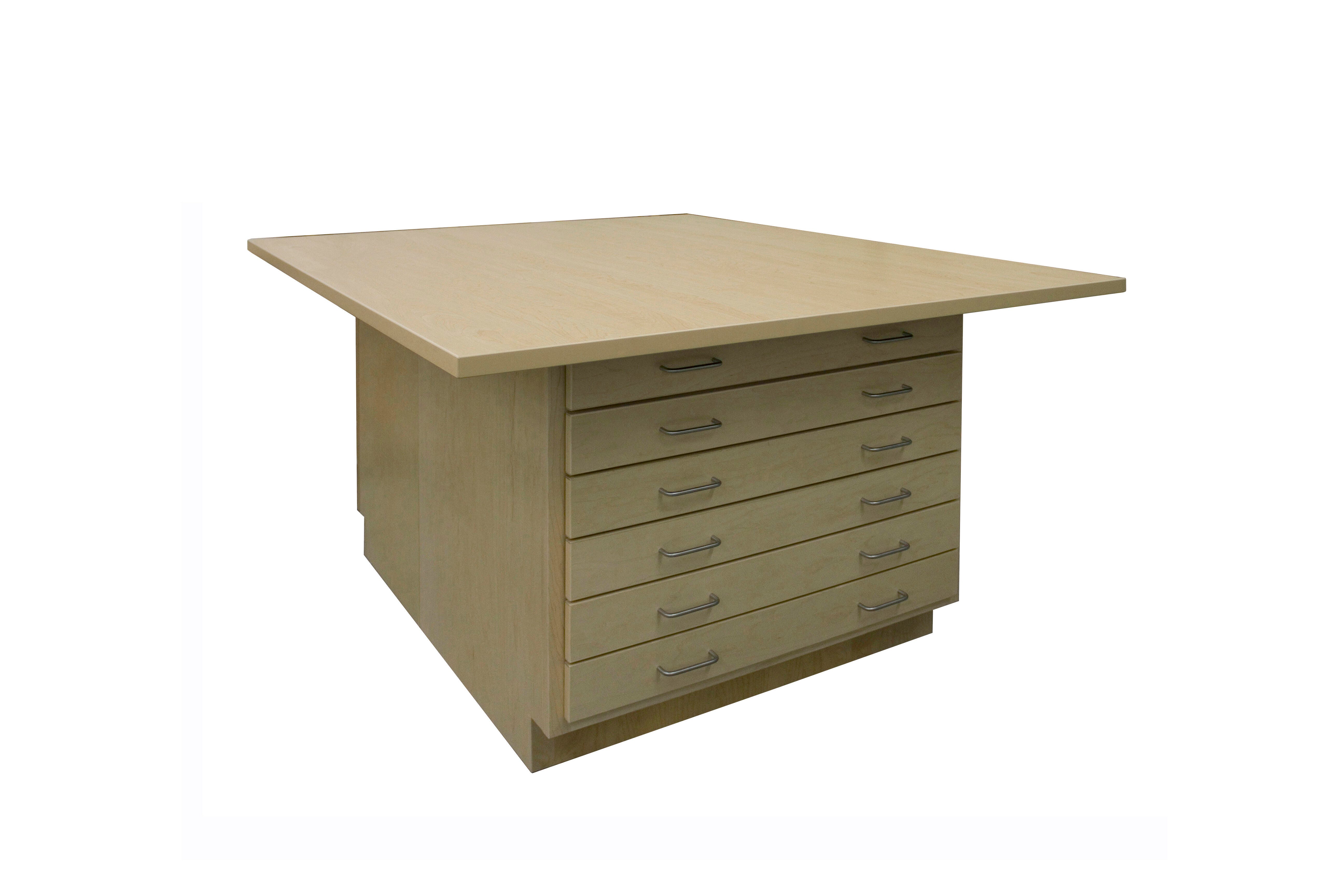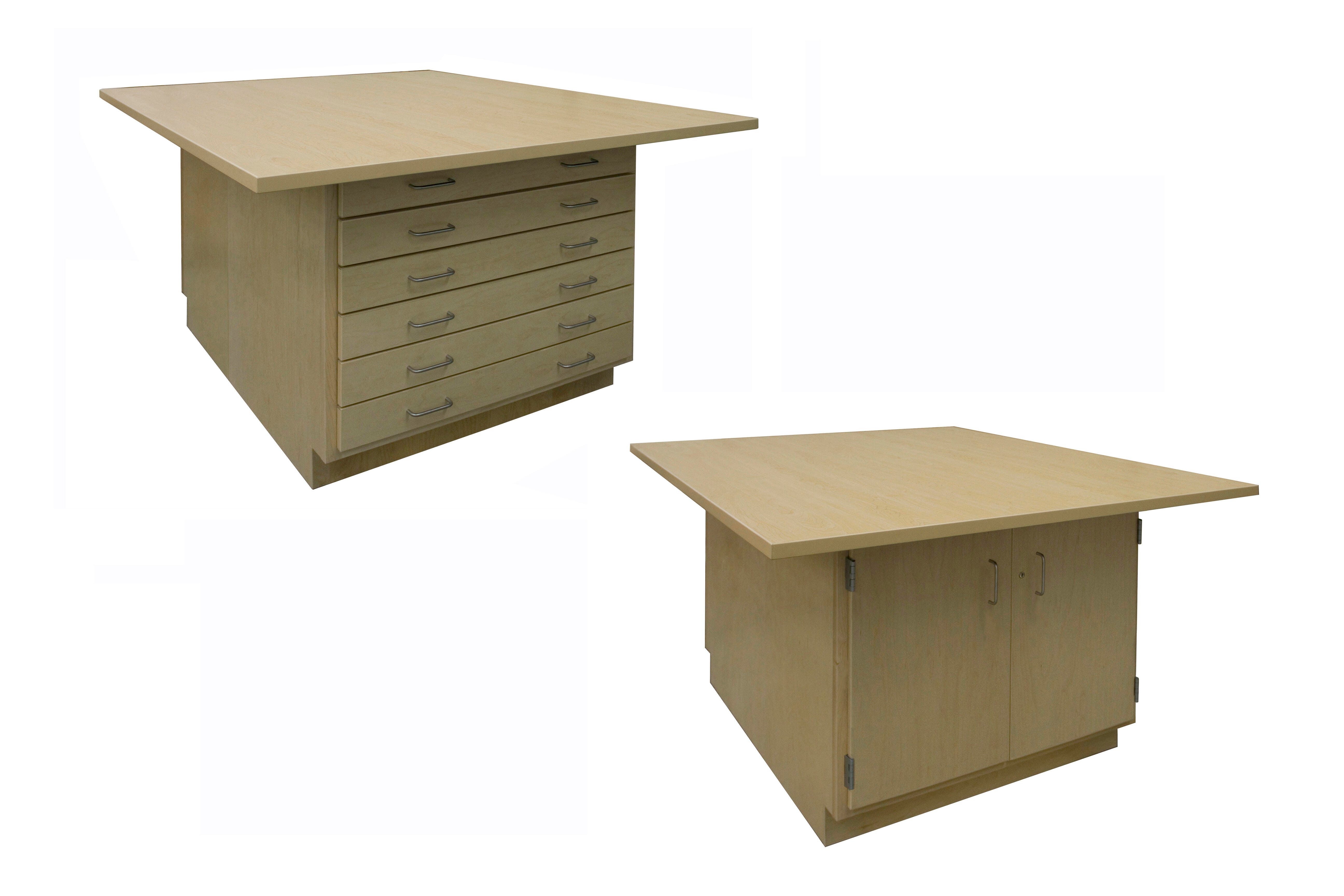 This Art and Printmaking Workstation serves as a great project center providing both a large, sturdy work surface as well as a variety of storage options. The base consists of two cabinets placed back-to-back. The cabinets are built using heavy-duty solid hard maple face frame construction. One side of this workstation features a 6-drawer cabinet for paper and tool storage. The maple grain patterned HPL top measures 64 W x 54 D x 1-1/4 H inches and overhangs the base by roughly 9 inches on all sides allowing for seating around the entire perimeter of the workstation. Each drawer measures 31 W x 23 D x 1-3/4 H inches (I.D.). The opposite side of the unit is a double-door cabinet with an adjustable shelf for flexible storage of larger project items. The overall height is 32-1/4 inches.Features