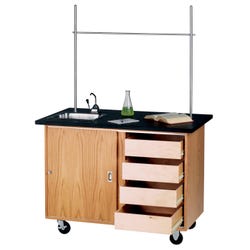 Diversified Woodcrafts Mobile Demonstration Table with Drawer measures 48 x 28 x 36 inches and is designed with durable 1-1/4 inch thick chemguard top. Table easily rolls on 4 inch swivel casters with brakes while featuring four dovetailed drawers mounted on epoxy coated glides offering ample storage space. Table of 500 pound capacity comes with water supply, waste container, stainless steel sink, hand pump, 25 foot extension cord, GFI protected AC duplex electrical receptacle and full upright rod along with crossbar set. Four drawers and storage compartment for large equipment are concealed with sliding doors and a lock while it comes with two 2-1/2 gallon water bottles.