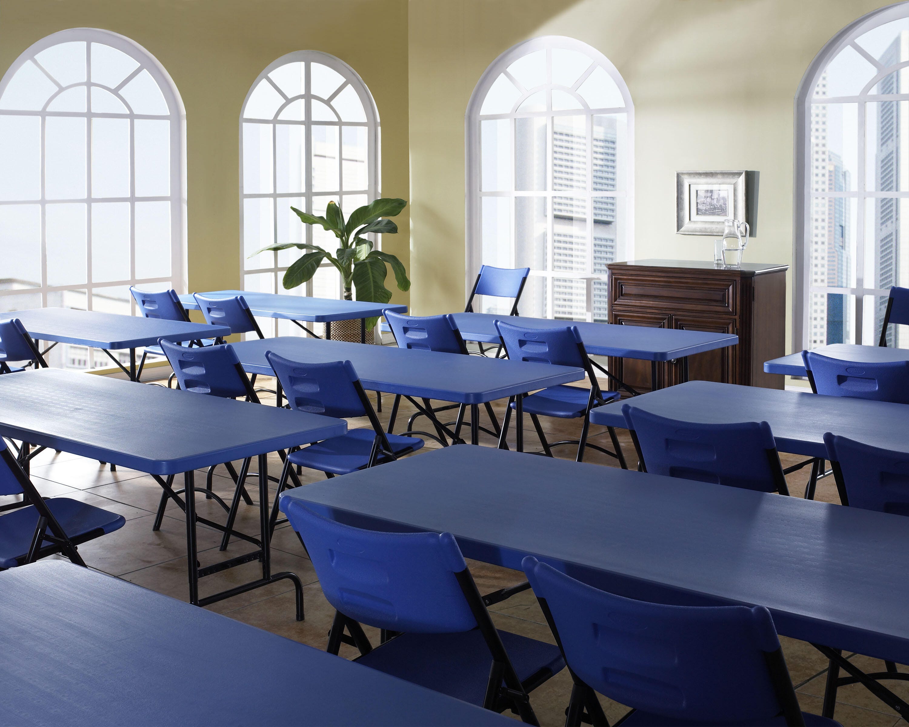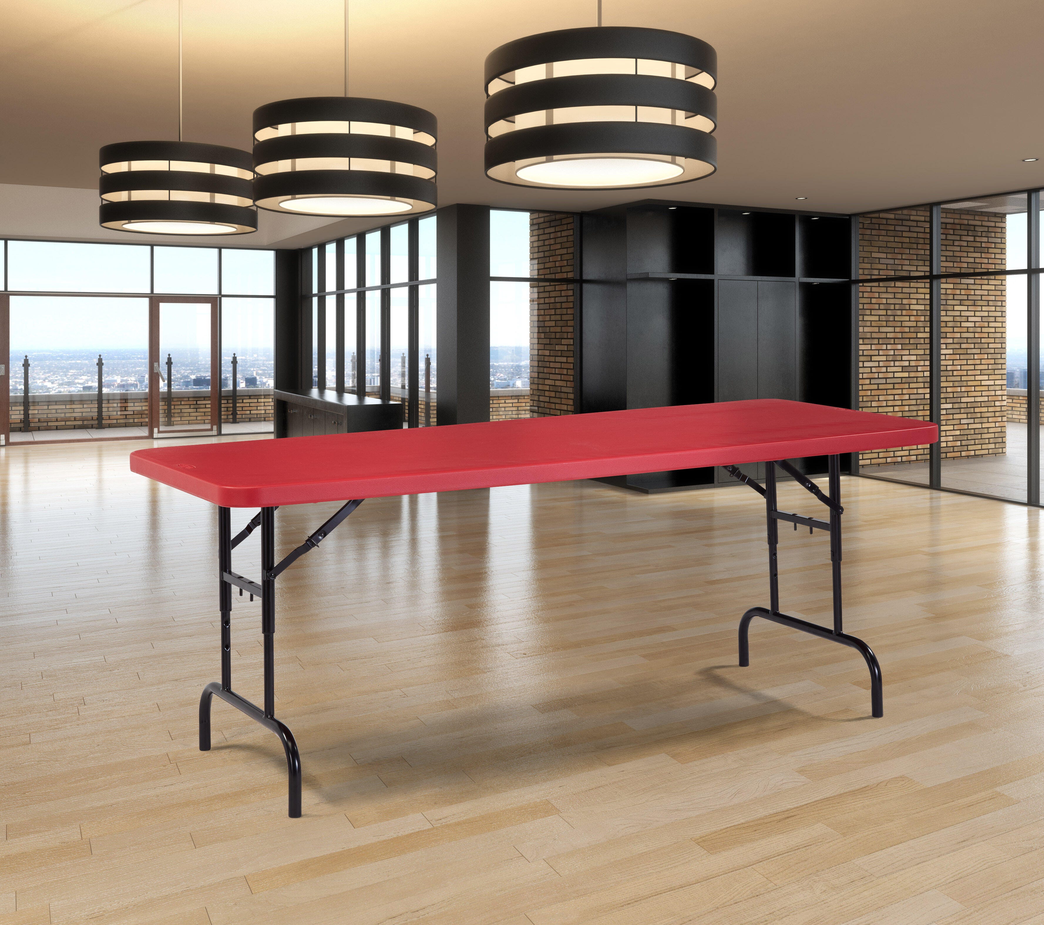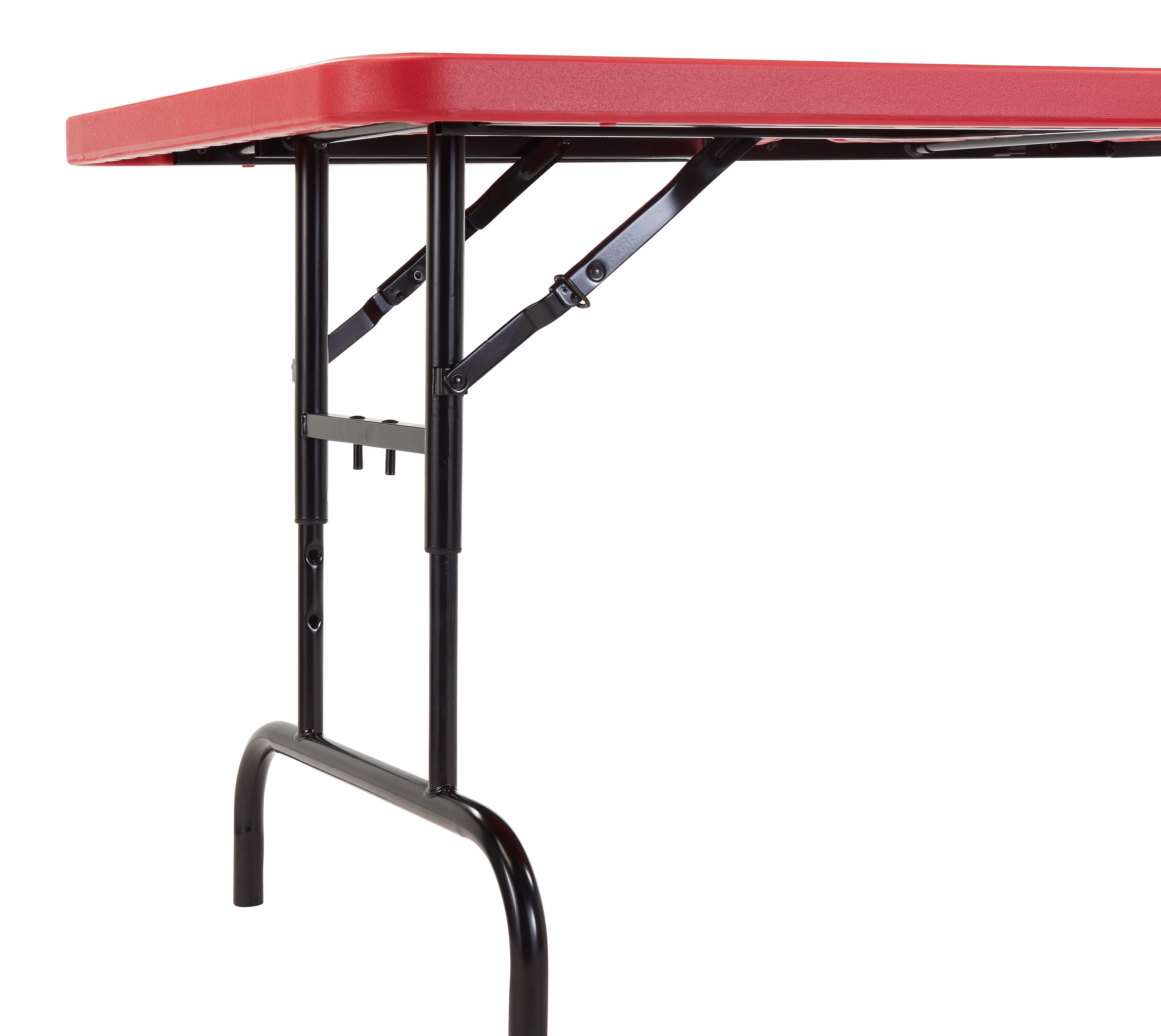 The All American Color Series Lightweight Plastic Folding Table by National Public Seating has a stain-resistant blow-molded top. The colors are deeply embedded in plastic and will not fade or scratch. It has a 17-gauge frame with a spring-loaded mechanism mounted on a pedestal-style leg that allows the user to vary the height and polyethylene non-marring floor glides.Features