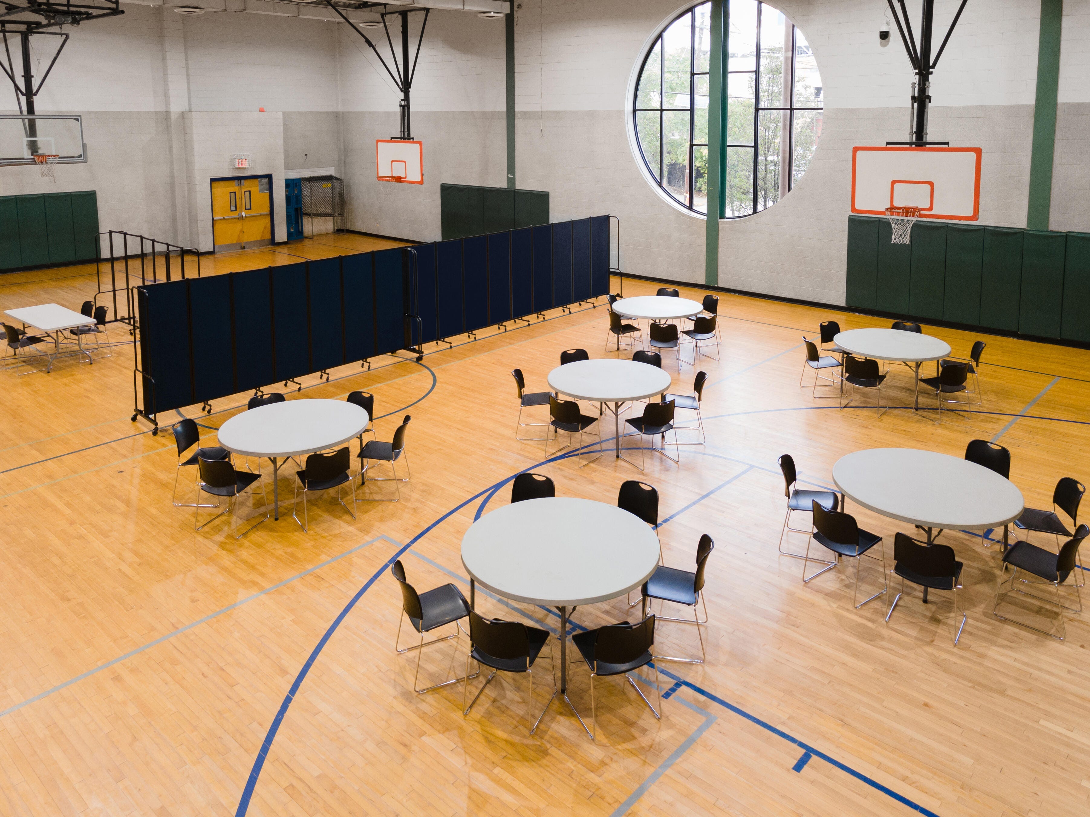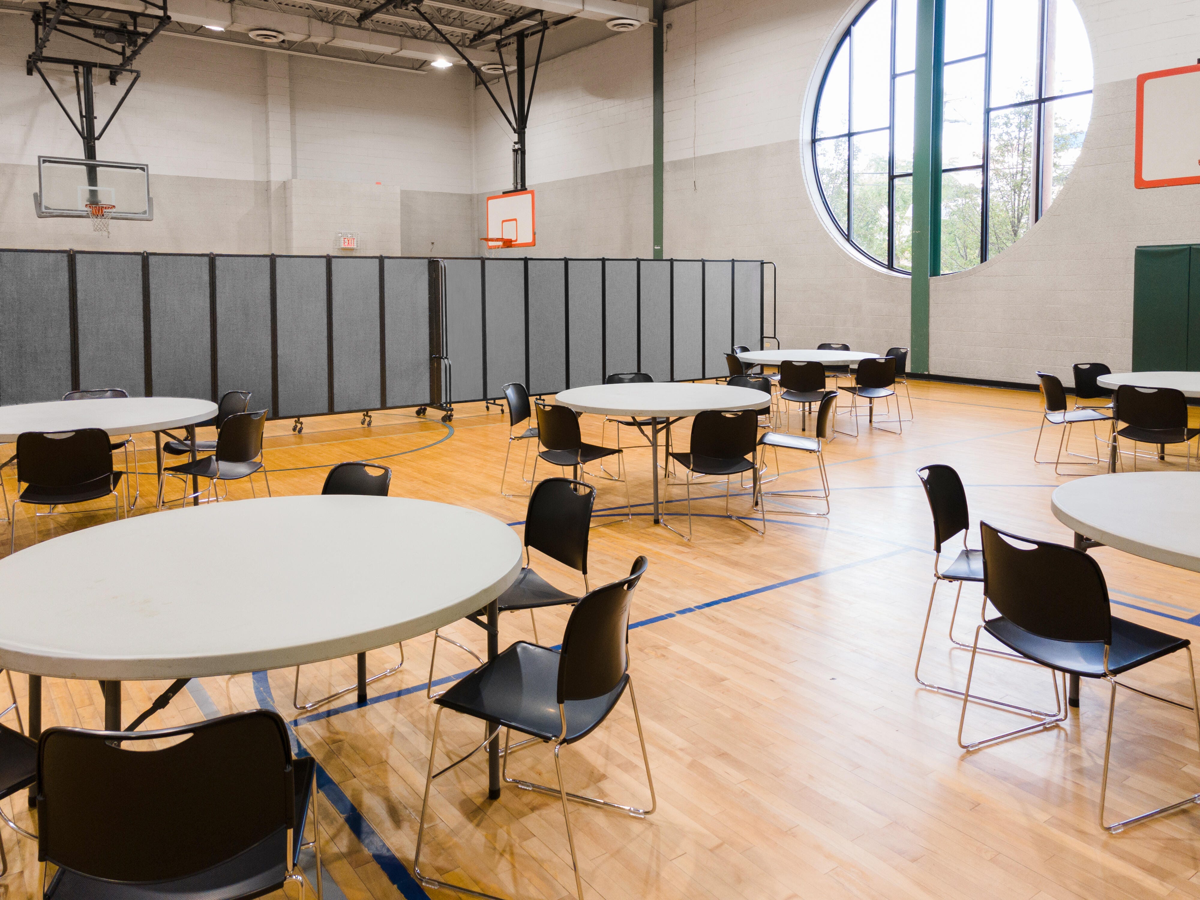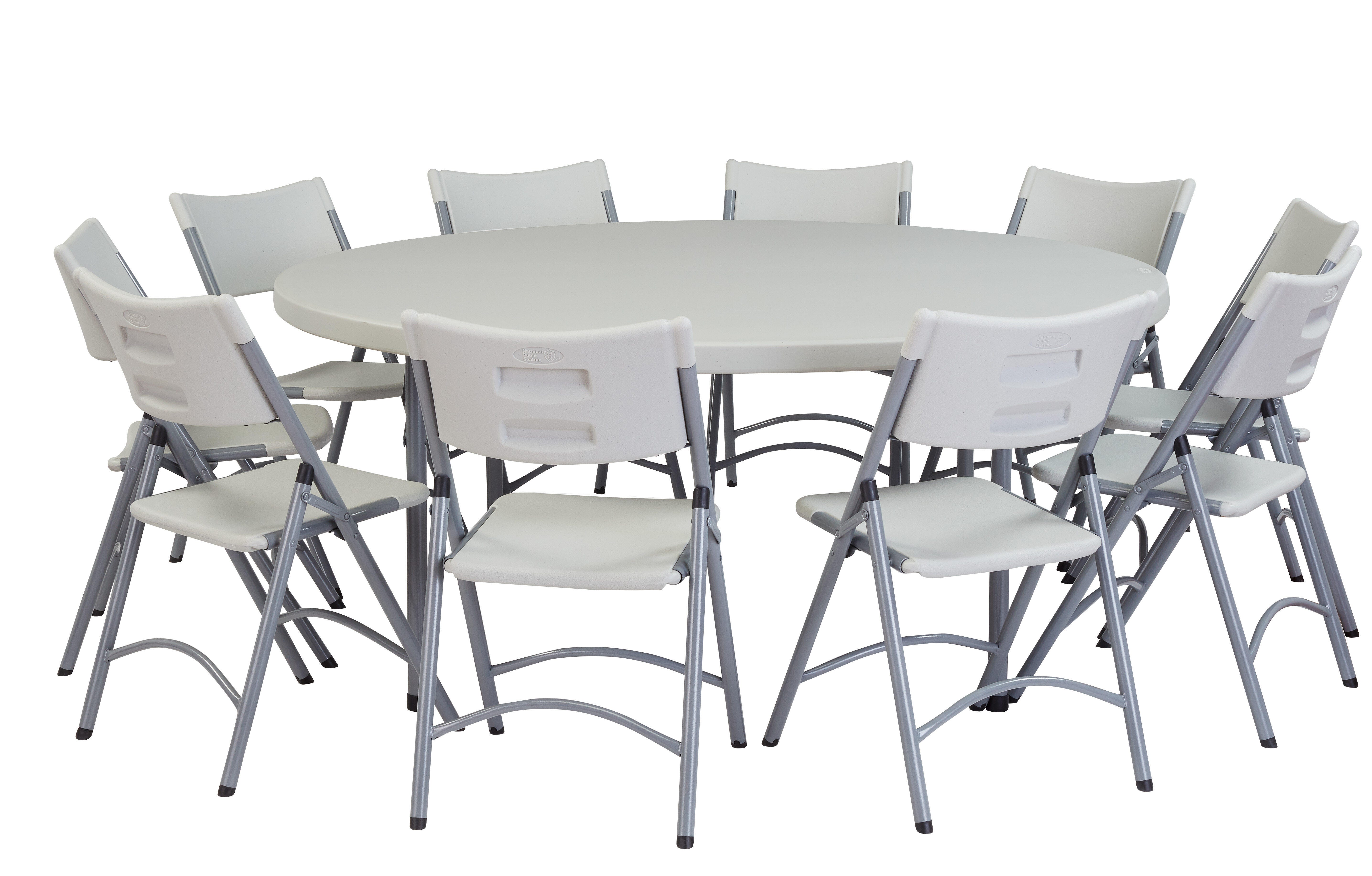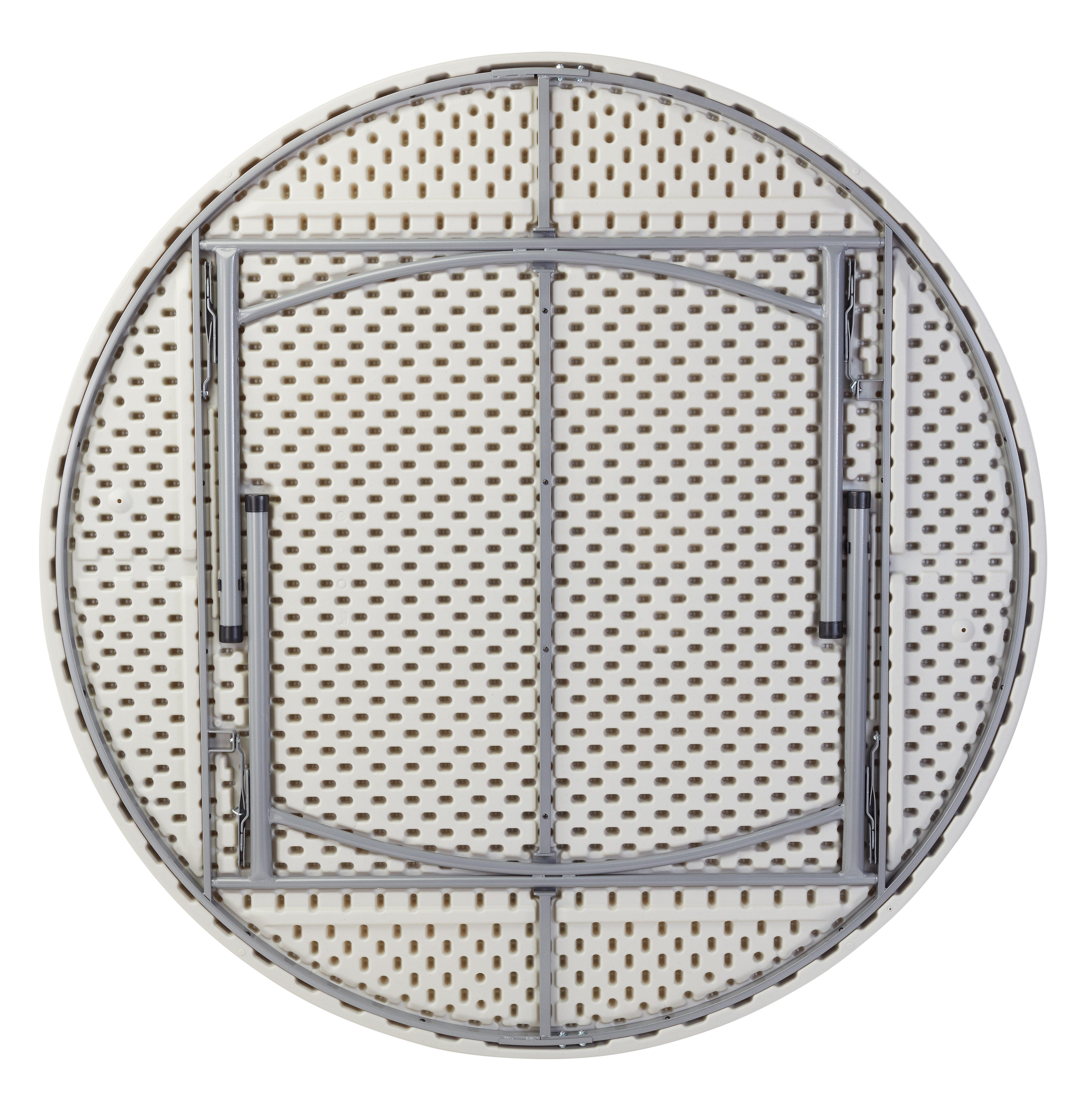 National Public Seating Lightweight Round Folding Table measuring 71 diameter x 29-1/2 H inches with blow-molded plastic top offers maximum durability. Attractive table features a lightly sprinkled gray with matching powder coated legs that are resistant to corrosion. Easy to move table is appropriately designed to offer extreme comfort and is suitable for any occasion.
