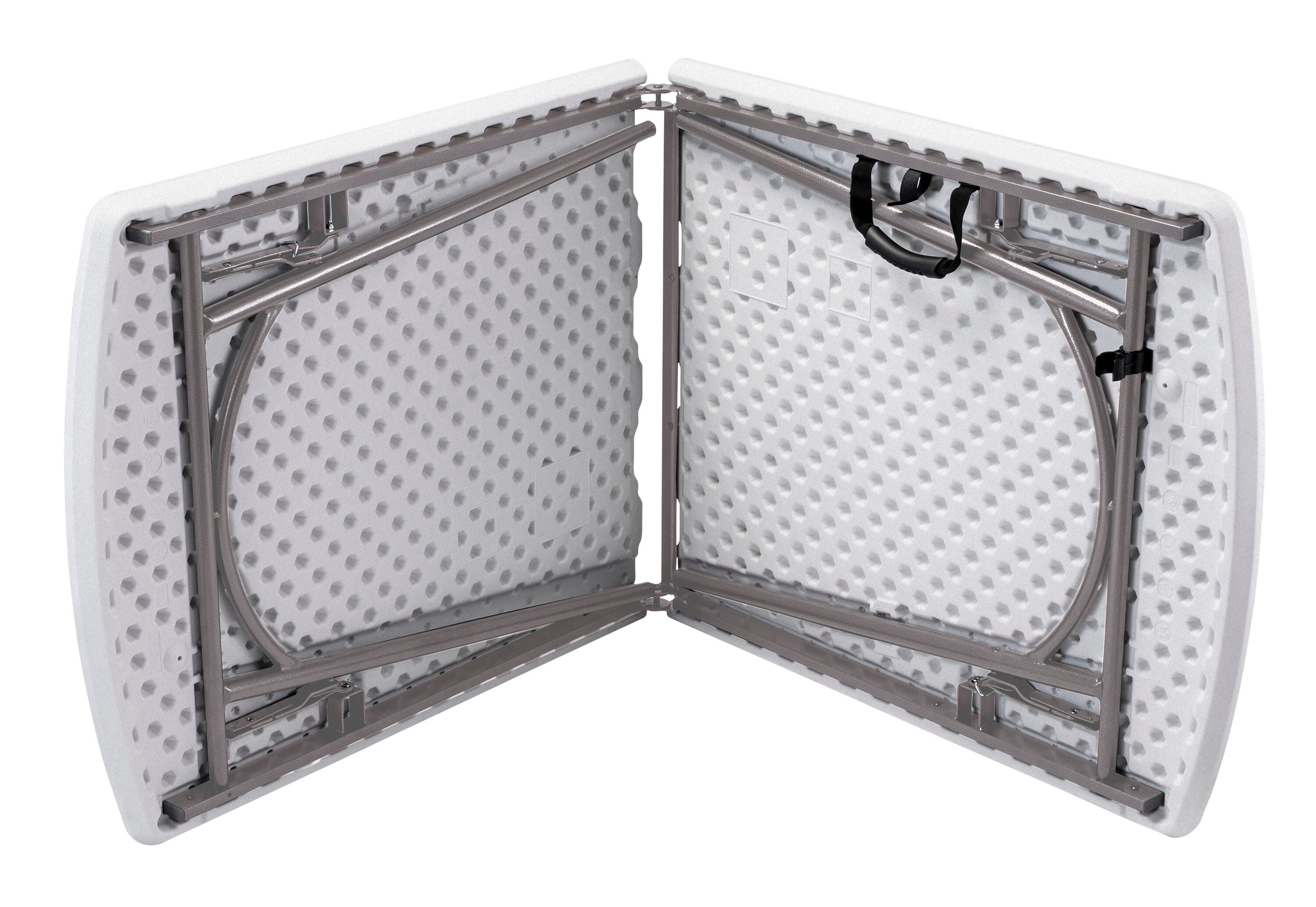 With our all-new decorative 6 ft. banquet fold-in-half space saver heavy-duty table, NPS brings to the table a new level of elegance & style. With its first of its kind rounded ends and oblique edges, this classy table will enhance the ambiance of your room. This banquet table folds in half, making it very convenient for storage when you’re not using it. Table is built from high-density polyethylene (HDPE) plastic and a speckled grey powder-coated 19 gauge steel frame. The table is lightweight, and weather resistant. It is designed with safety gravity rings which prevent table legs from collapsing while in use and is equipped with our unique locking technology that automatically locks the tabletop in place as legs are unfolded. Once folded, table can be easily carried & transported with its convenient carrying handle. Our table is extremely durable, ANSI BIFMA tested and backed by a 10 year warranty.