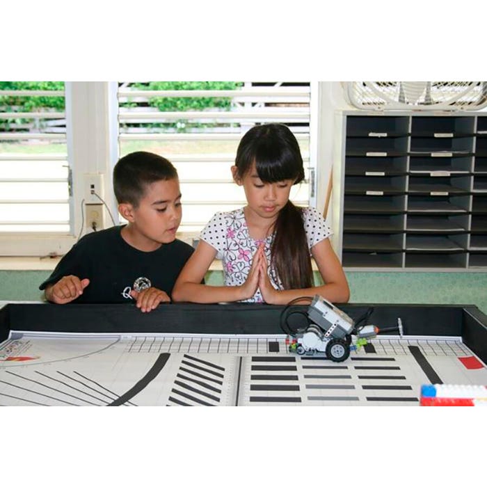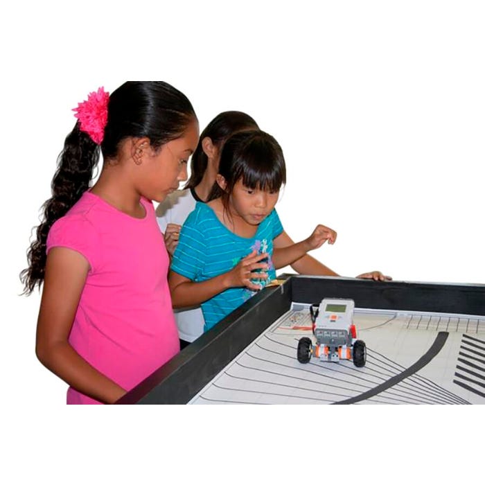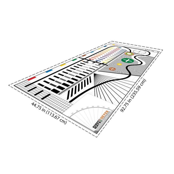 This robotics mat contains every element present in a variety of challenges. Features include varying types of lines, counting blocks in widths and contrasts, a variety of targets, interfering backgrounds, side blocks, aiming compasses, and a 70-inch ruler (in US and Metric). Teaches skills such as line following, color sensing, turning, and more. Ideal for a quick and quality solution for teaching students robotics and coding. Easy to use on the floor or on a table, you no longer need to create your own course or place electrical tape on the floor. General practice mat ideas include: basic drive straight, basic accurate turns, combined straight and turn, basic line counting, and light/color sensor. The mat measures 44-3/4 W x 92-3/4 L inches.Features