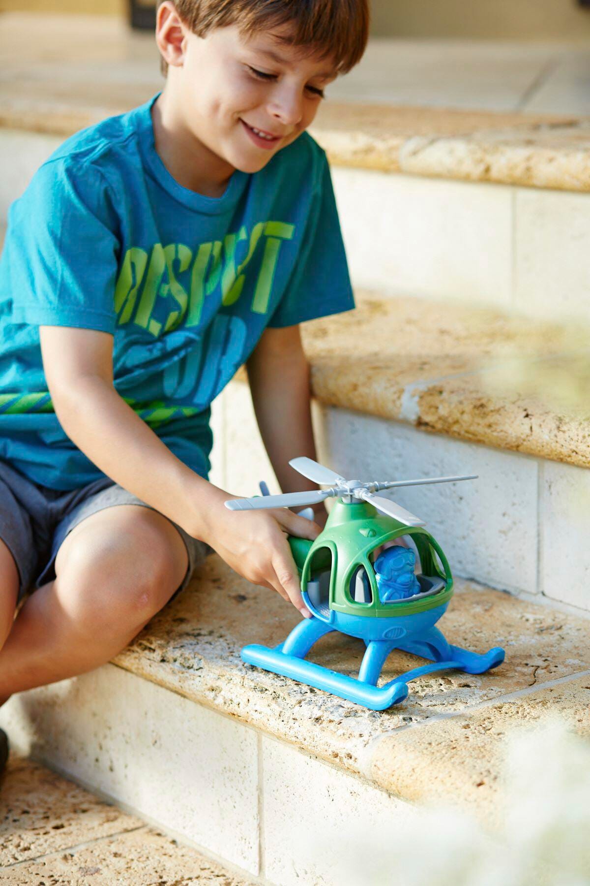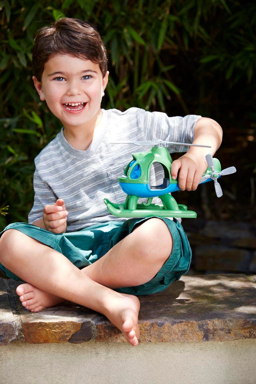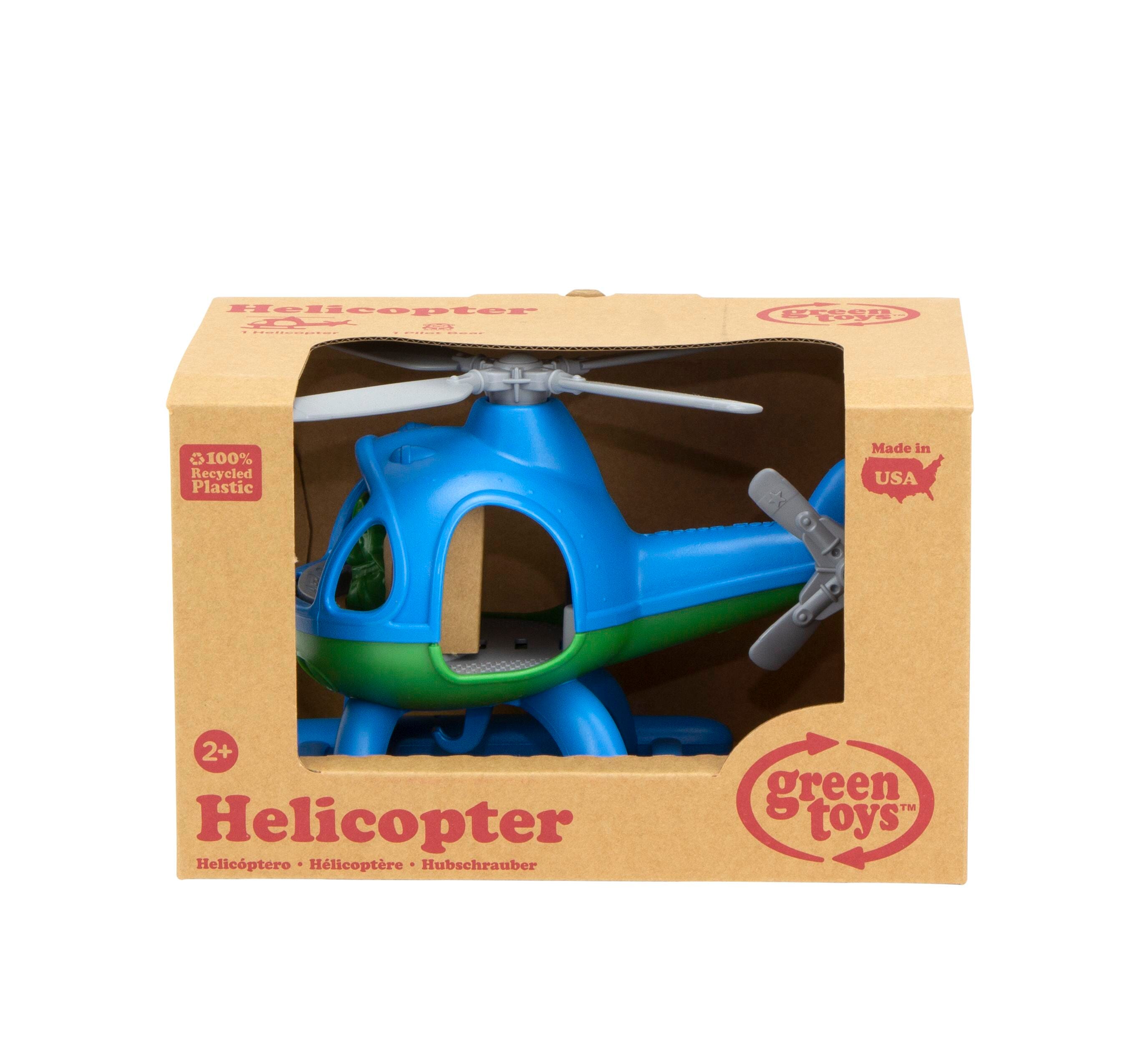 This eco-friendly chopper is made in the USA from 100% recycled plastic that saves energy, reduces greenhouse gas emissions, and features two spinning rotors and sleek skids on the bottom for easy landings. The Helicopter includes a pilot bear figure that fits perfectly in the spacious cockpit that's complete with a full dashboard and the Green Toys' signature 8-track.
