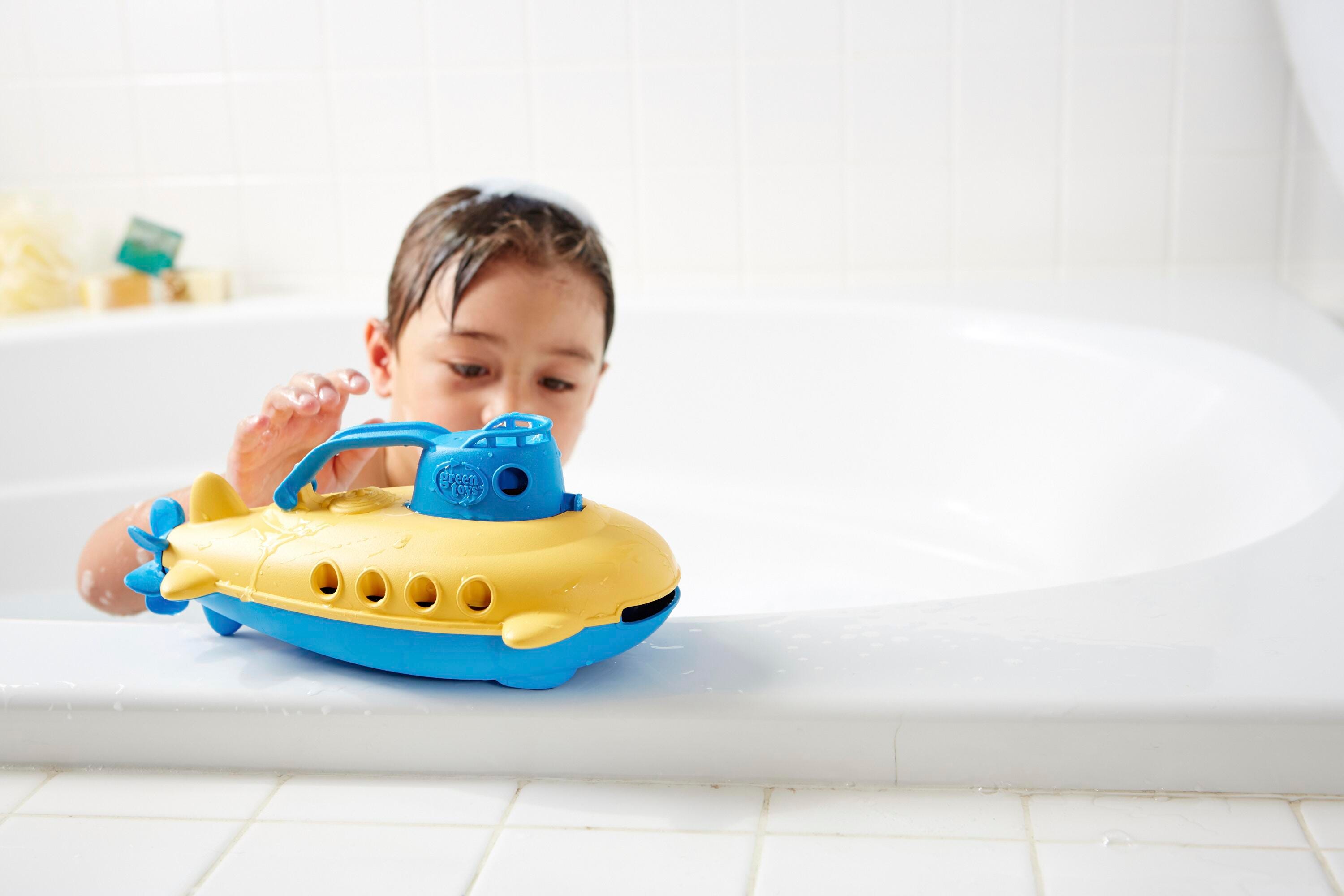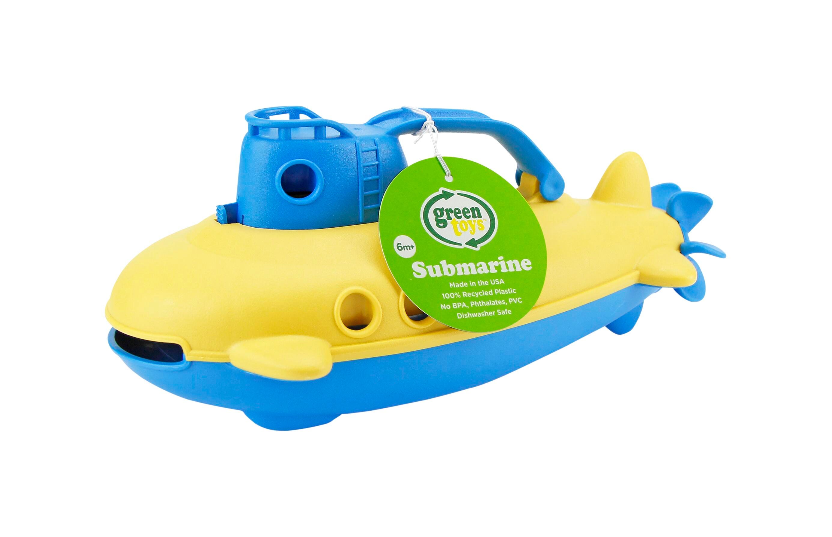 Submerge it underwater to explore the terrain at the bottom of the tub, and let it resurface to scan the horizon in search of the next earth-friendly adventure. This sturdy watercraft features a spinning rear propeller, a flat bottom for added stability, and the classic handle and wide-mouth opening combination for plenty of scoop-and-pour fun. The cabin can be opened for easy cleaning and was created without BPAs, phthalates, PVCs, or external coatings, and also meets FDA food contact standards. Packaged with recycled and recyclable materials and printed with soy inks. Recommended for ages 6 months and up. Dimensions are 10.5 L x 5.5 W x 4 H inches.Features