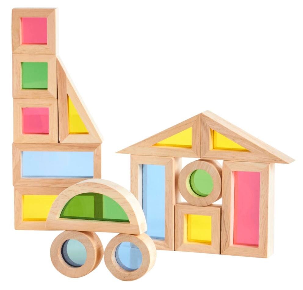 Each rainbow block is constructed with a sturdy wooden border and a colorful, nearly transparent acrylic insert for a fun and aesthetic building experience. Blocks have straight edges for easy stacking and are one-third smaller than the unit block size. These Jr. Rainbow Blocks are a new challenge in creating structures and extending traditional block play. Smooth hardwood frames with inset, colorful, transparent acrylic windows are also ideal for color exploration and light table activities. Includes 20 pieces. For a larger sized set, see Unit Blocks items 1597185, 1597186, 1597187, 1597188, or 1597189.Features