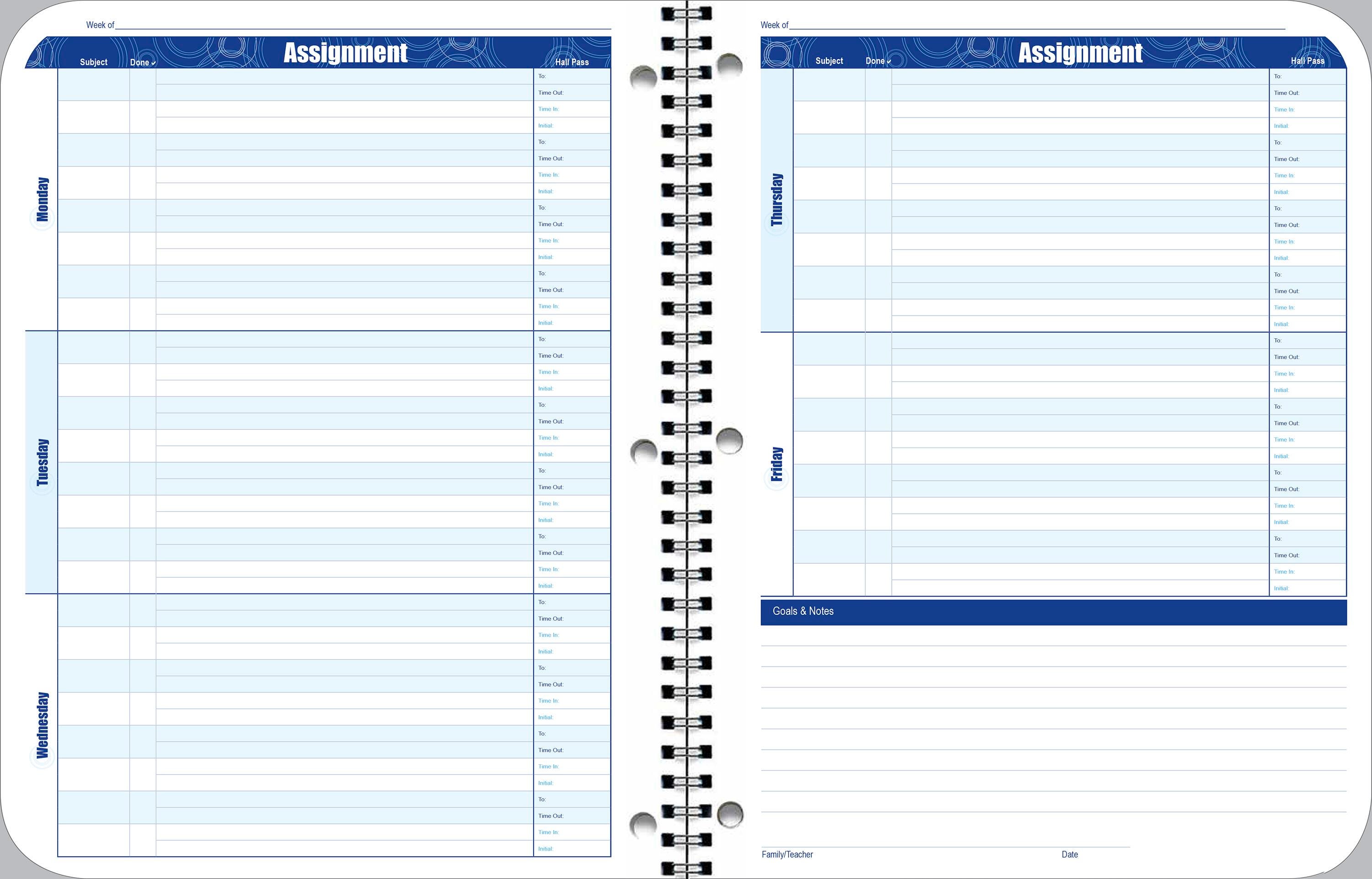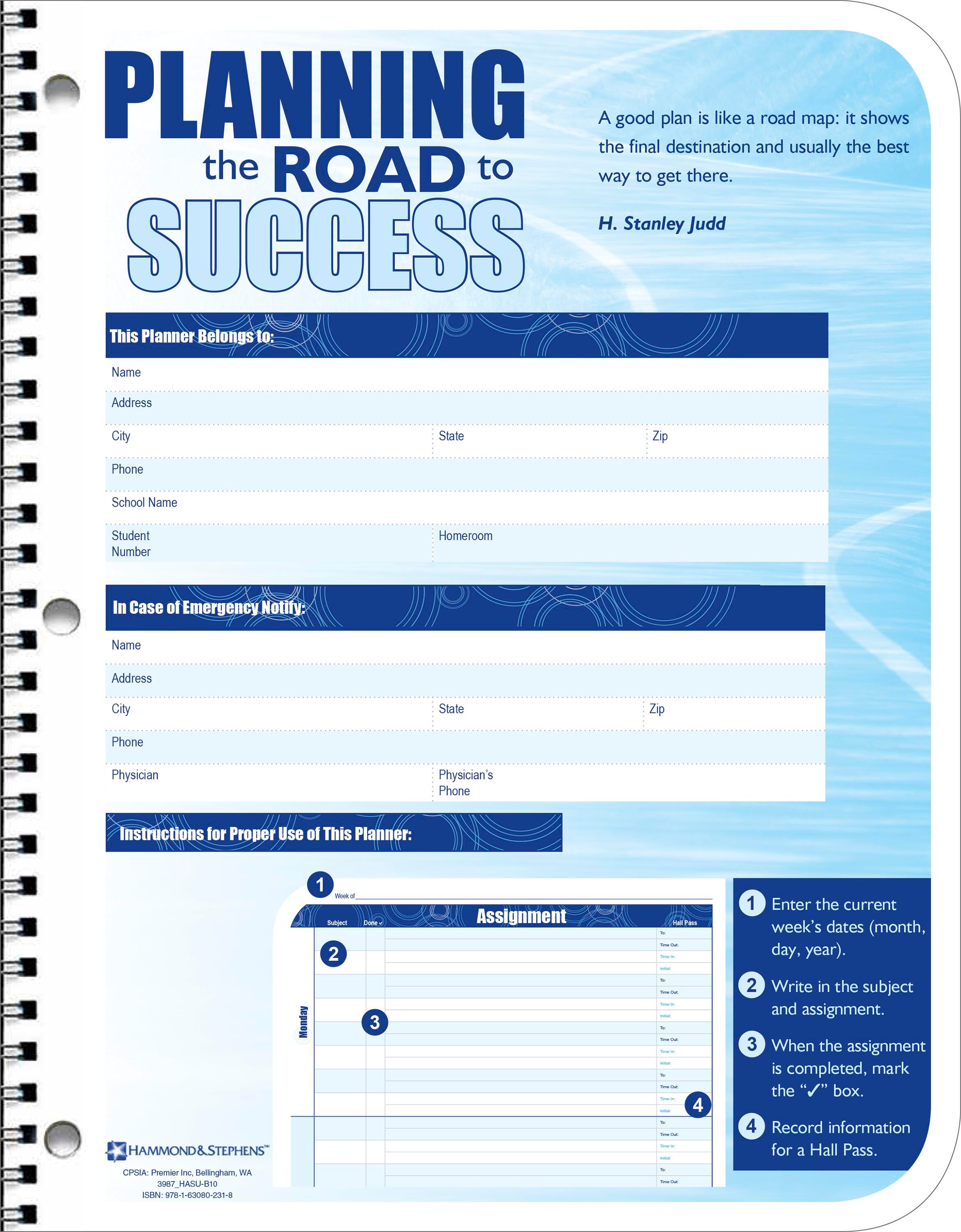 Hammond & Stephens Weekly Student Planner helps students make a habit of recording homework assignments to show them the basics of planning and organization; thus giving them foundational tools to help them learn effectively. Includes a two-page-per-week calendar format, eight subject areas, a hall pass column, and notes that is bound by a wire coil. Features 96 pages.Get additional product information – Download Sample Pages