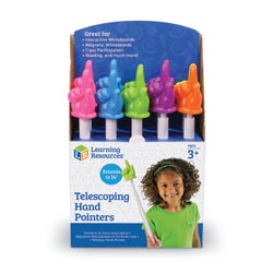 Learning Resources Telescoping Hand Pointers are whimsical pointers that generate positive behavioral support and make students eager to participate. Use with whiteboards, pocket charts, maps, and more. Colorful hands are easy to see against whiteboards! Extends from 10-1/2 L to 24 L inches. Ages 3 and up. Set of 10 assorted color pointers.Features