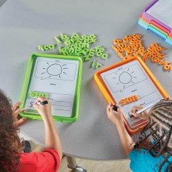 - Double-sided write-on/wipe-off Activity Mats cover letter and sound recognition and develop beginning world-building and phonics skills