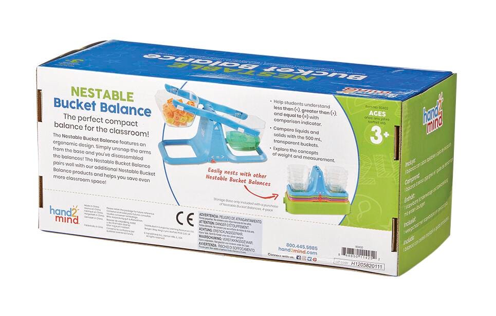 Nestable Bucket Balance encourages children to explore measurement and weight and features an efficient, compact design. Equivalency markings allow students to assign less than, greater than, or equal to symbois to their balance setup so they can demonstrate mass equivalency.- CHOKING HAZARD! Small parts. Not for children under 3 years.
