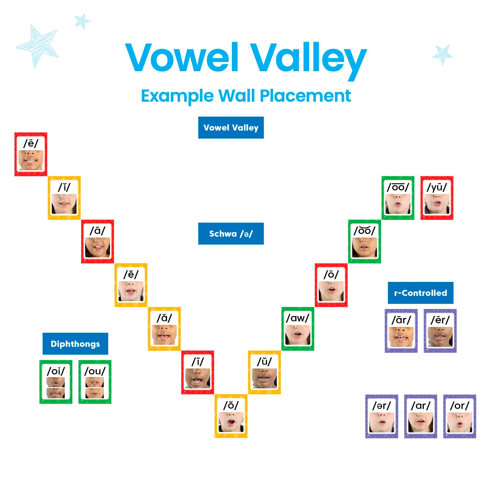 Vowel Valley header cards cover diphthongs, schwa*, and r-controlled