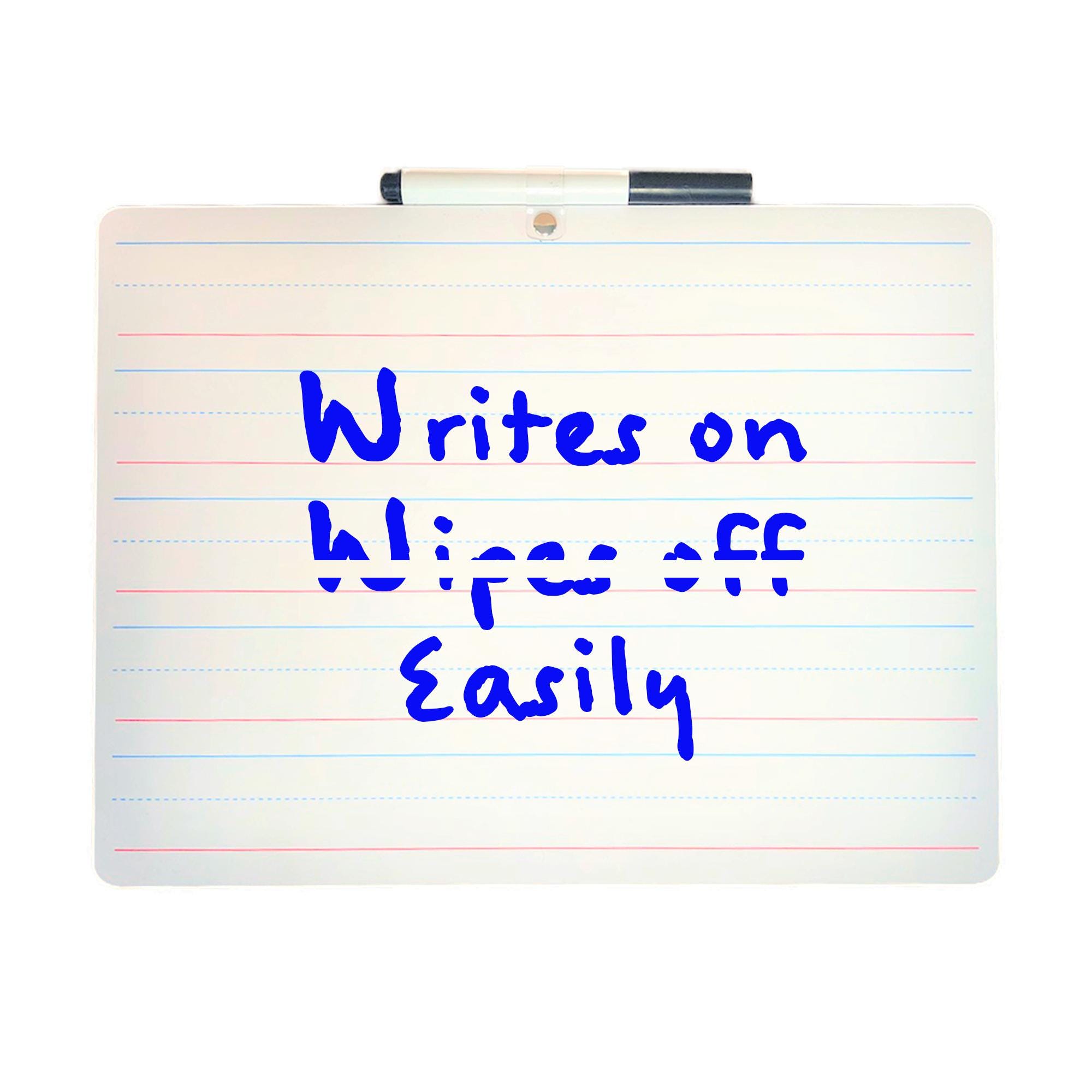 Two-sided Dry Erase White Boards are great for teaching and practicing fundamentals at the early learner stage. Bright white boards have one surface that has a plain white dry erase surface. The other side contains 5 sets of blue headline and broken mid-line plus red baseline format. Each line set measures 1-1/8 inches with 3/8 inch of blank descender space between sets. Boards measure 9 x 12 inches.Features