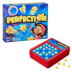 Fit shapes fast and beat the blast with this Perfection game. You've only got so much time to get all of your pieces in the tray before the time is up. If you're the first to match them all you win! Watch out of the pop when the timer stops. If you're not done, your pieces pop out. Includes 9 fun shapes.Features