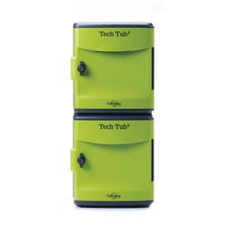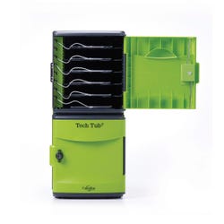 The premium Tech Tub2 is made from durable, high-impact ABS plastic and has 10 port USB hub that syncs and charges iPads. Ventilation holes throughout the case prevent heat build-up. There are two ergonomic handles on the door and back as well as a flip-up handle on the top. The adjustable shelves accommodate devices with and without cases. To keep cords and adapters tidy, there is an easy-to-use side cable organizer and lower compartment. Cable hooks are on the back to manage the cord during transport. To secure the tub to a surface, there is mounting hardware. Tub has a 3-point lock and comes with 2 sets of keys. Please note, this Tech Tub is not compatible with 8th Generation iPads. For an iPad 8 charging solution, please purchase item# 2087480.Features