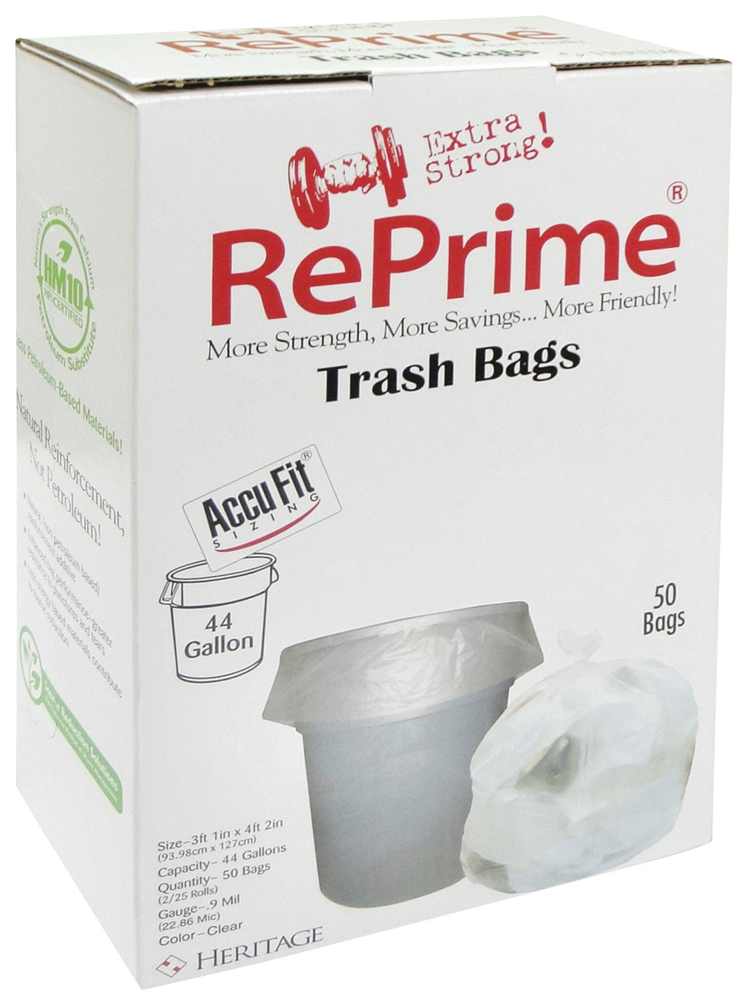 These trash can liners feature Accufit sizing so they fit perfectly into common cans with no excess plastic and no falling completely into the container. Each can liner holds up to 55 lb. or 44 gallons and offers a 0.9 mil thickness. Bags are designed for use in Rubbermaid 44 gallon waste containers (2643). Premium-quality prime resin resists tears and punctures. Can liners include a natural, (nonpetroleum-based) reinforcement additive so less plastic goes into landfills. Case of 4.Includes: