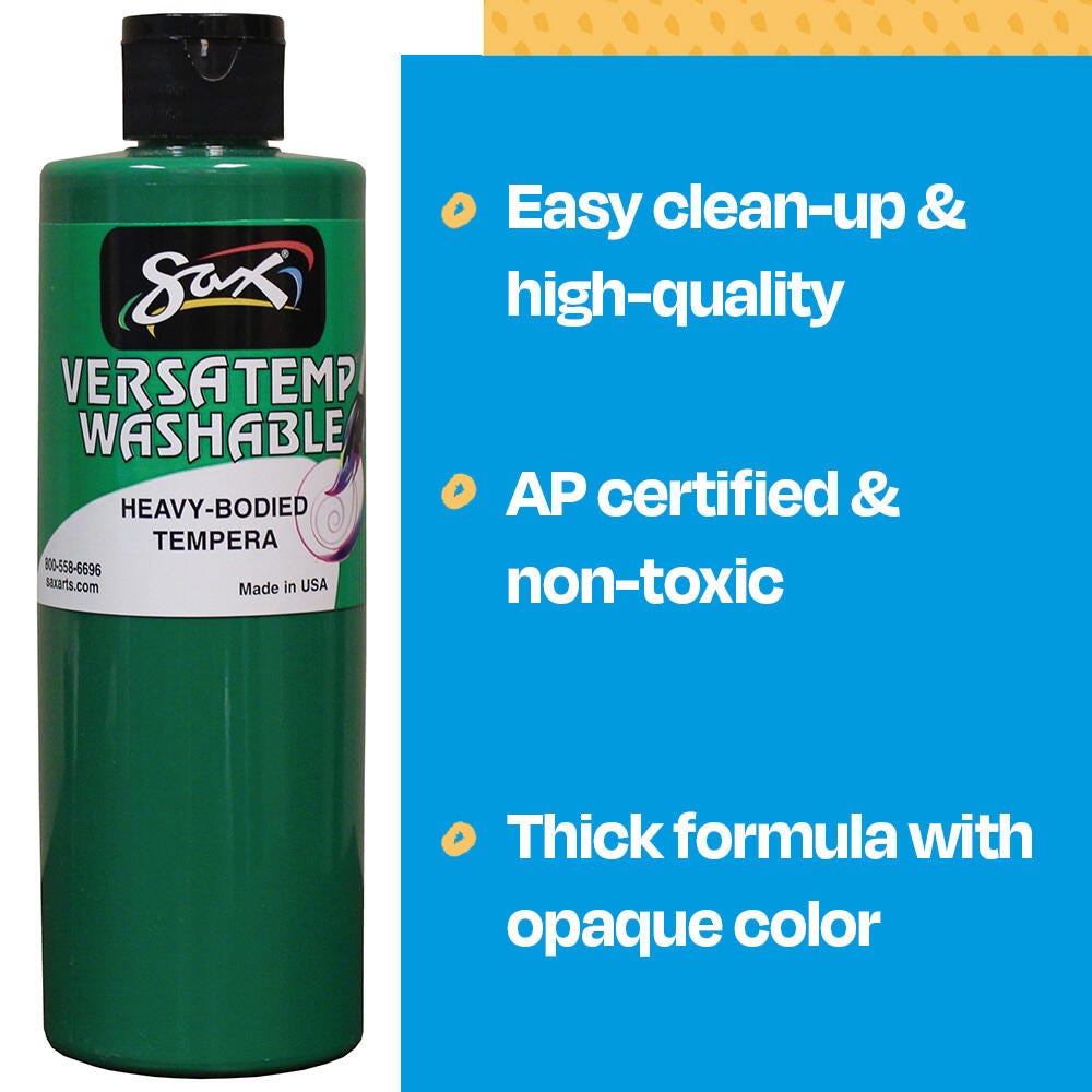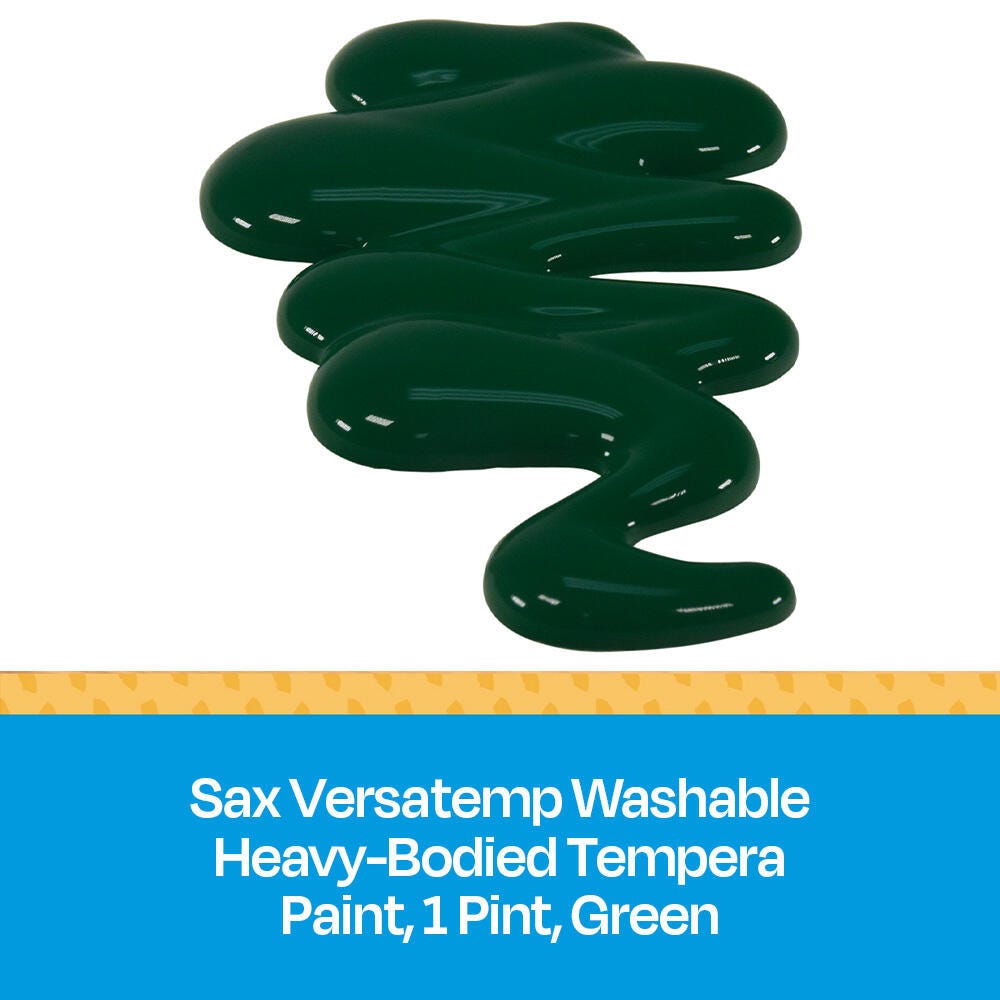 Sax Versatemp washable heavy-bodied tempera paint in a green color crafts bold, vibrant color with a mess-free formula. Foster creativity with a paint that enables more fun and easier cleaning for children and adults. While most kid-friendly formulas lack pigment strength, our formula provides a stronger pigment load with a heavy, creamy consistency. This painting medium comes in a convenient pint bottle for effortless handling, pouring, storing, and sharing in the classroom. Complete school projects, art lessons, and signs with one shade or create new hues by mixing and matching colors.