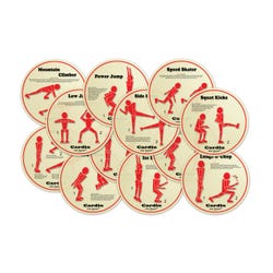 HotSpots Cardio Spots measuring 8-1/2 inches are placed on the floor and participants perform the cardio exercises featured on the spots. They are used as station routines or used to get both small and large groups active for warm-ups. Molded vinyl spots with 1/8 inches of thickness are ideal for developing strength, flexibility, social skills and more. Set includes 12 Cardio Spots.