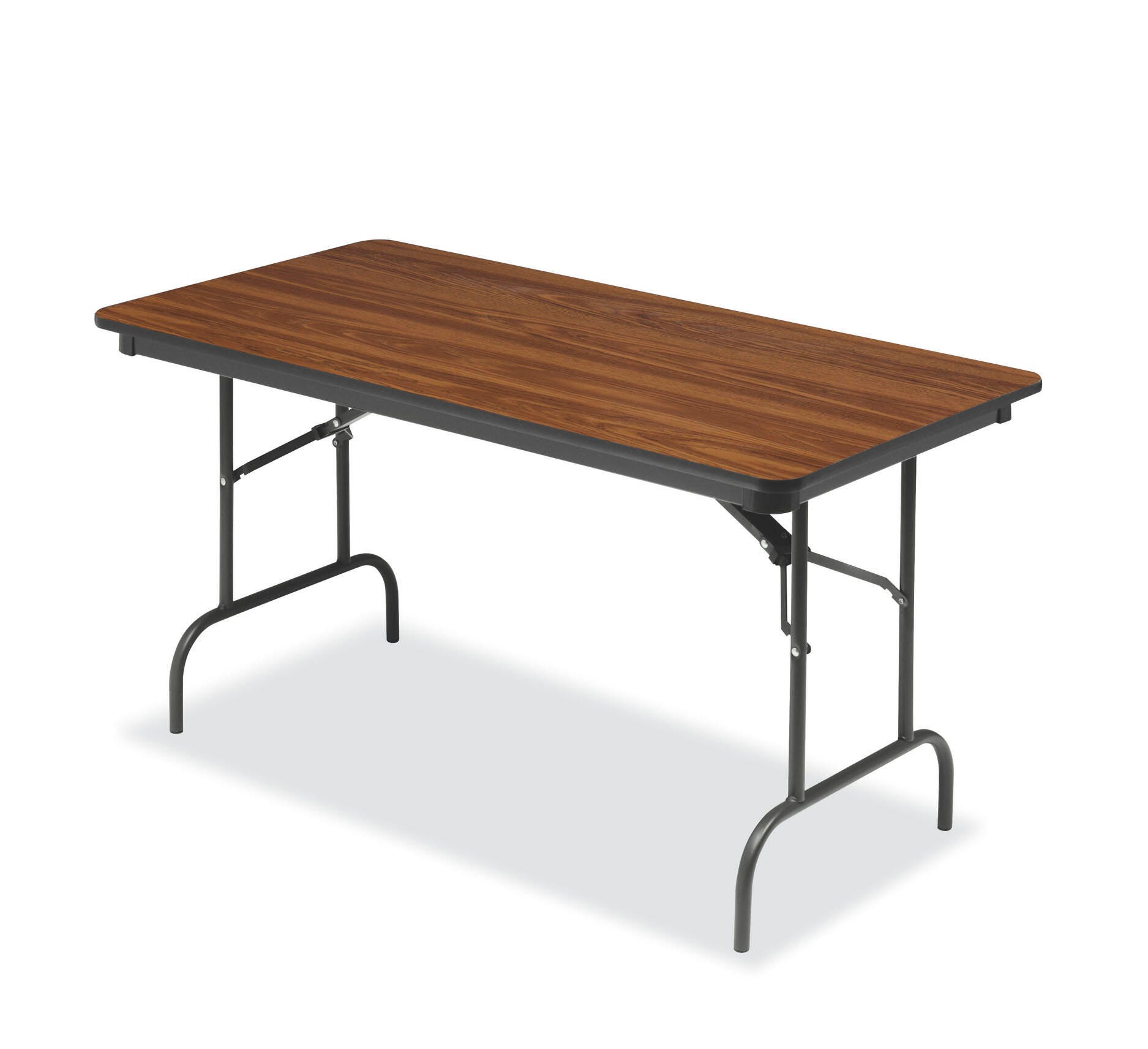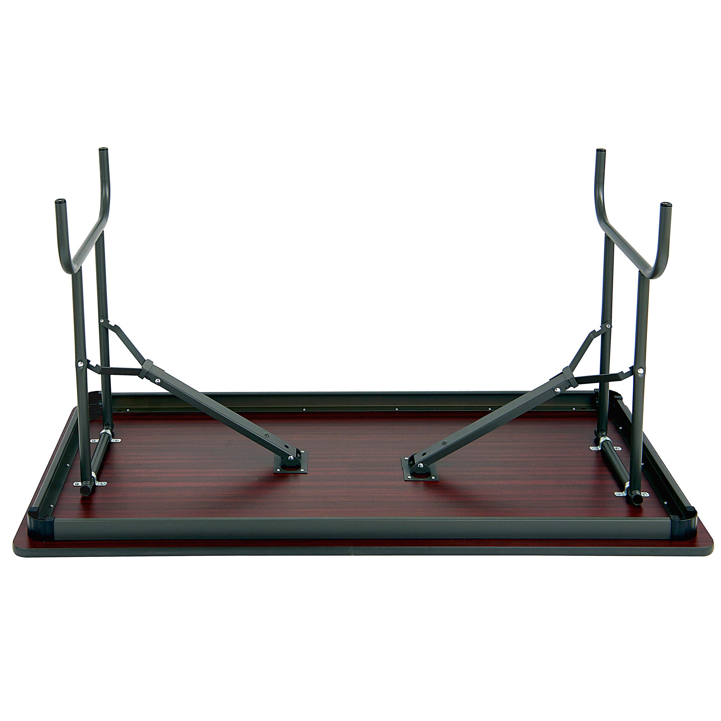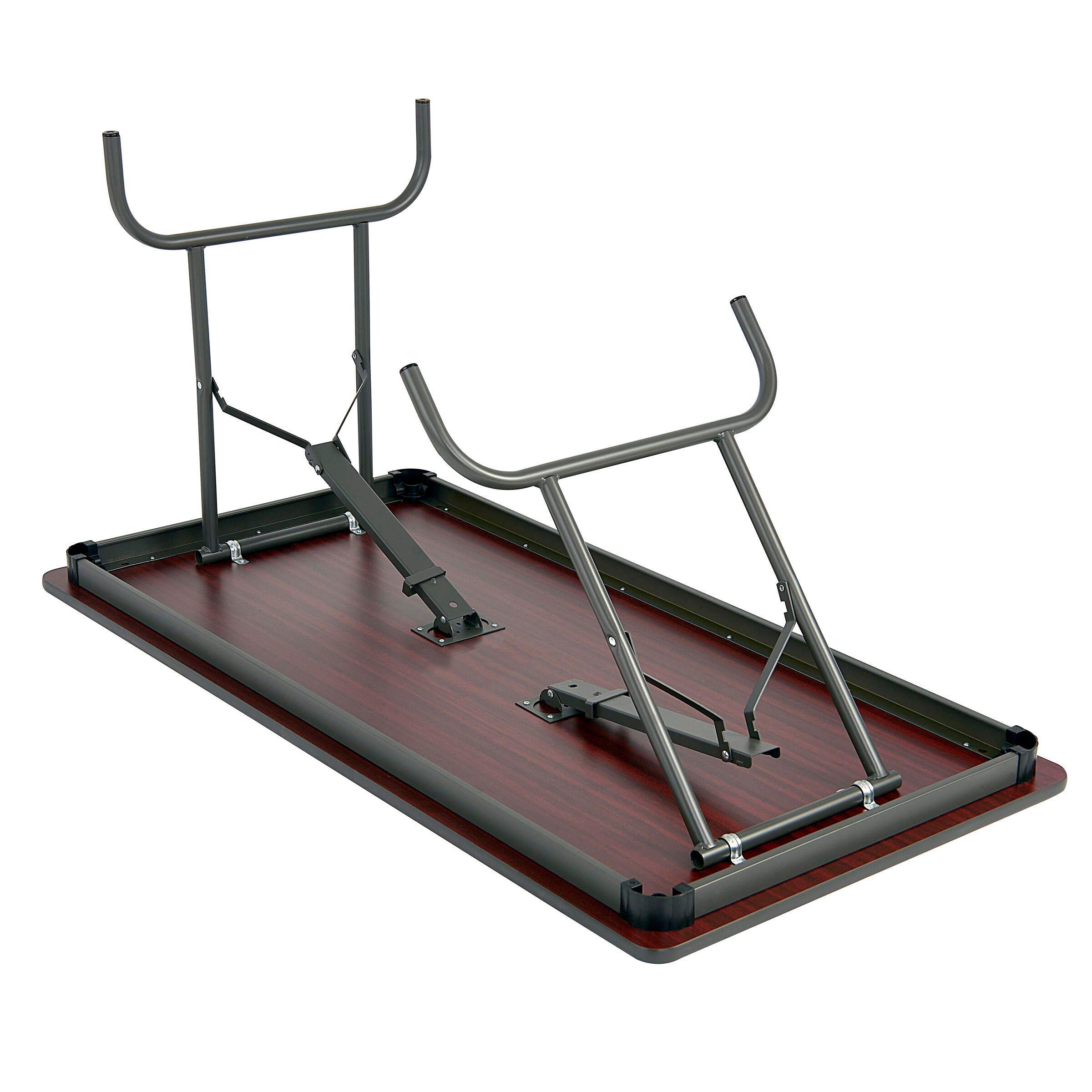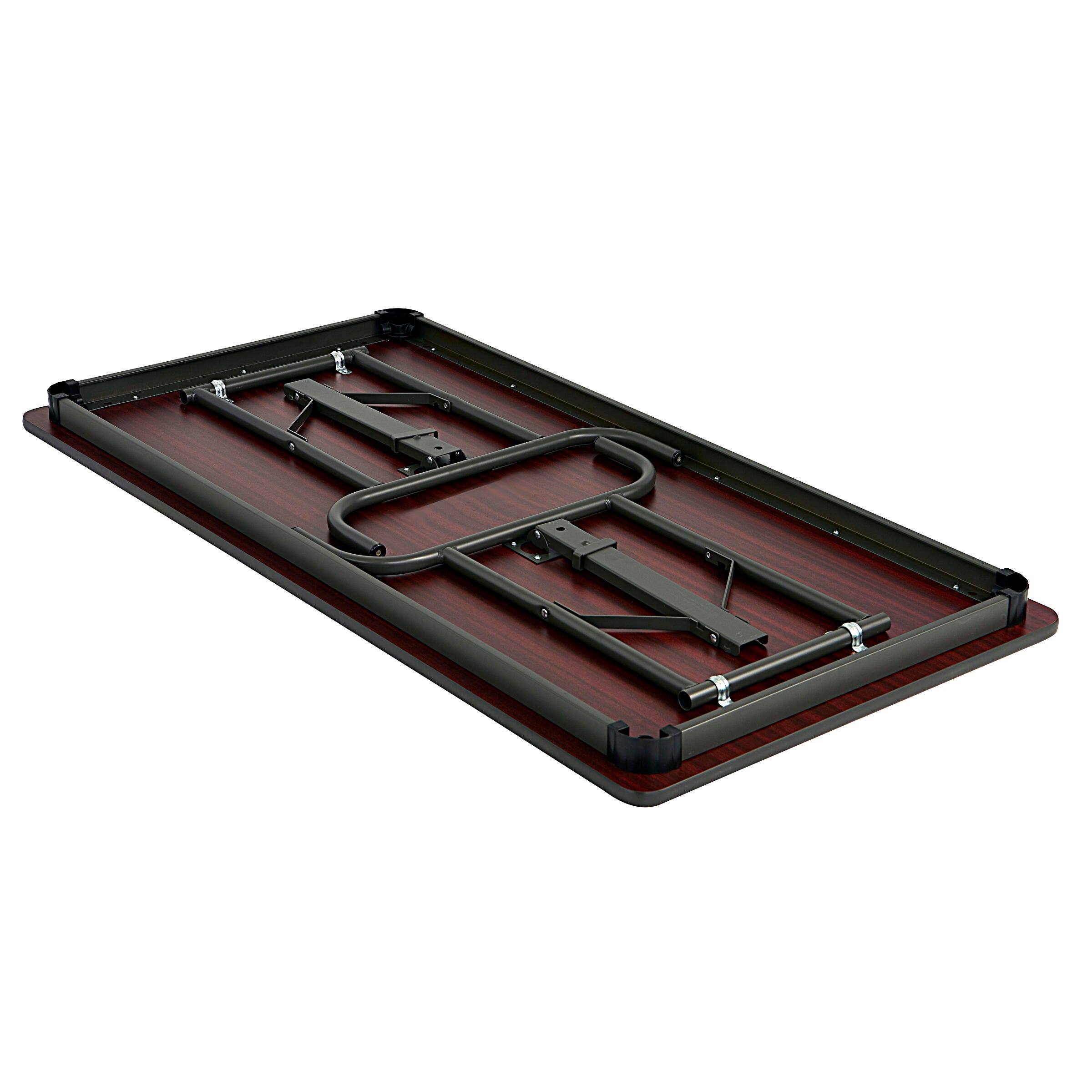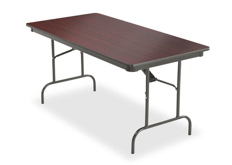 This sleek multipurpose table expands the workspace in the office and provides extra seating in schools, banquet halls, homes, and cafeterias. The perfect balance between the sleek traditional wood laminate table and a convenient stowaway pop-up table. Made with high-performance standards in mind, strong and durable enough to withstand high-traffic and dynamic spaces. The wear-resistant, melamine laminated, 3/4-inch surface features a sealed underside that repels moisture and resists hot and cold temperatures. Available with a black steel frame, black edge color, and varying top colors: Gray, Mahogany, and Oak. Please select the top color that best fits your space when ordering.