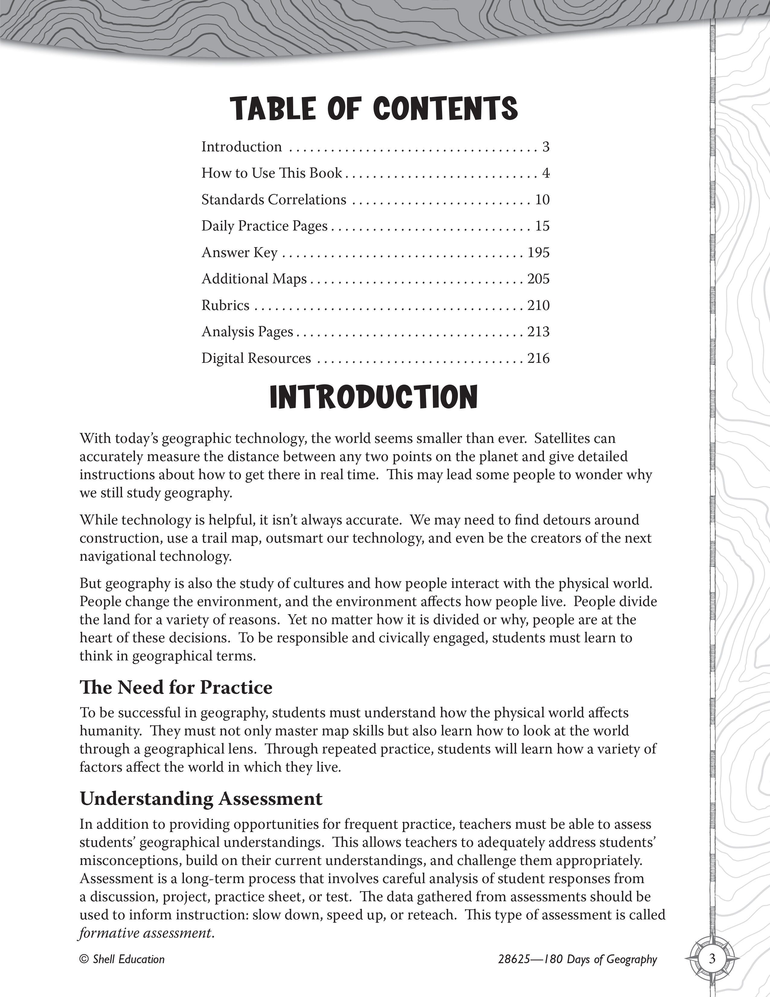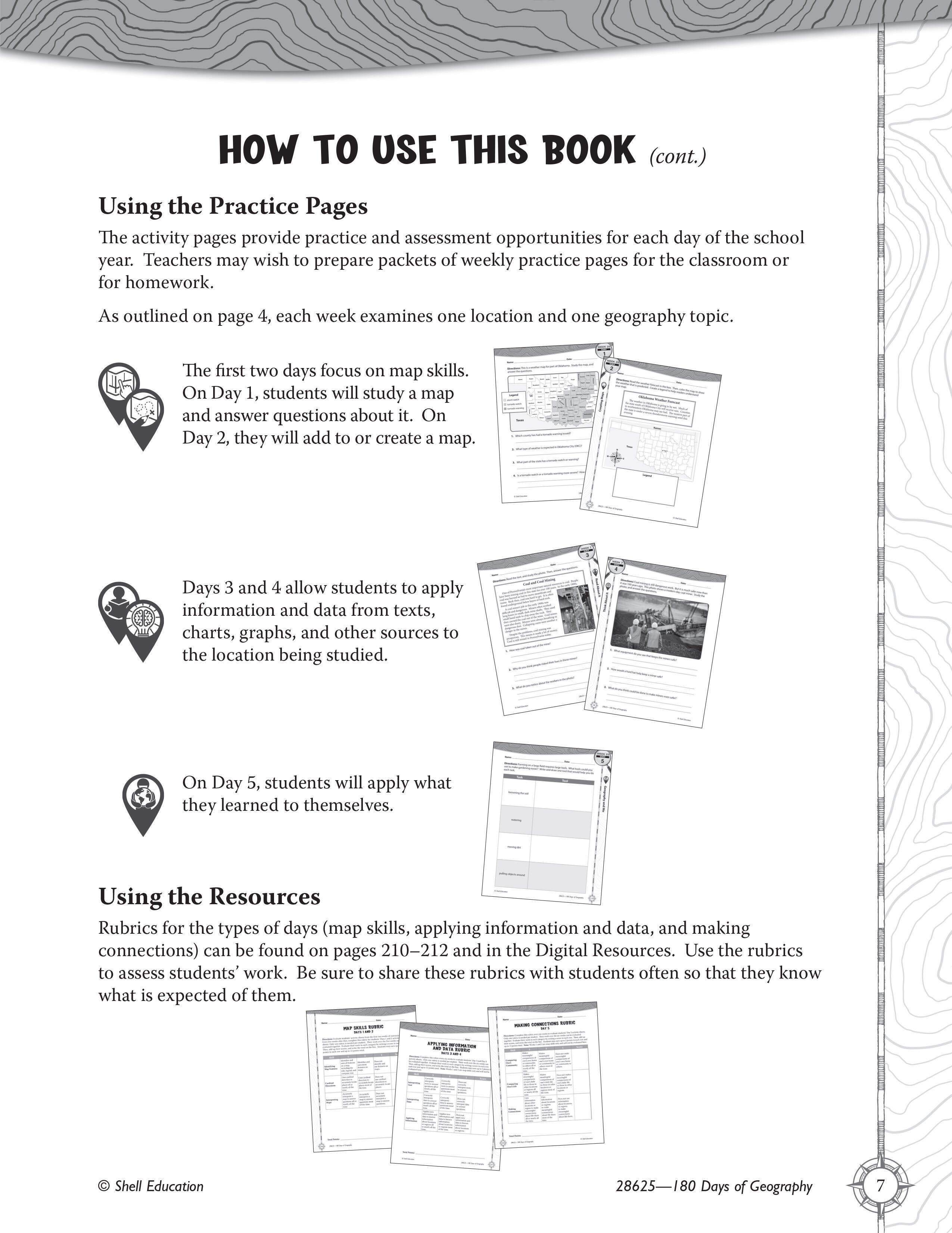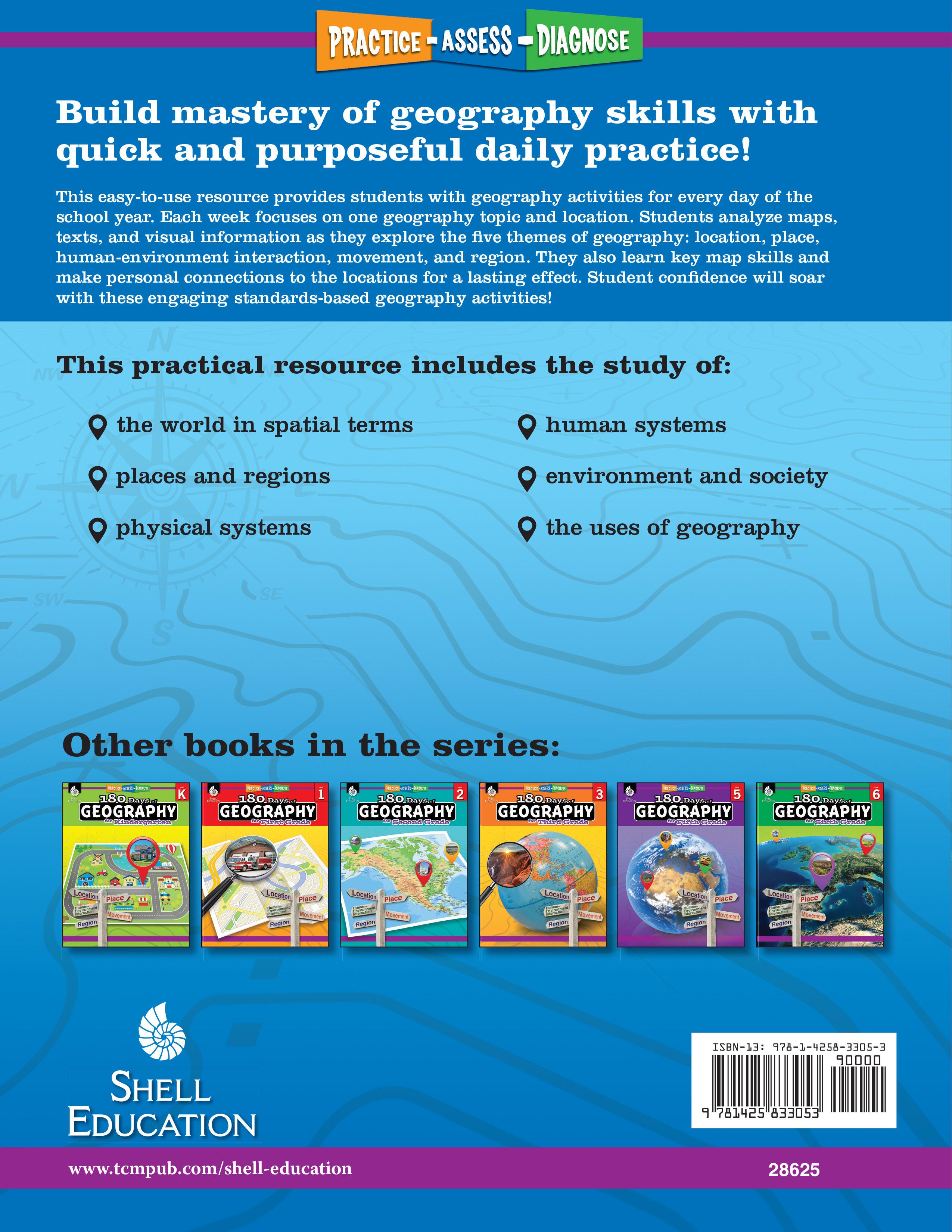 Through these weekly units in 180 Days of Geography, students will improve their geographic background knowledge, critical thinking and reasoning skills, map and spatial skills, and answer photo and text dependent questions. This essential social studies resource provides teachers with the tools they need to provide detailed instruction on map skills, key geographical concepts, and the five themes of geography: location, place, human environment/interaction, movement, and region. With the world becoming more connected, learning about different places through a geographic lens will equip 21st century students with the skills they need to better understand diverse cultures and regions in an increasingly interdependent world. An introductory two-week unit focuses on teaching the map skills that students will use throughout the rest of the book. Subsequent units will introduce students to a new place or a type of map, and will explore the relationship between geography and culture.