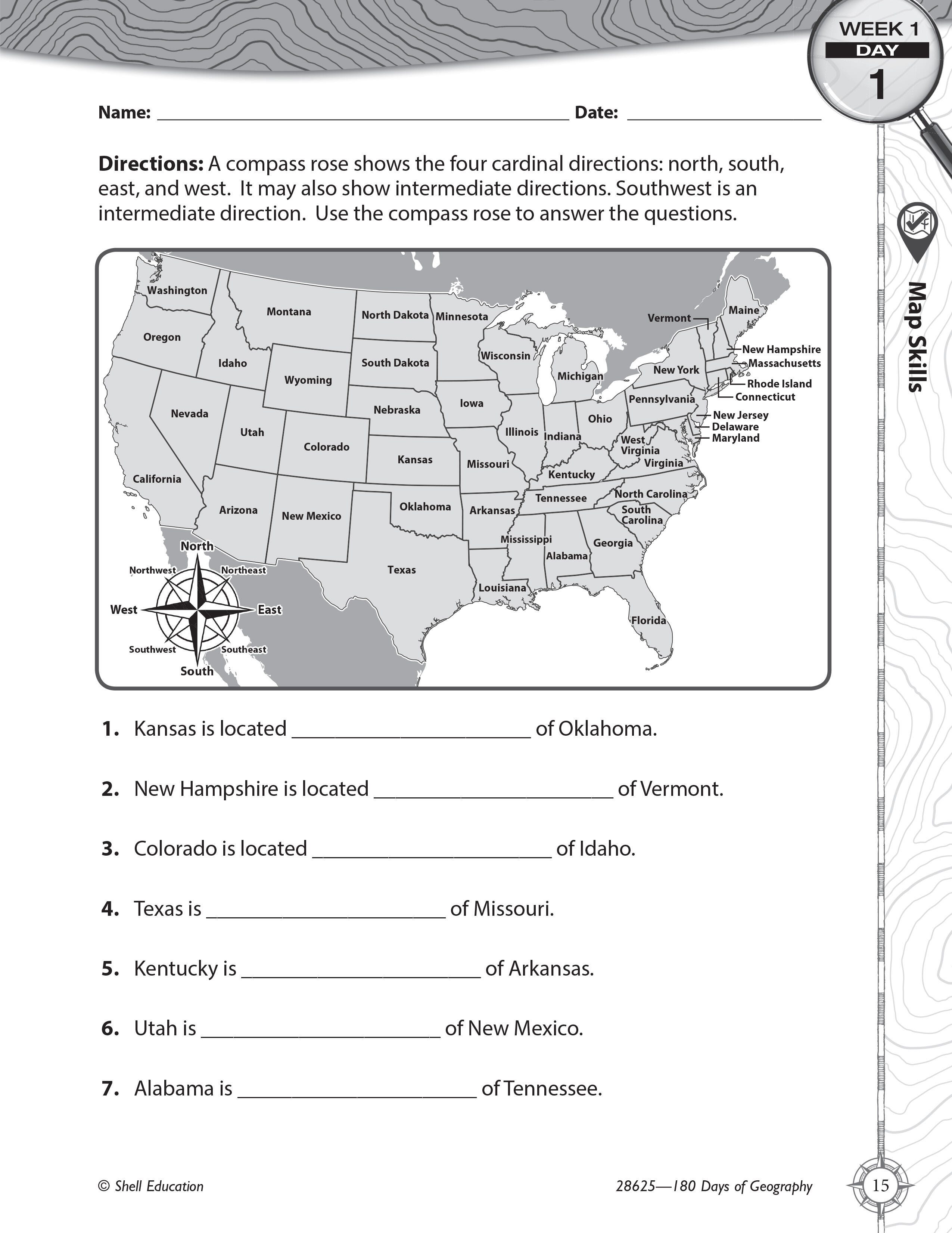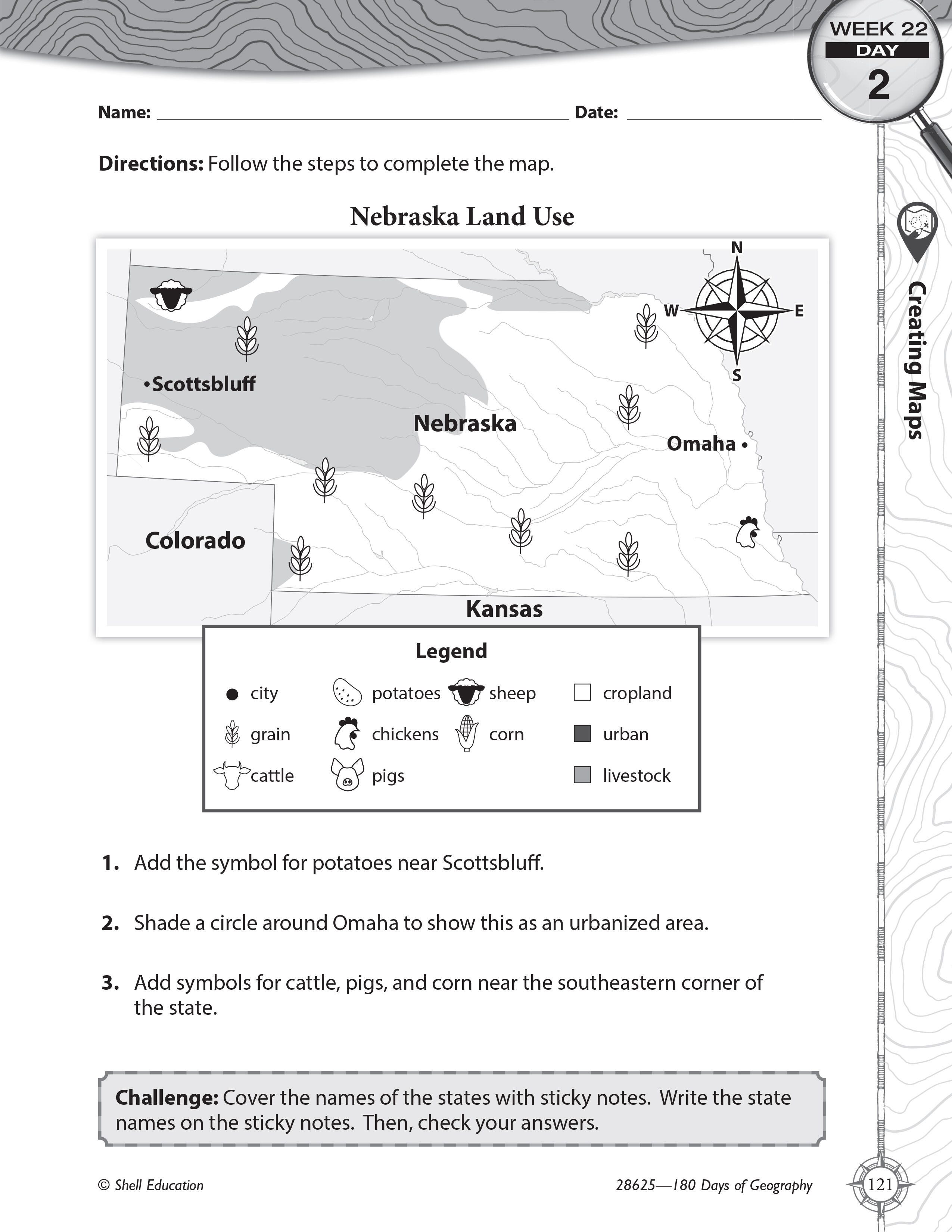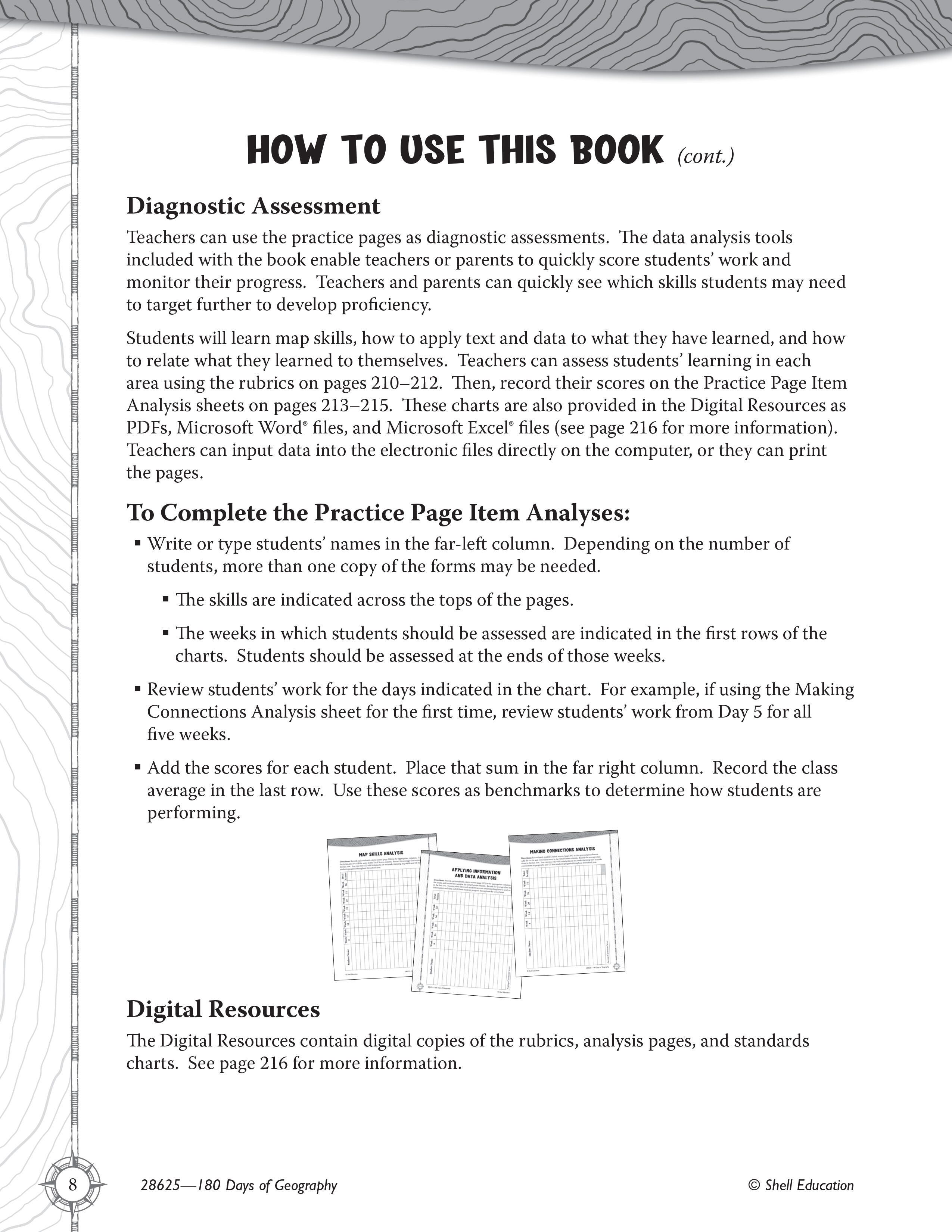 Through these weekly units in 180 Days of Geography, students will improve their geographic background knowledge, critical thinking and reasoning skills, map and spatial skills, and answer photo and text dependent questions. This essential social studies resource provides teachers with the tools they need to provide detailed instruction on map skills, key geographical concepts, and the five themes of geography: location, place, human environment/interaction, movement, and region. With the world becoming more connected, learning about different places through a geographic lens will equip 21st century students with the skills they need to better understand diverse cultures and regions in an increasingly interdependent world. An introductory two-week unit focuses on teaching the map skills that students will use throughout the rest of the book. Subsequent units will introduce students to a new place or a type of map, and will explore the relationship between geography and culture.