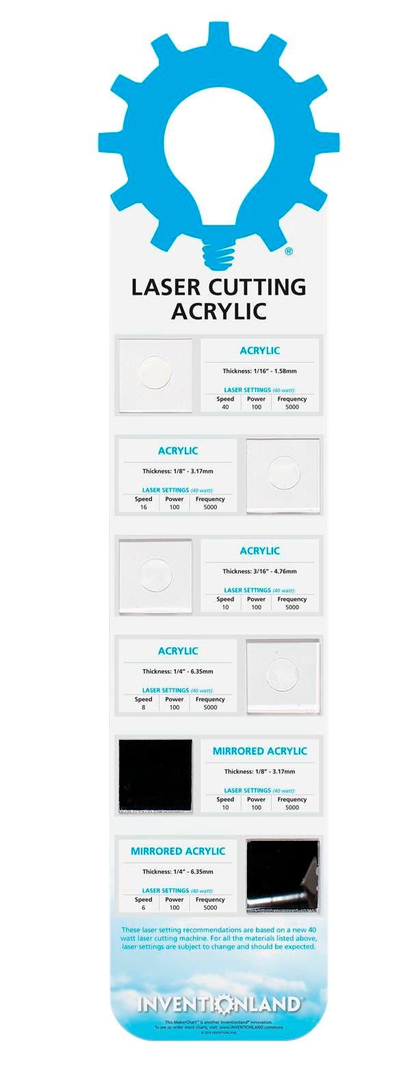 Laser cutting charts keep makerspaces moving efficiently. No more questions on how to dial in proper settings for machines based on material and gauge.Features