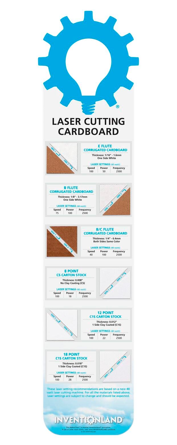 Our laser cutting charts keep makerspaces moving efficiently. Best if they are hung by laser cutters. All of our laser cutting charts include material samples.Features