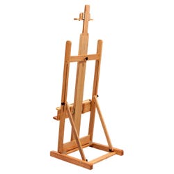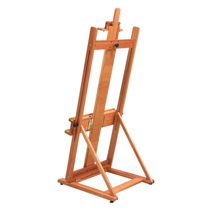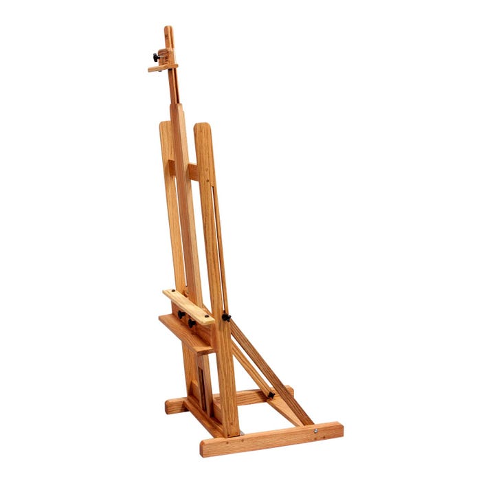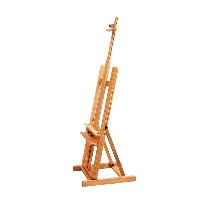 The sliding mast moves independently of the painting tray, offering artists a greater variety of settings in which to work. By extending the mast to its highest point and leaving the painting tray in its lowest setting, artists are able to work on very large canvases. Alternately, by moving the mast to its lowest setting, especially where ceiling height is a concern, artists can work both sitting and standing allowing for great versatility. With its H-frame construction and quad base, this easel offers great stability for working seated or standing. A slide and lock system adjusts the height.Features