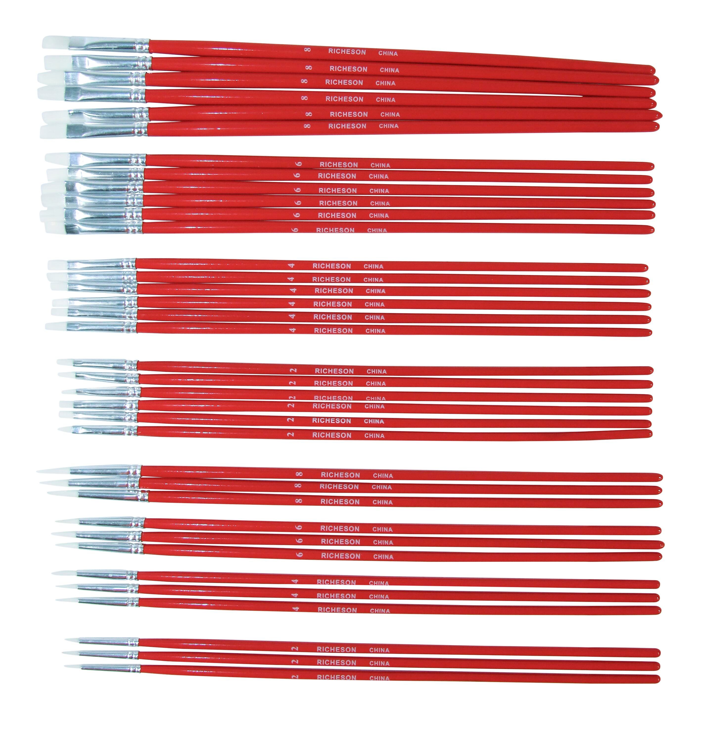 Jack Richeson Oil and Acrylic Brush Classroom Pack is economical and superior quality, long-handled enameled brushes with white synthetic fibers that are perfect to use with oil and acrylic paints. Brush sold as pack of 36 includes 24 brights with 6 each of sizes 2, 4, 6, 8 and 12 rounds with 3 each of sizes 2, 4, 6, 8.Features