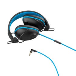 Great for older kids with a large, over-ear design, the new JBuddies Pro offers the ultimate focus for home or school. Provides all day comfort with Cloud Foam ™ cushions and Form Fit ™ earcups and ear safety with a volume regulator in the earcup to stop sound at 85 decibels or toggle up to 95 decibels for louder environments. A tangle free braided nylon cable includes a universal microphone and track control that is compatible with Android + Apple. Compact, adjustable headband fits growing kids from ages 8 to 16. Folds easily for storage and travel, and durable to handle on the go moments.Features