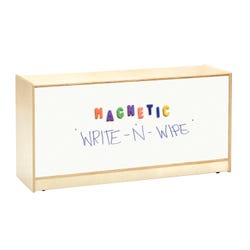 Generous storage at a child's height. Twenty-five clear Cubbie-Trays on one side, and eight open storage sections on the other side. Secure the hasp when needed. Each section is 48 W x 15 D x 35-1/2 H inches. Opens to eight feet. Magnetic write-n-wipe back.