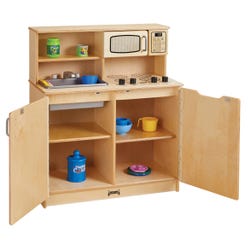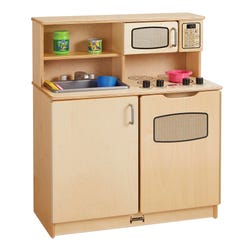 A stove, sink, cupboard, and microwave combined into an attractive kitchen center – perfect for the budding chef. Features like the four "burner" stove, wooden turn-button controls, and button display on the microwave makes for realistic play. Kids can learn the importance of cleaning up after they cook with a laminate finish encouraging them to keep it spotless. Counter is 23.5" high.Features