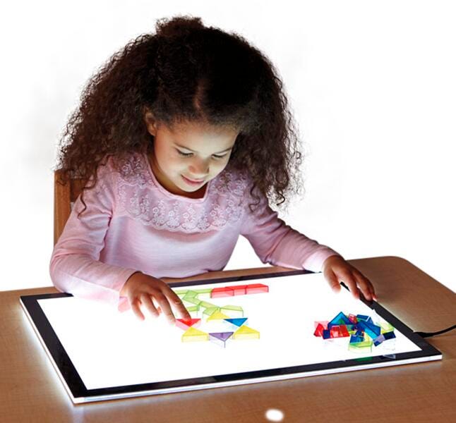 Super slim Illumination Light Tablet opens up a new world for curious minds. Easy to set up and store-simply set it on a tabletop, plug it in, and turn it on. LED lights are adjustable and provide even lighting. Excellent for tracing, Prism Bricks, x-rays, leaves, or other translucent items. The large surface fits up to 11 x 17 paper and includes MM/ CM markings. Includes UL/cUL listed AC adapter that plugs into a standard 110 volt wall outlet. Measures 19 W x 14-1/2 D x 1/2 H inches.
