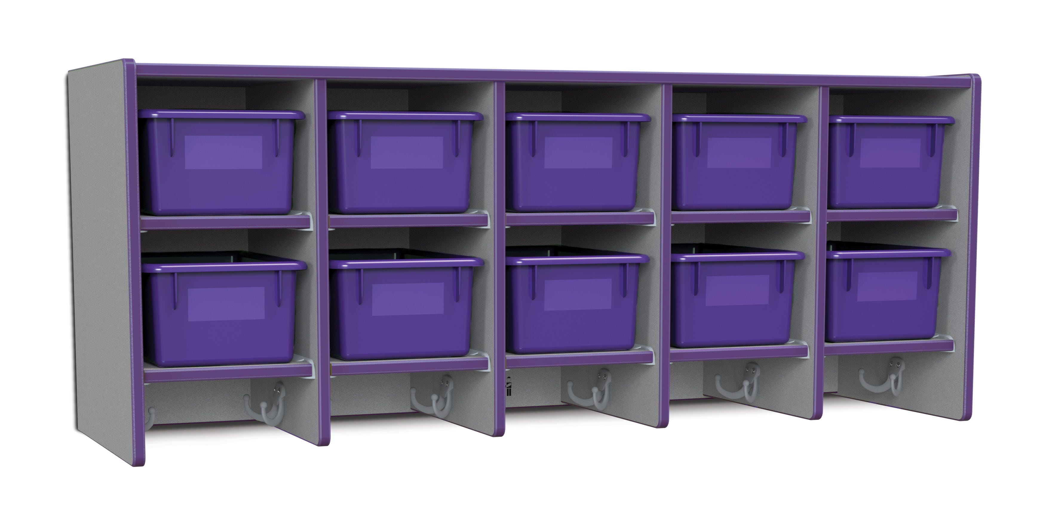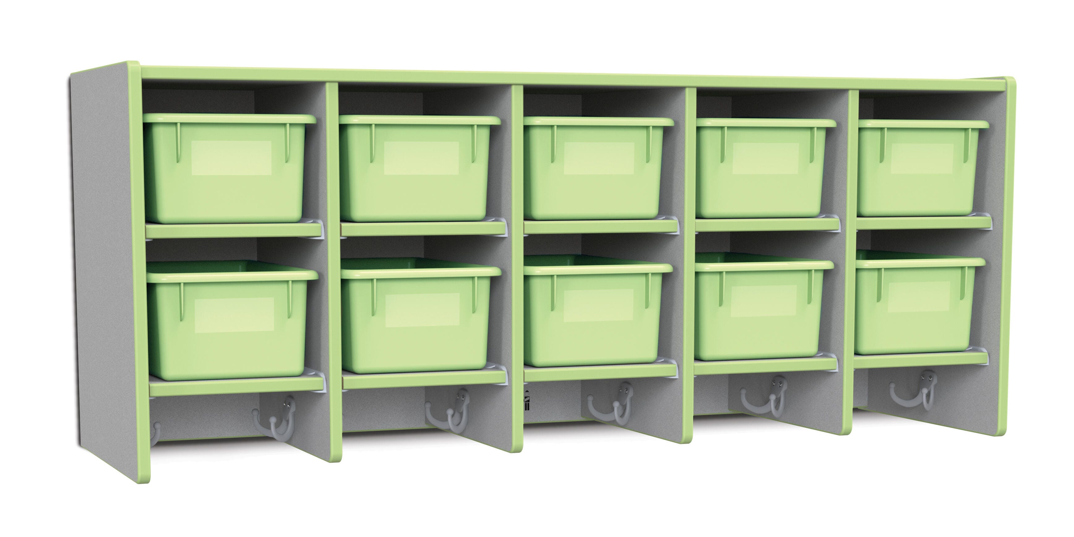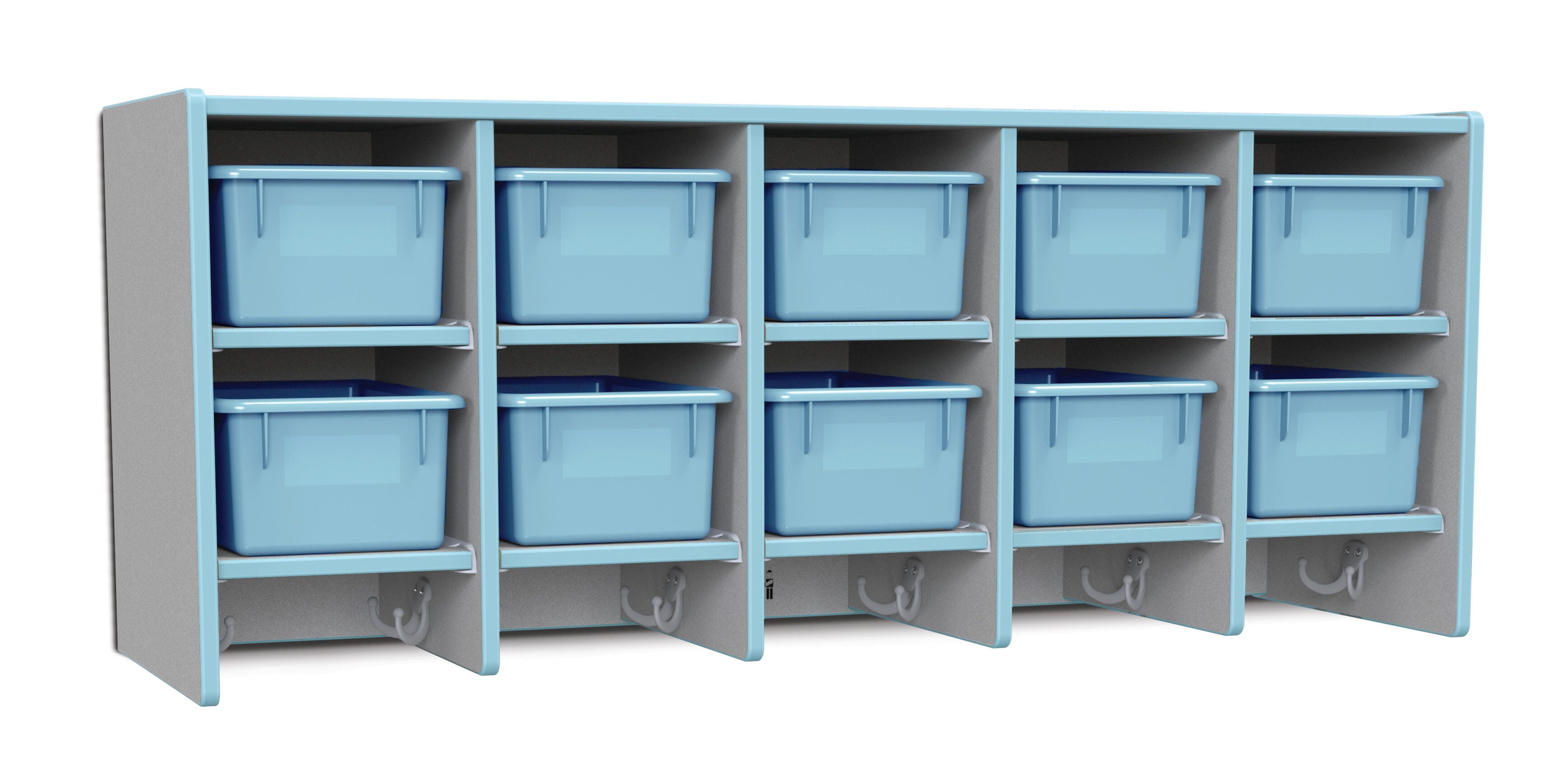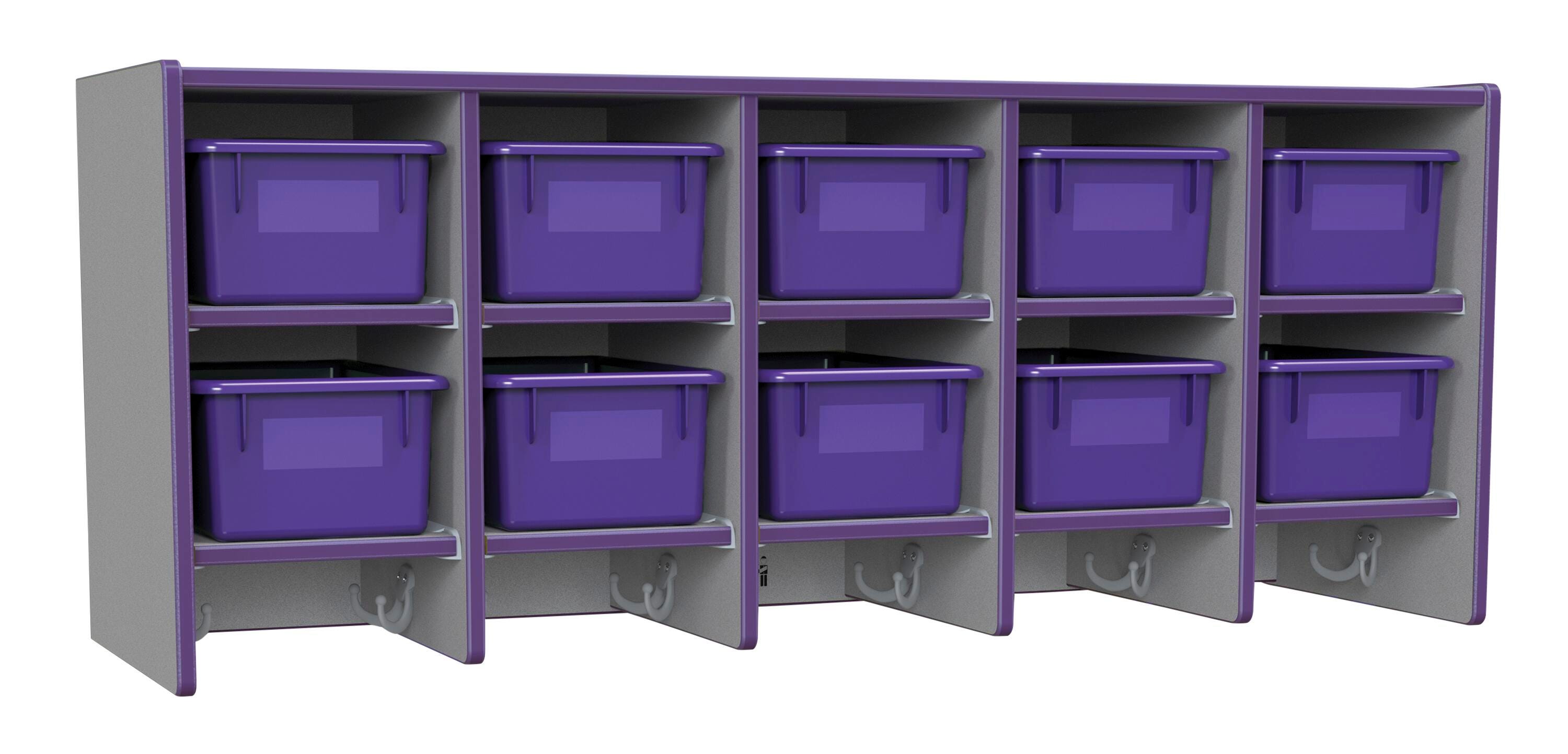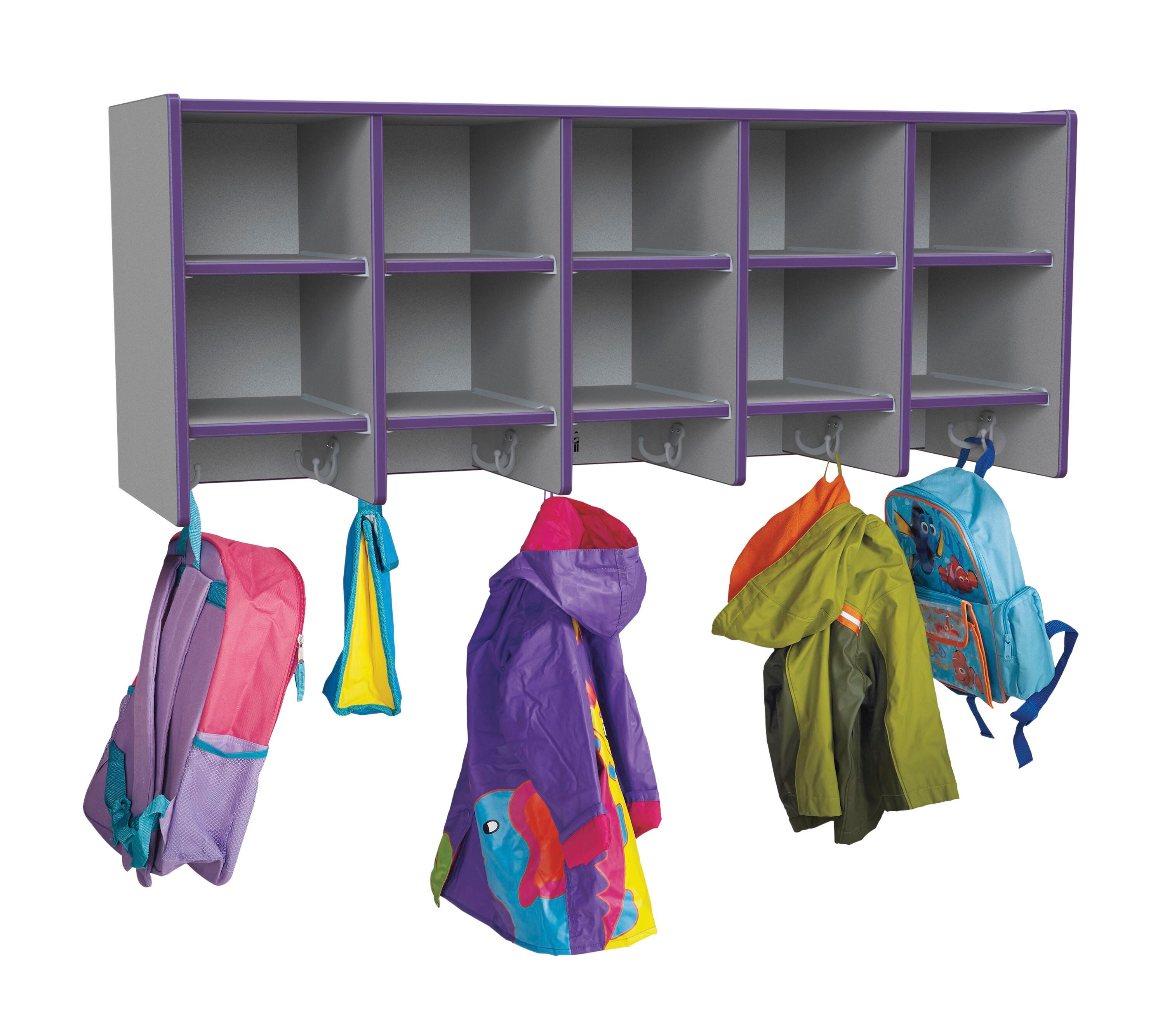 • Ten Cubbie-Tray openings and ten double coat hooks provide space for children's books, bags, coats, and more