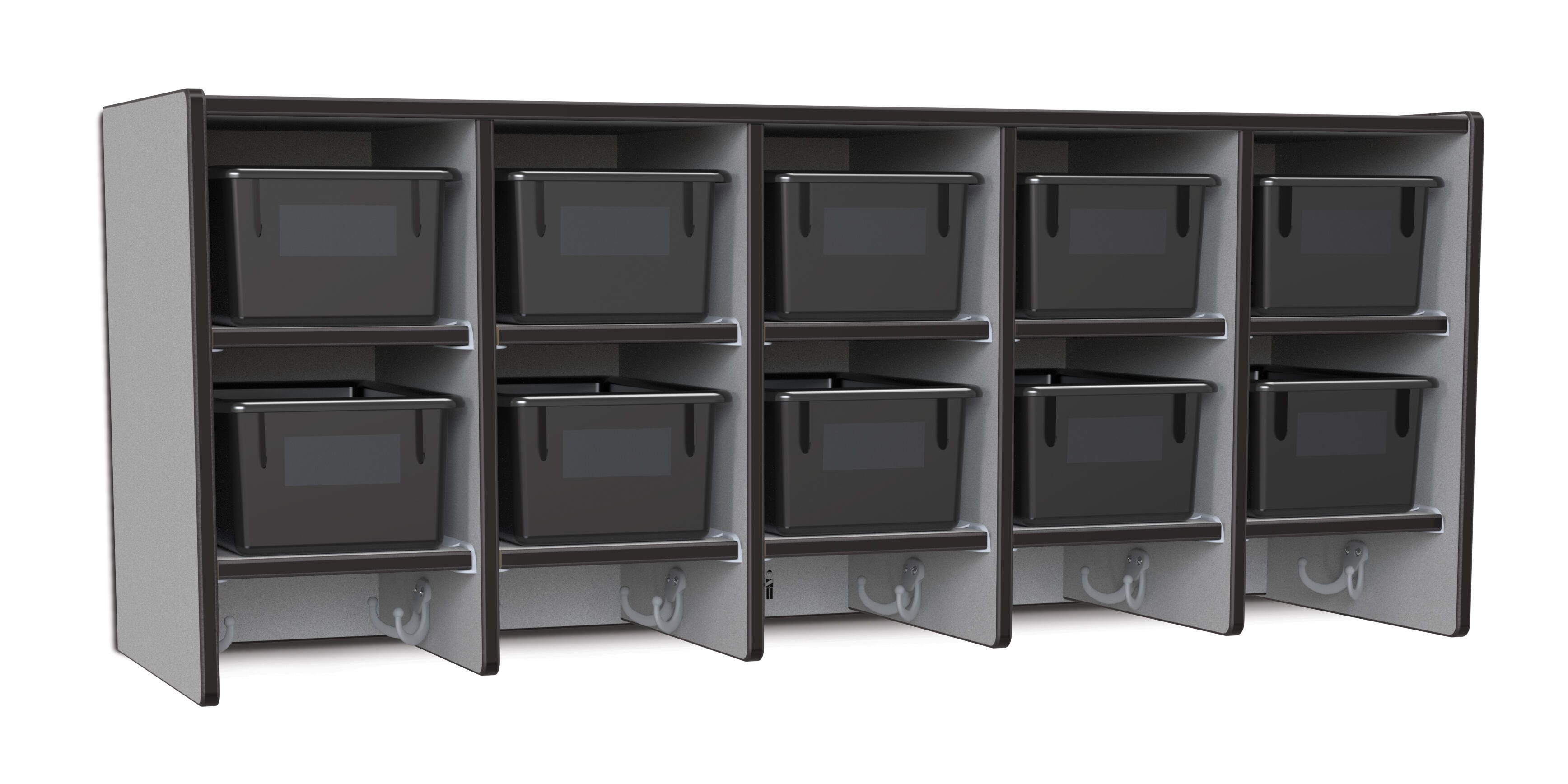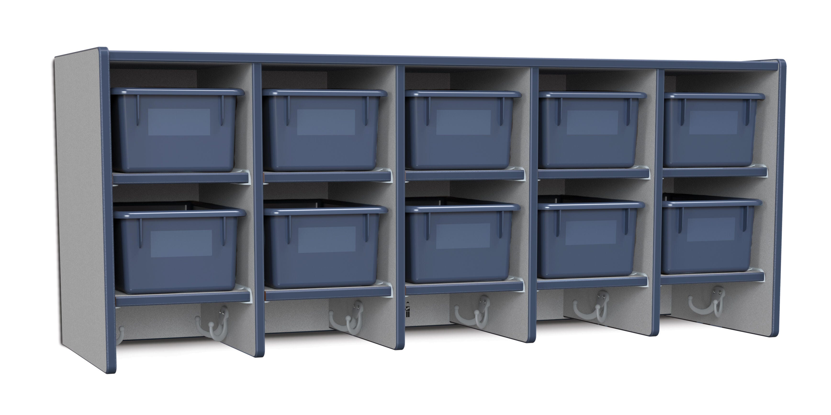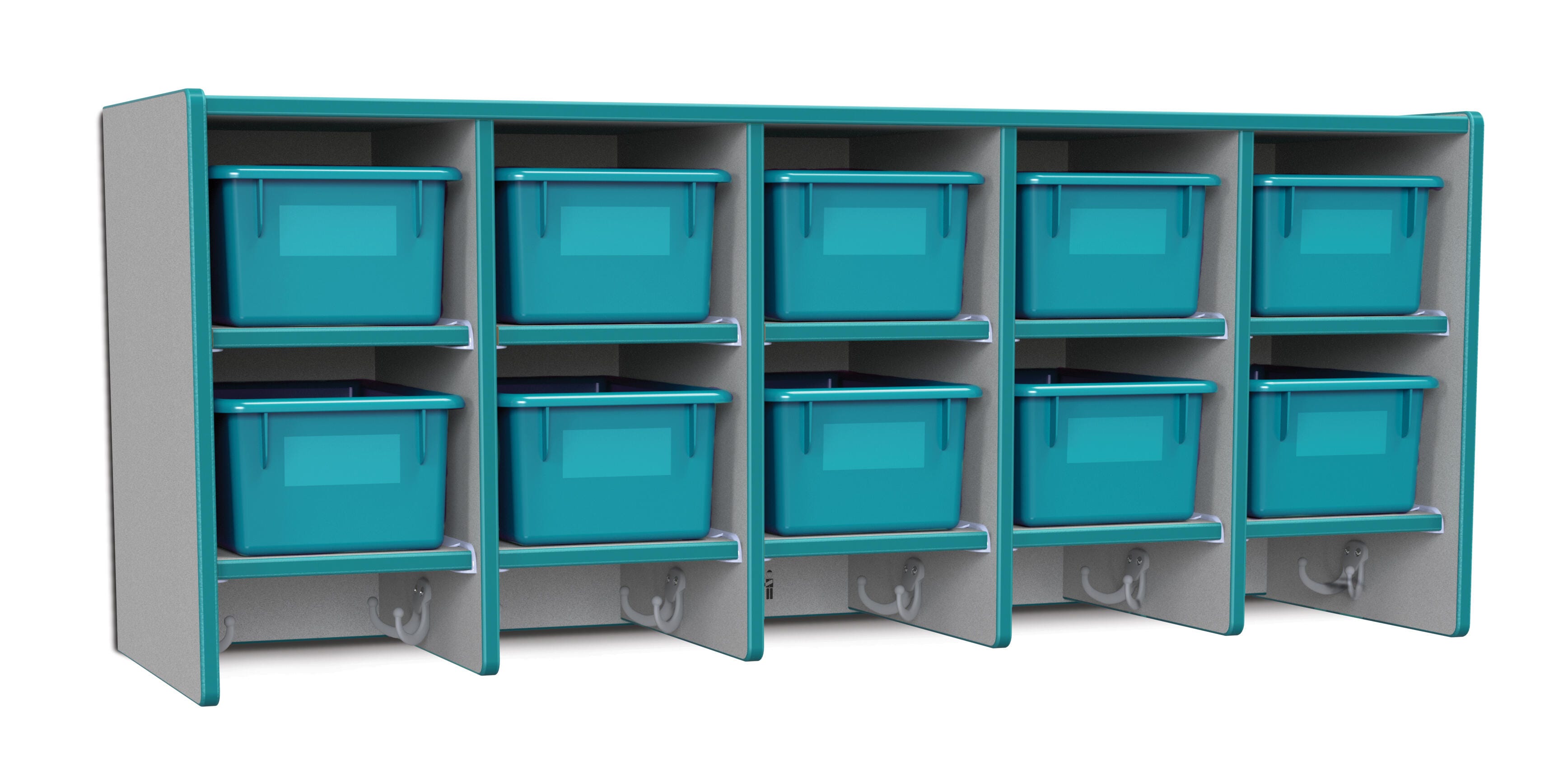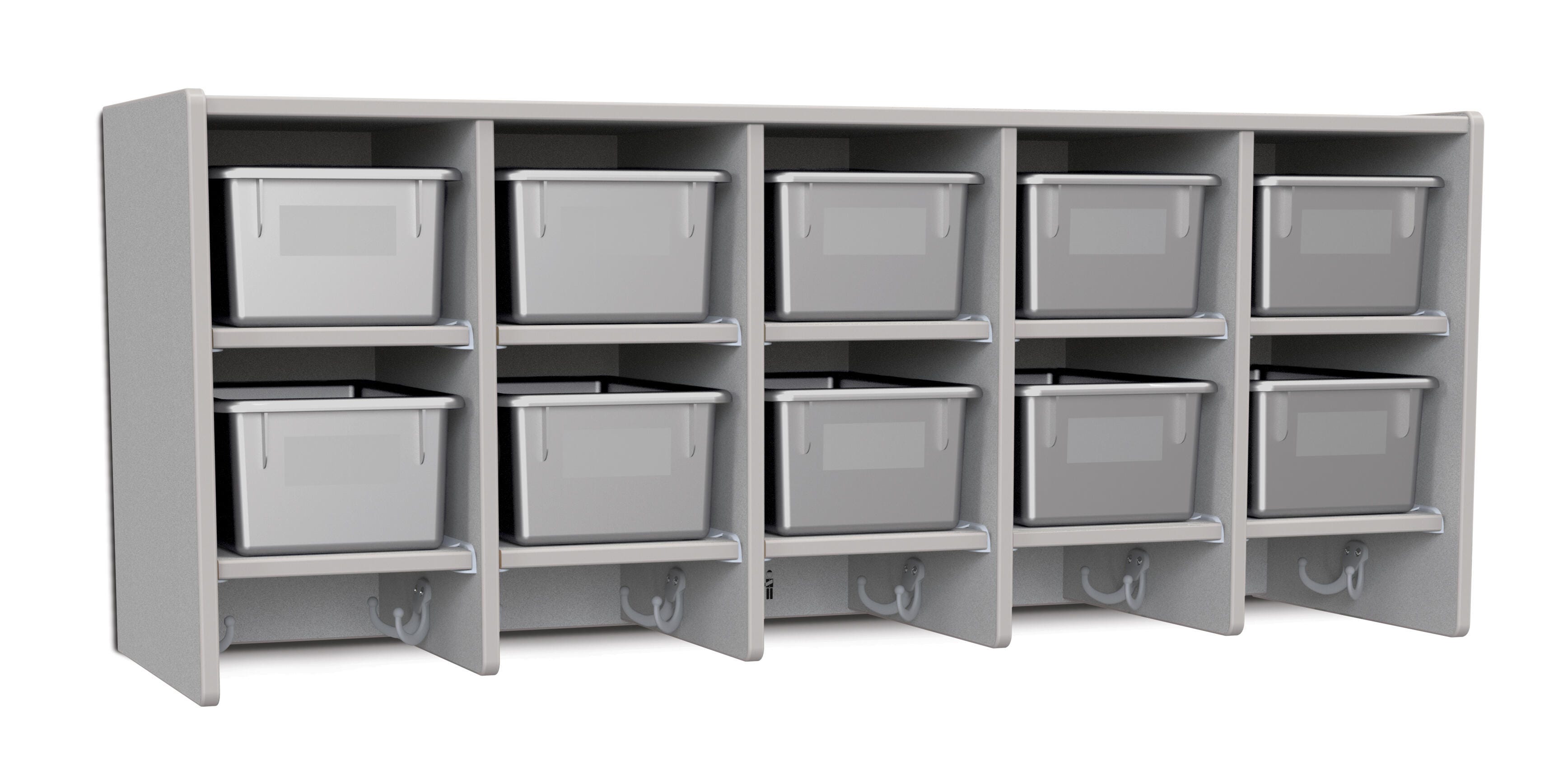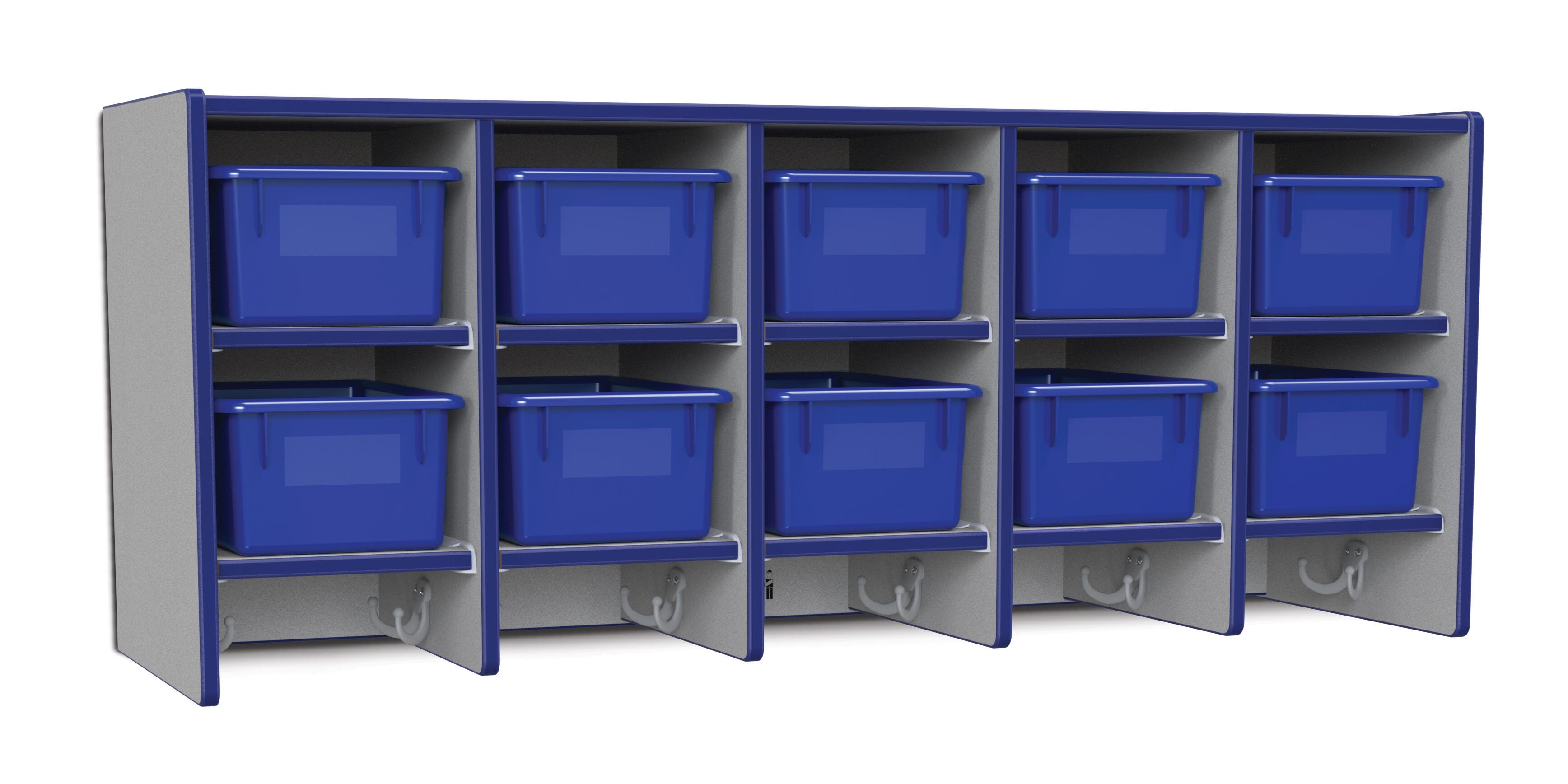 • Ten Cubbie-Tray openings and ten double coat hooks provide space for children's books, bags, coats, and more