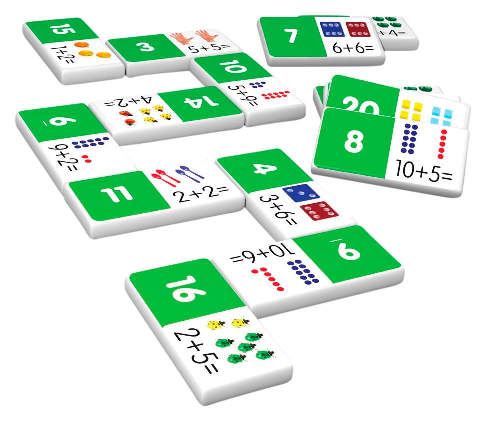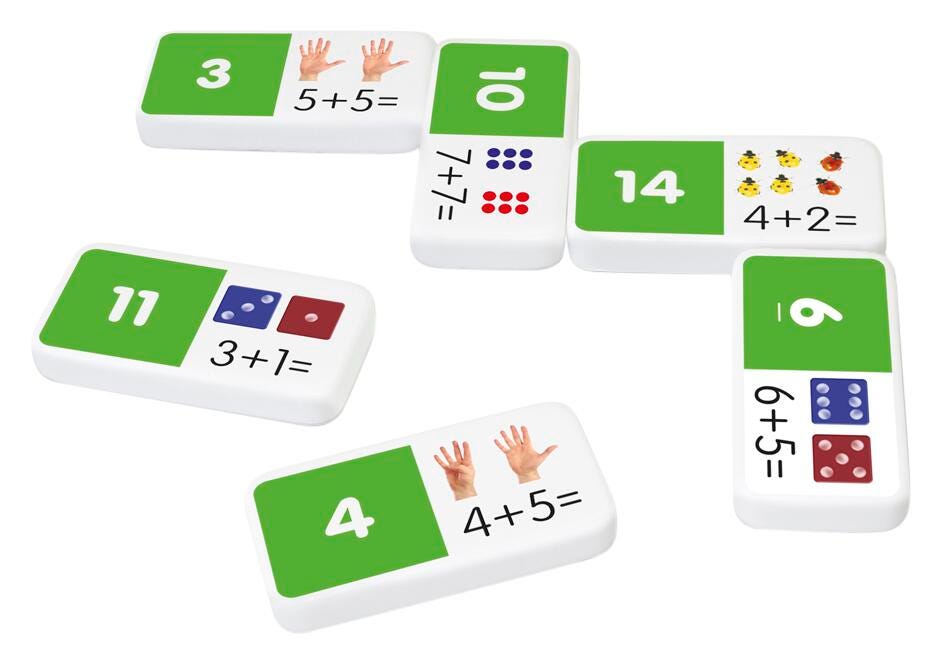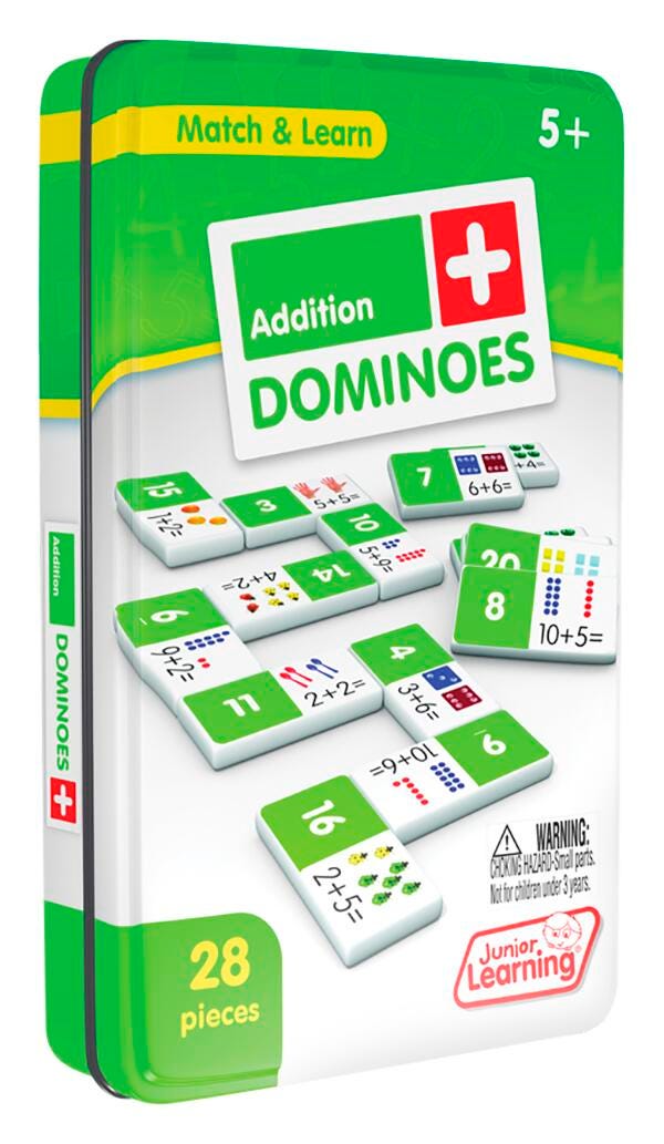 Addition dominoes include a 28 piece set on thick plastic dominoes. Children will love the feel of real dominoes as they complete the addition matching game. Appropriate for ages 5-10 years old.Features