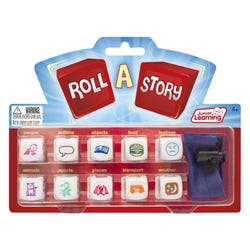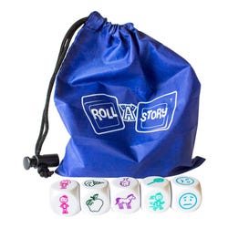 Help children develop story telling and oral language with Roll A Story dice. Simply roll the dice and let the pictures guide children's imagination. How to Play: 1. Roll the dice and look at pictures face up. 2. Group dice together that are related. 3. Choose the dice you want to use and the best dice to start your story. Categories include: people, animals, food, places, transport, feelings, weather, actions, sports, objects. Contains 10 picture dice and 1 carry sack. Ages 4-12, Grades K-4.Features