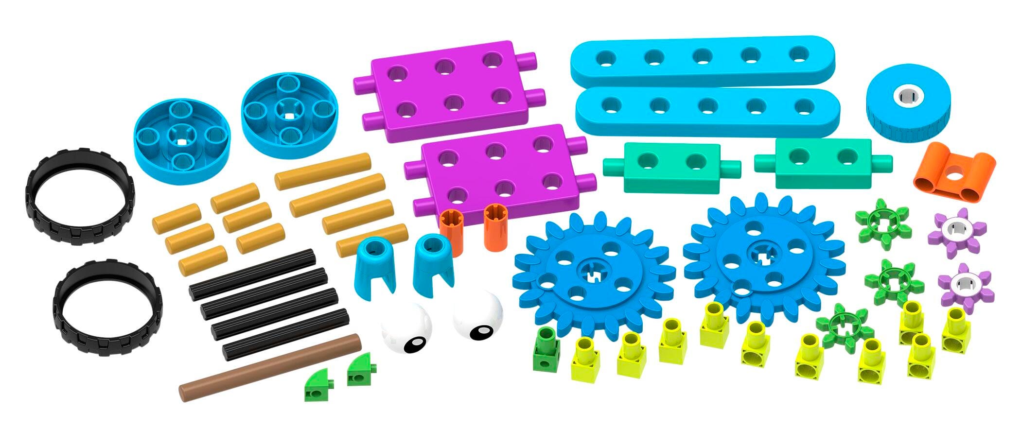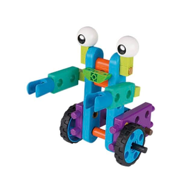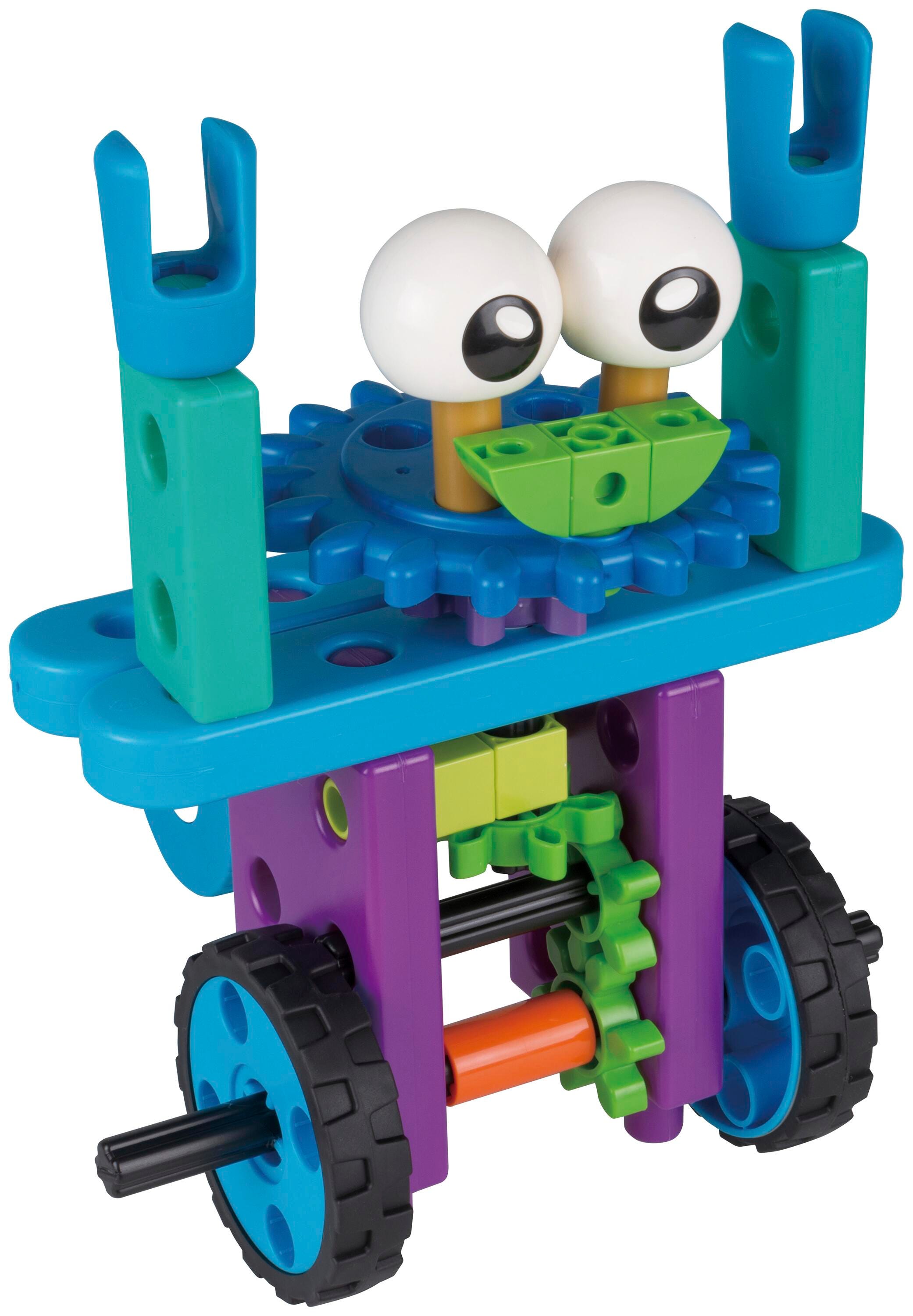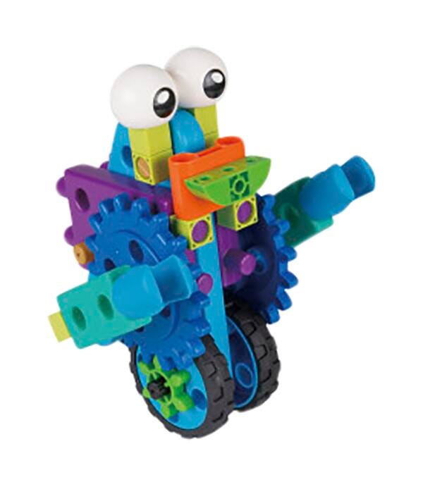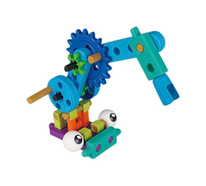 Read the funny story of two inquisitive kids, Ty and Karlie, and build simple, non-motorized models of the robots they construct and fix during their adventure to an automated candy factory. During this zany outing, Ty and Karlie build various robots to perform tasks and solve problems in the factory. The robots have moving parts, wheels, and gears, so kids can learn firsthand about simple machines and gear trains. As you follow the story, you can build models of the ten robots featured in the story. Large, colorful plastic building pieces make it easy for small hands to put the models together. In the story, the kids build robots with arms that rotate, turn, and spin. They fix a robotic arm and other specialized robots that complete specific tasks inside the factory. They construct a robotic drone that flies through the factory to coat the candies in sprinkles, wheeled robots that zoom across the factory floor, a taffy-pulling robot, and a funny gum-kneading robot. From each humorous segment of their silly adventure, the kids learn something new about robots and machines. This 53-piece science kit combined with the beautifully illustrated storybook provides an engaging way to teach simple engineering concepts to preschool-age kids. Start laying the groundwork for strong STEM related skills and comprehension. This kit helps develop fine motor skills, science and math skills, visual-spatial skills, and reasoning and concept development skills.Features