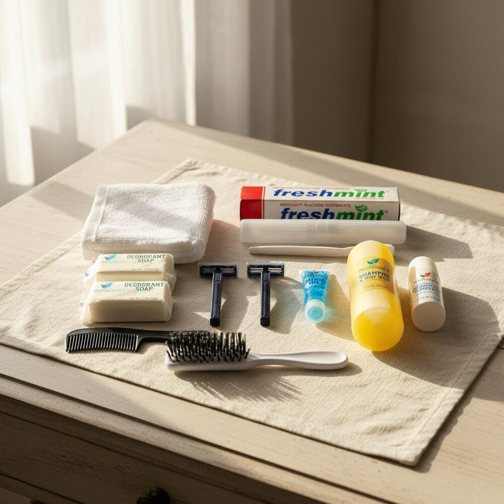 Products come inside a reusable nylon toiletry bag for easy distribution and storage