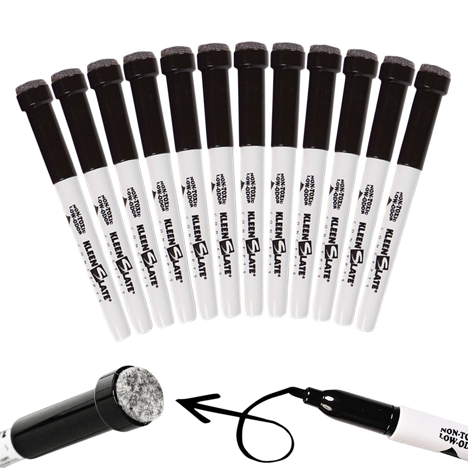 KleenSlate Dry Erase Markers to be used with your Dry Erase Whiteboards. Features low odor, small, black markers with an eraser. Has the new feature of 48-hour cap-off ink. The round tips do not push in. Conforms to CPSIA and ASTM D-4326 standards. Comes in a pack of 12 black markers.Features