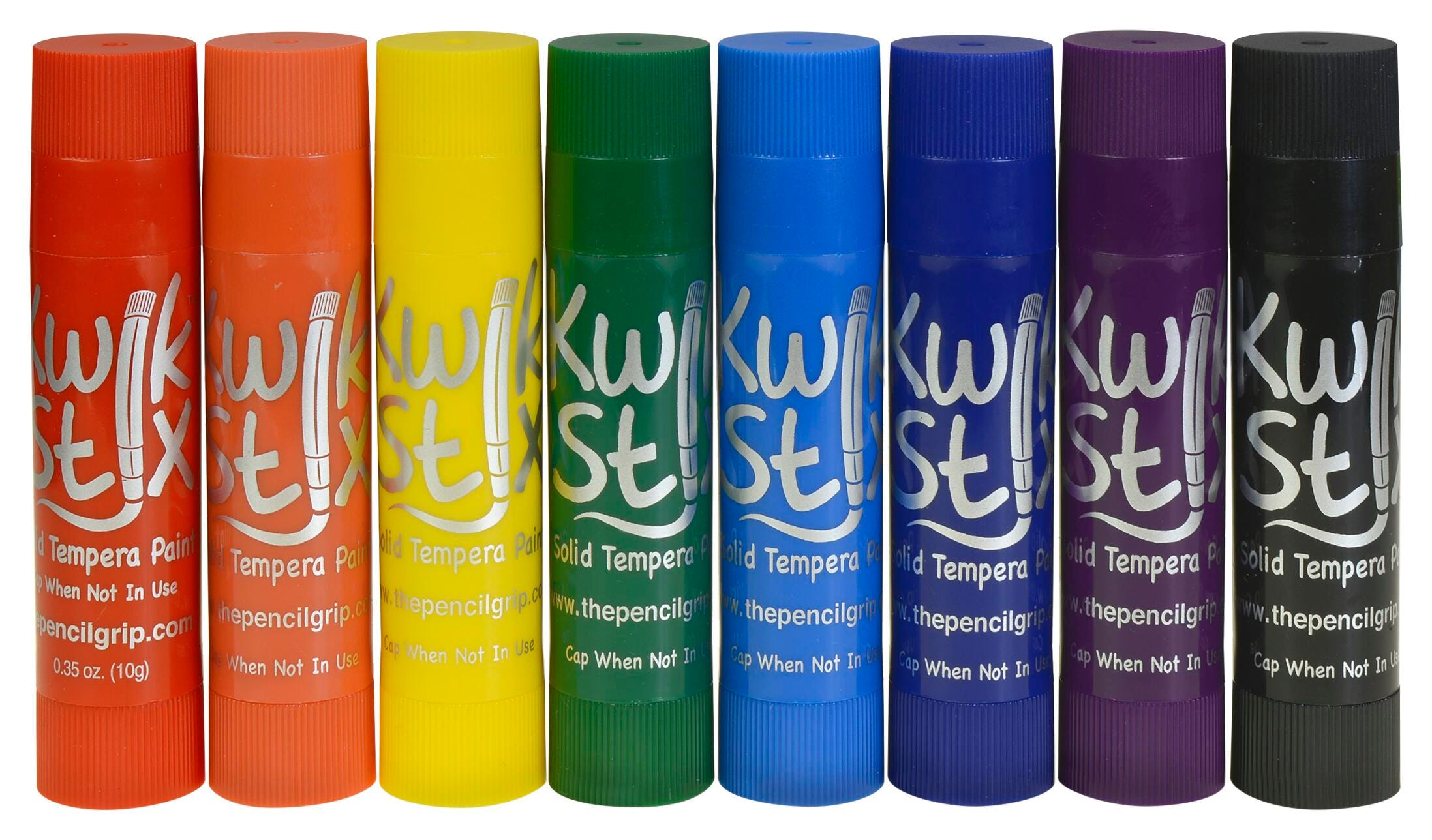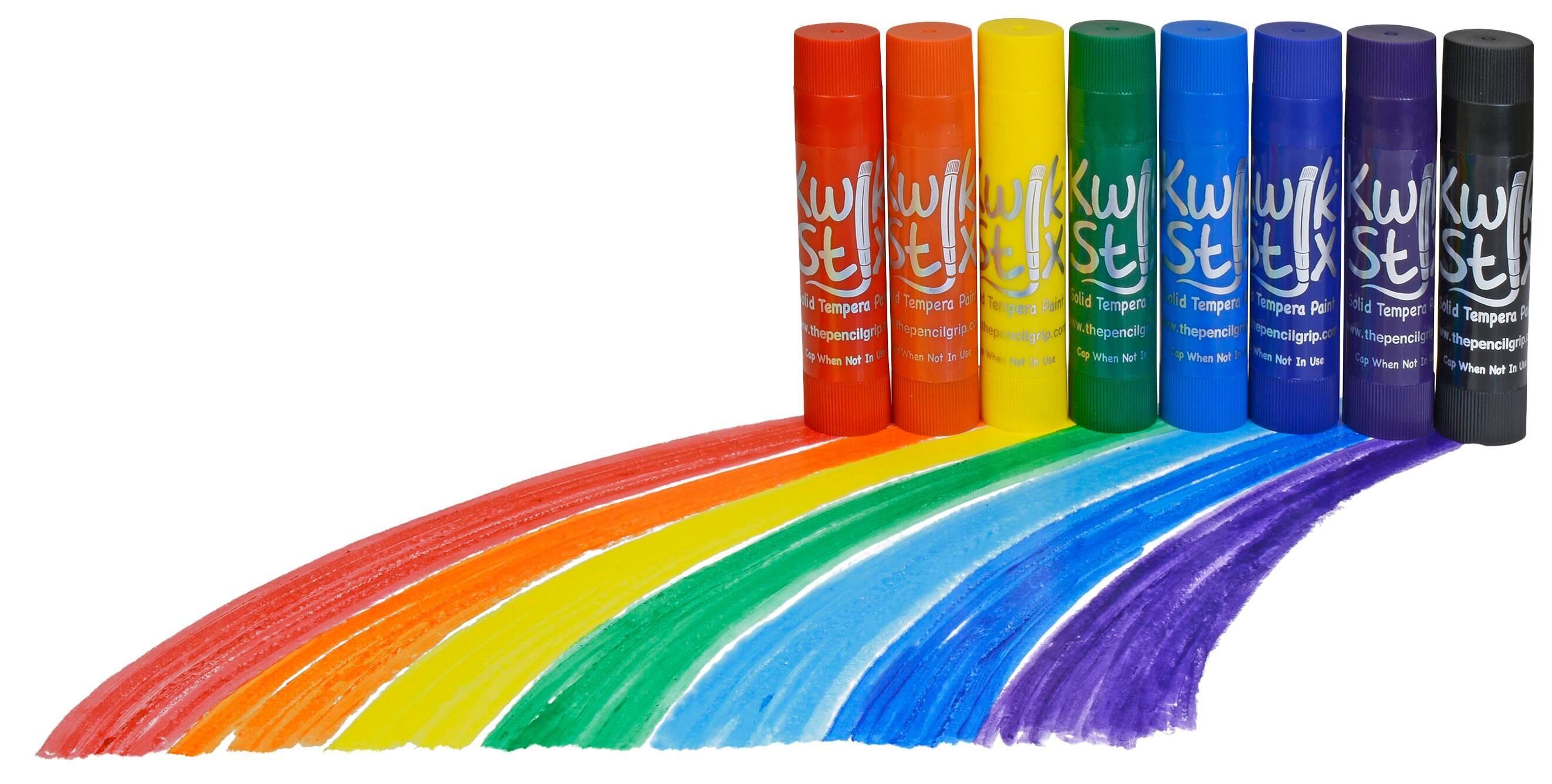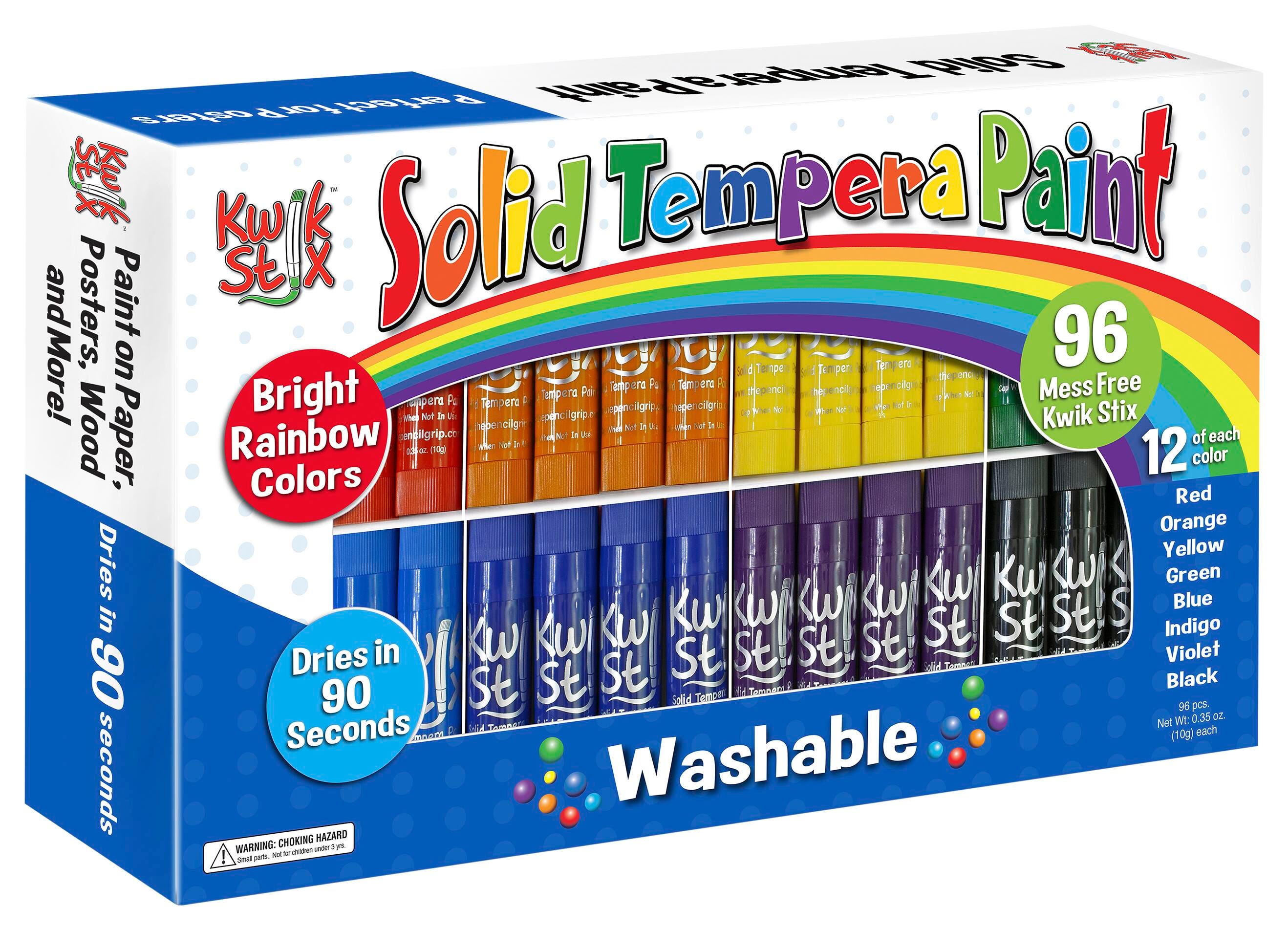 Kwik Stix Tempera Paint sticks take the mess out of painting while keeping all the fun! Simply uncap, twist, and paint! Kwik Stix have a fast drying formula that allows them to dry in 90 seconds while still leaving a paint-like finish. No cups, smocks, water, or brushes required- less time for clean up, more time for fun. Kwik Stix come in assorted vibrant colors with coverage that won't crack. Great on poster paper, cardboard, wood, canvas, and much more. Kwik Stix are tested to the highest testing standard and are nut, egg, and gluten-free. This large pack contains 96 paint sticks, with 12 sticks in each of the following colors: red, blue, indigo, green, yellow, black, orange, and violet.Features