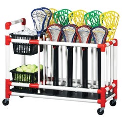 This Lacrosse Cart conveniently stores and safely transports up to 40 lacrosse sticks of many types and sizes plus balls and other accessories. Features high quality, high impact, structural-grade plastic that will not rust, corrode, chip or peel, heavy duty, ball bearing, swivel casters with 3 inch diameter, no-mar, rubber wheels and locking casters to secure cart in place and a convenient handle for comfortable cart control. Includes two large, injection-molded, plastic baskets, with folding handles. Easy to assemble and passes through standard doorways even when fully loaded with equipment.Includes: