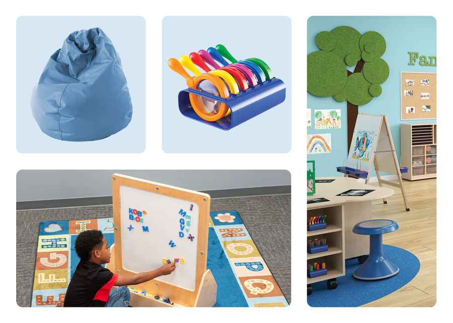 Enhance kindergarten learning, collaboration, and foundational skill-building with writing centers, math manipulatives, flexible seating, and classroom rugs.
