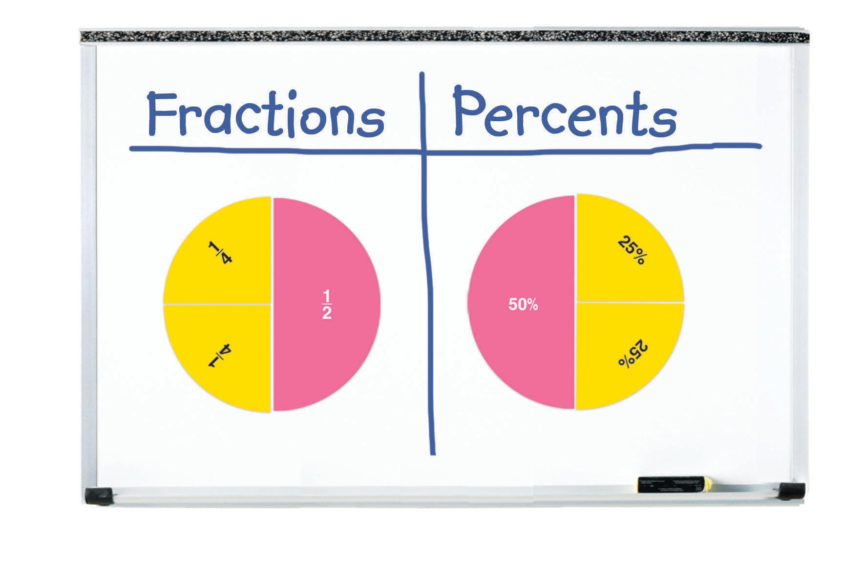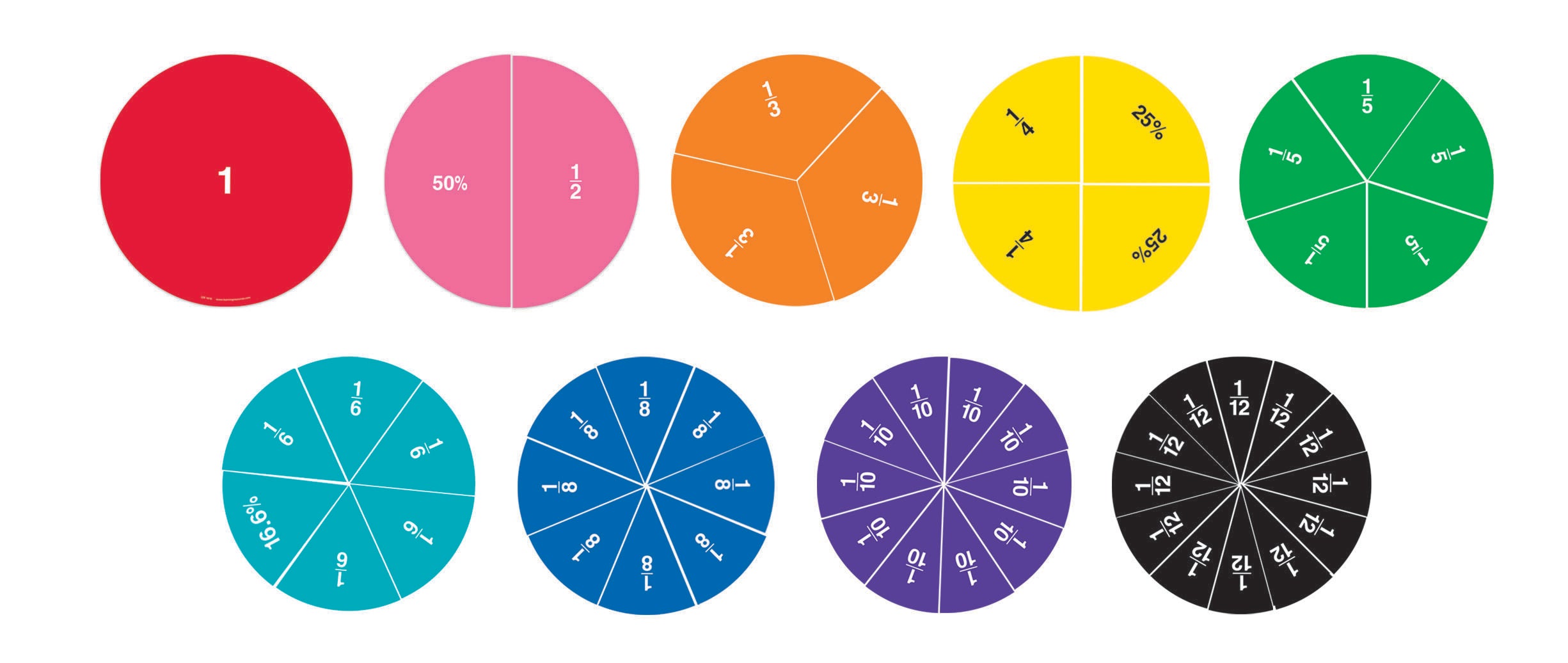 Demonstrate fractions, percentages and equivalencies on your whiteboard. Helps students understand relationships between concepts of fractions and percentages - labeled with fractions on one side and percentages on reverse. Includes 9 circles, each measuring 7.5", includes whole, 1/4, 1/2, 1/3, 1/4, 1/5, 1/6, 1/8, 1/10 and 1/12. Includes Activity Guide
