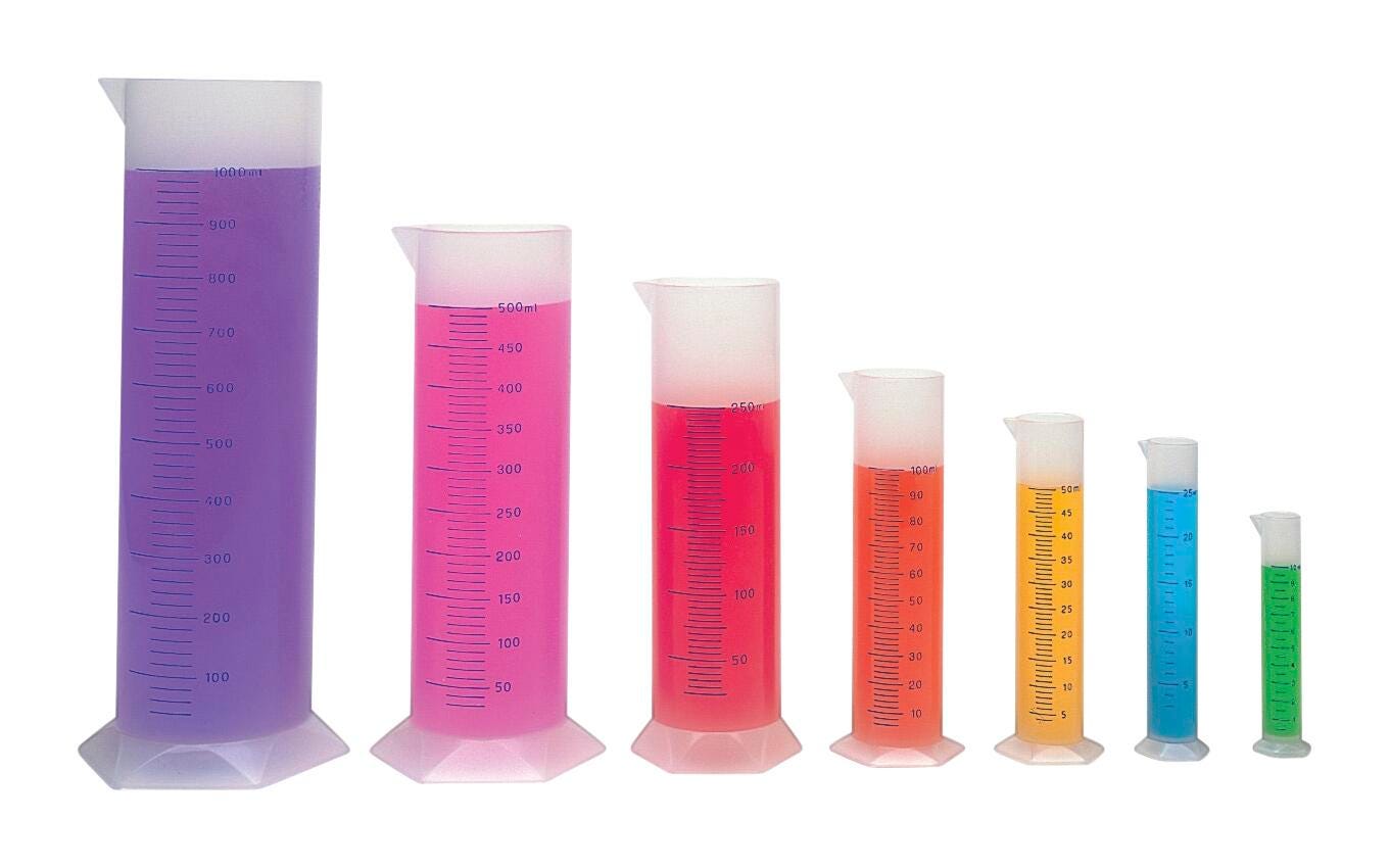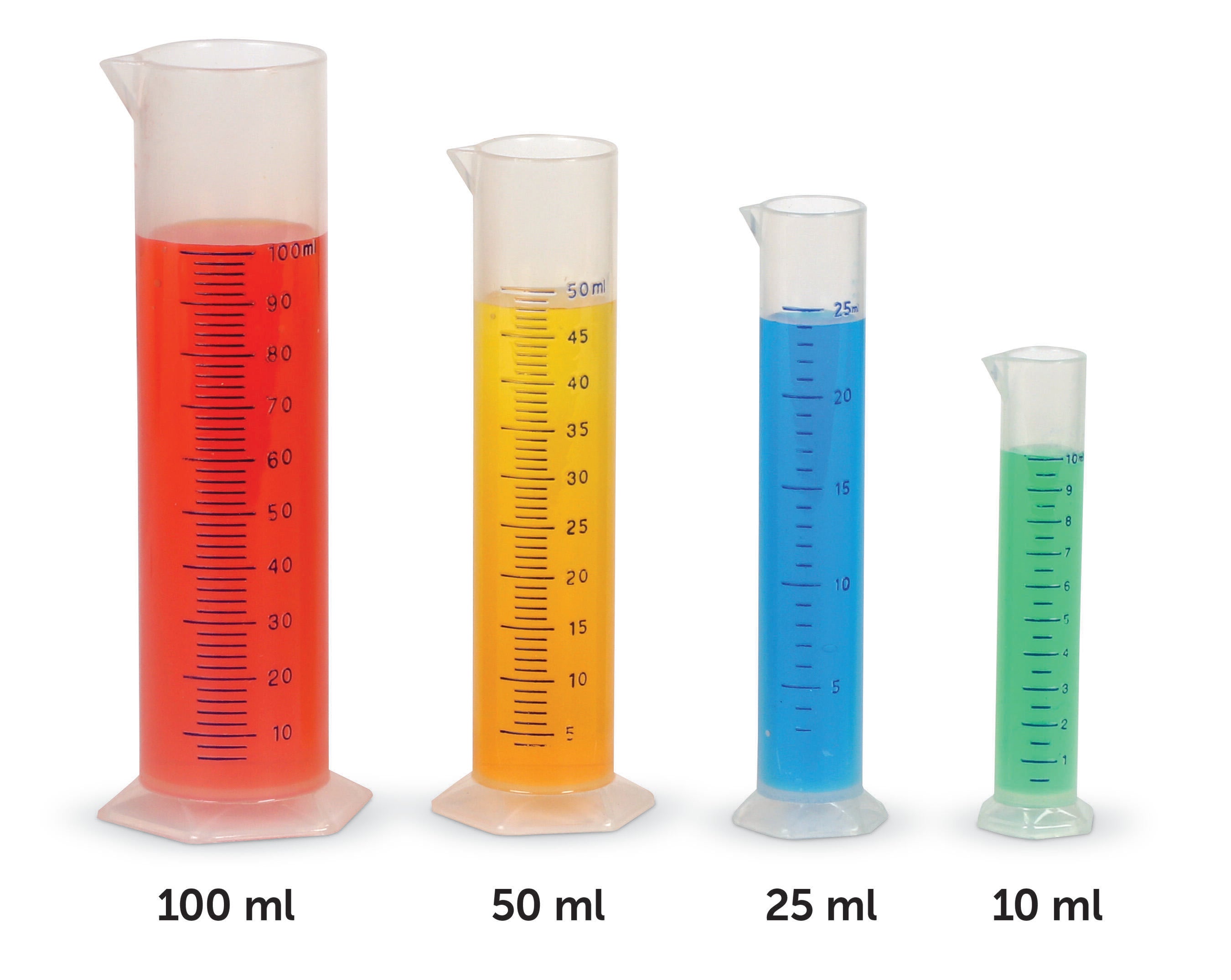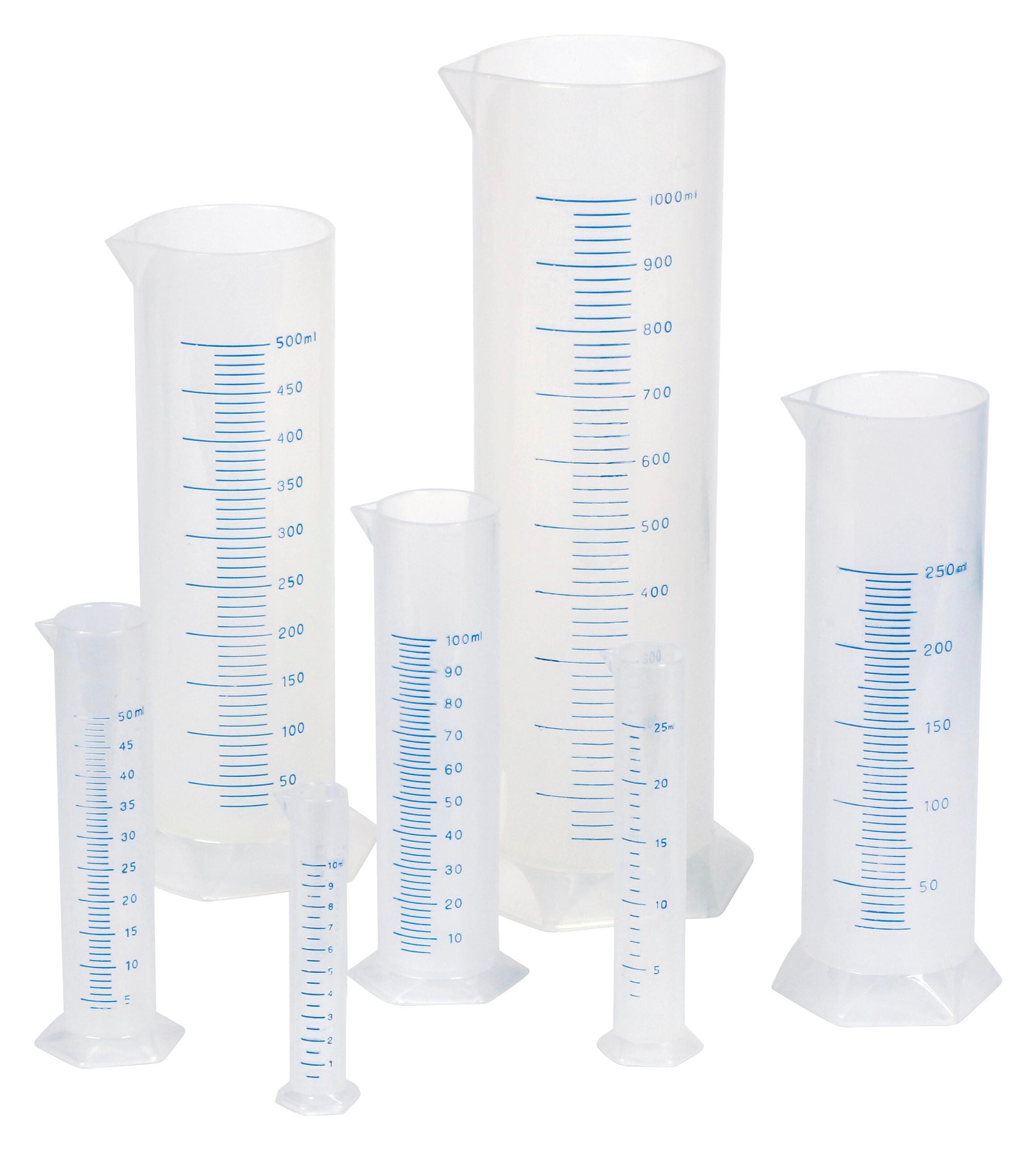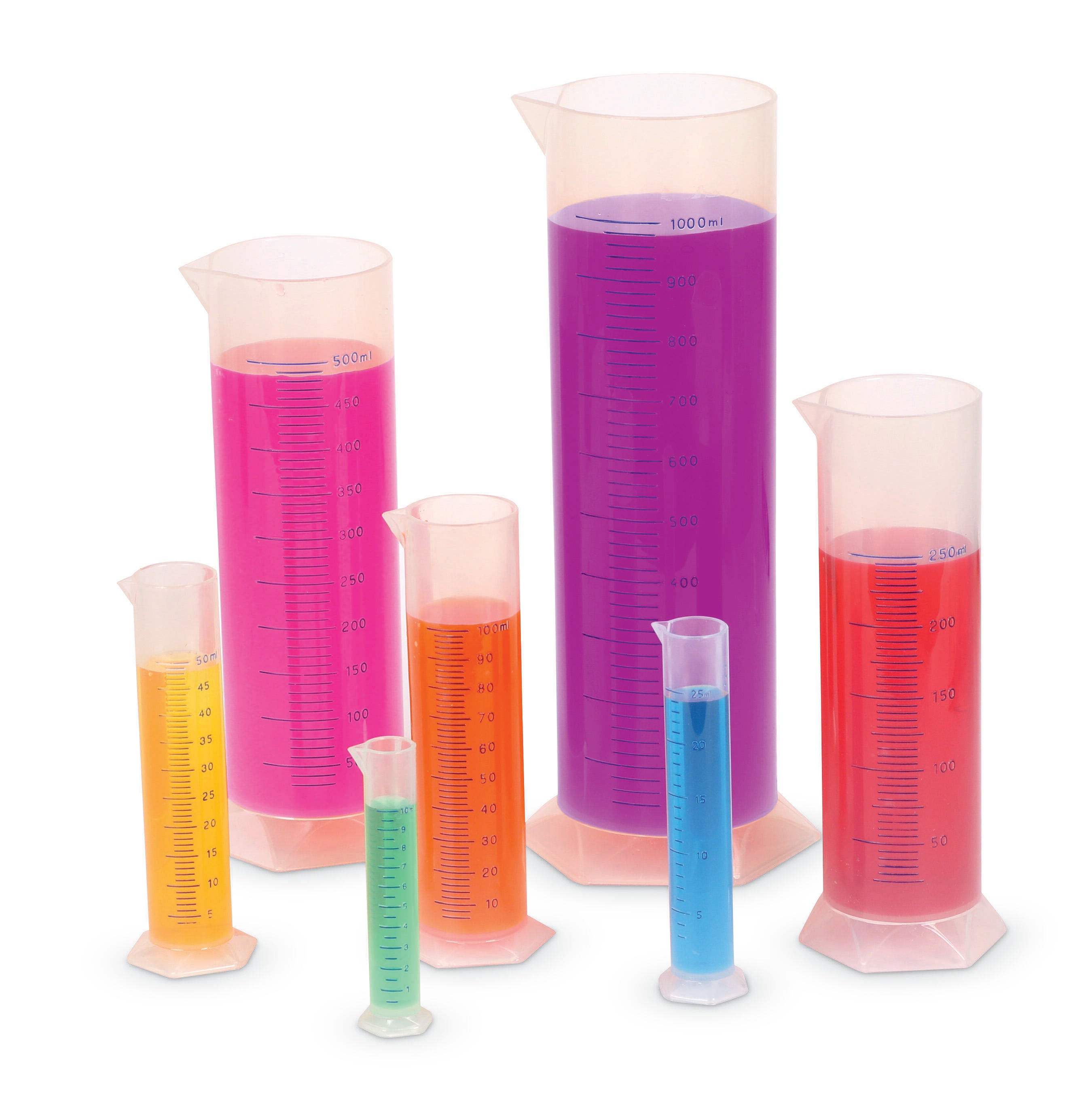 Learning Resources Measuring Graduated Cylinder Set contains 7 autoclavable cylinders that include 1 each of 10 ml, 25 ml, 50 ml, 100 ml, 250 ml, 500 ml and 1000 ml. Graduated Cylinder features hexagonal bases to offer stability and is molded from polypropylene. Single graduated cylinder has tapered spouts and raised prominent graduations to allow easy reading as well as offers great contact clarity. Grades 3 and Above, Ages 8 and Above.