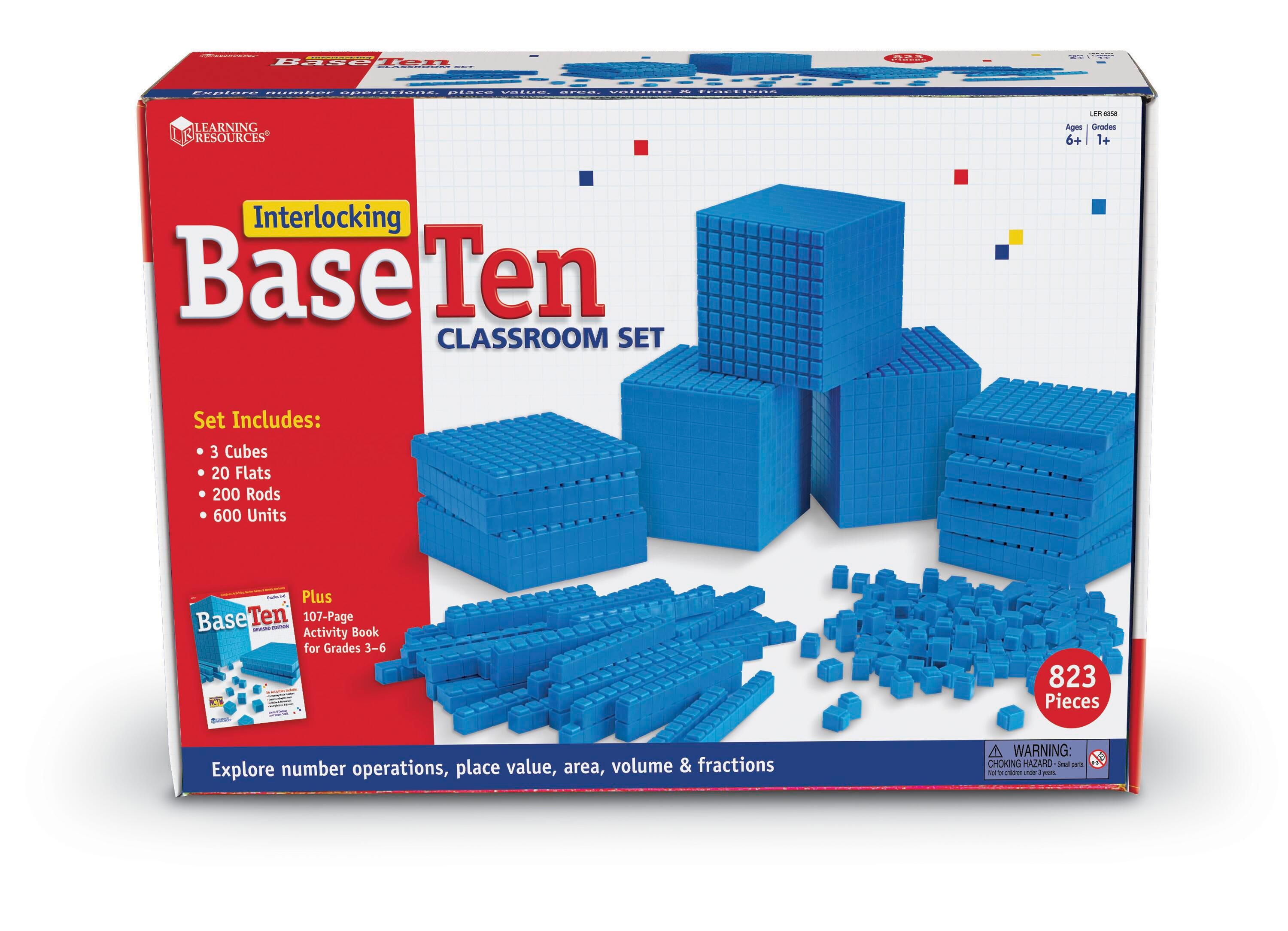 The Interlocking Base Ten Classroom Set from Learning Resources delivers an interactive and intuitive way to practice math skills. These interlocking pieces can clarify place value, estimation, and operations concepts by enabling students to manipulate and visualize varying quantities with ease. More advanced classes can use these versatile math maniplatives to explore spatial relationships and volume. The plastic pieces are washable and durable for years of hands-on activities. This set is suitable for use by 20 to 25 students, and includes 600 units, 200 rods, 20 flats, 3 cubes, and a base ten book. Recommended for ages 6 and above.