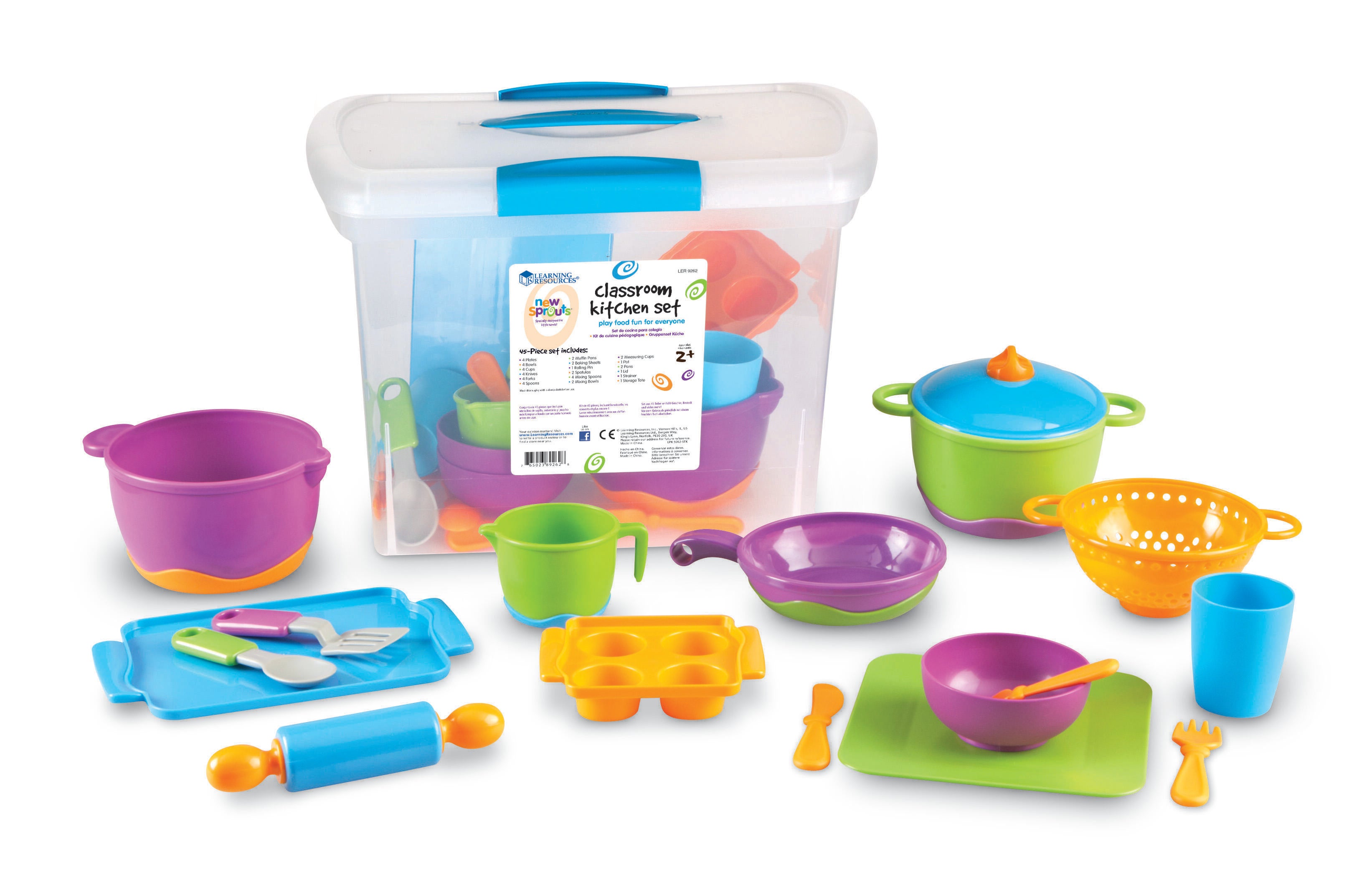 Whip up fun for the entire room with this set of kitchen play essentials! Large 44-piece set includes the essentials for cooking, baking, serving, and beyond. All pieces have a modern design, soft rounded parts, and easy-grip handles for your youngest chefs. Style coordinates with the New Sprouts Classroom Play Food Set. Full set of 44 pieces comes stored in a handy tote measuring 14 1/4 L x 9-5/8 W x 12-1/8 H inches. Storage tote colors may vary. For ages 2 and up.Features