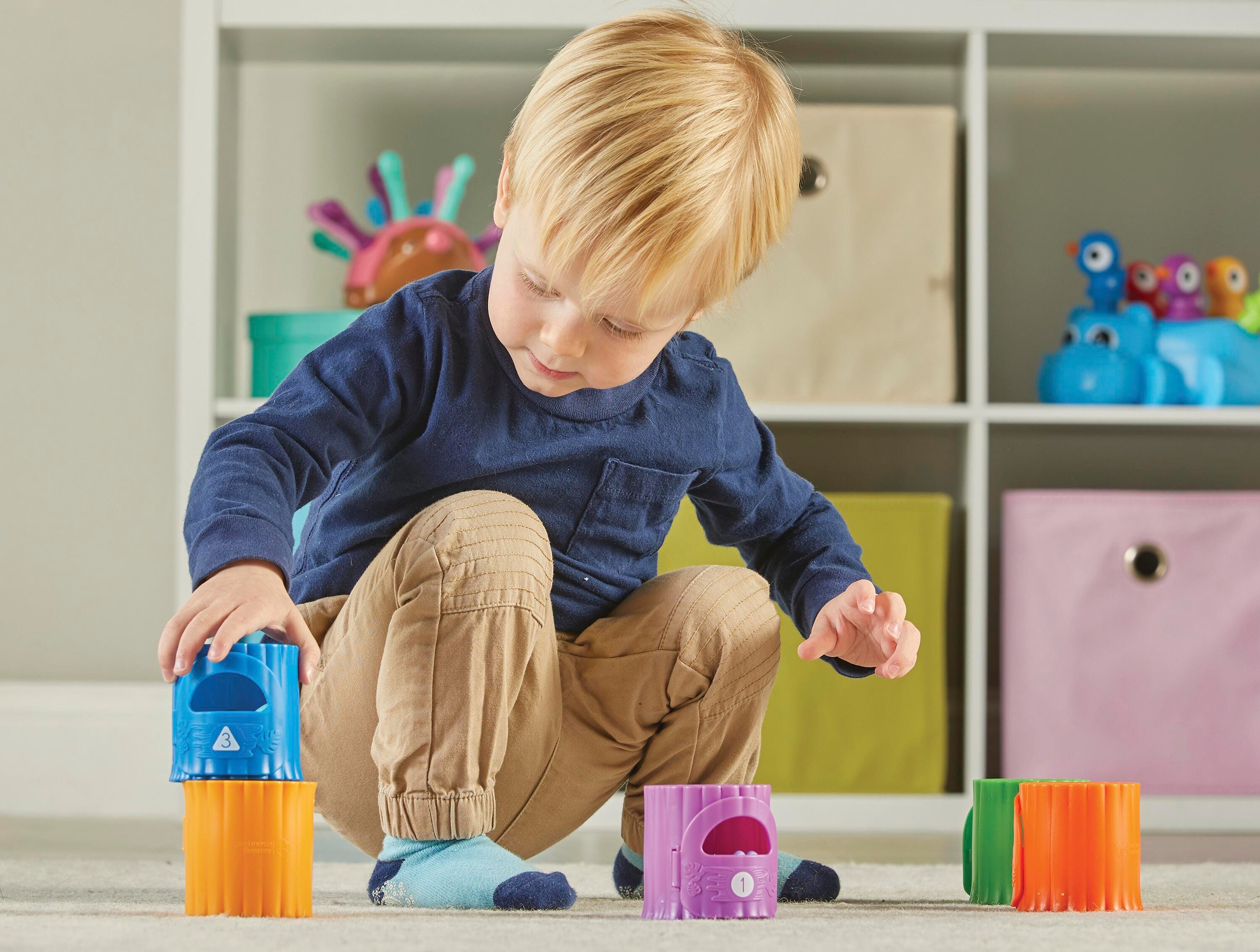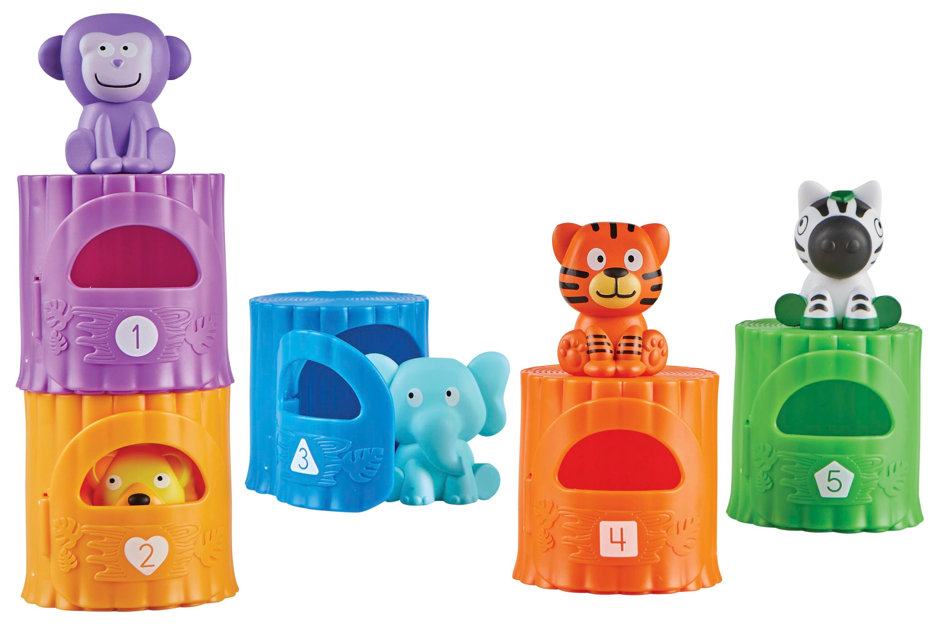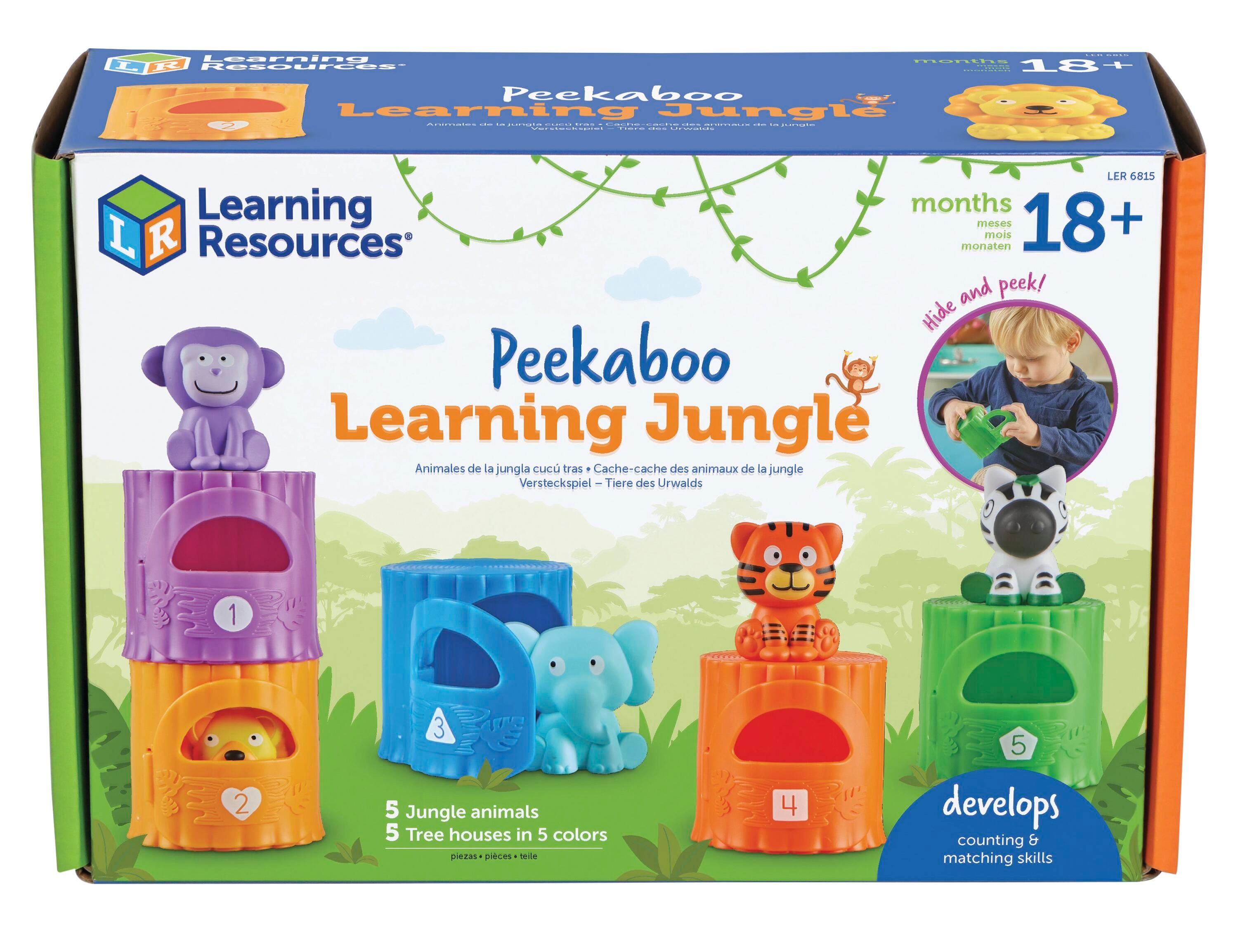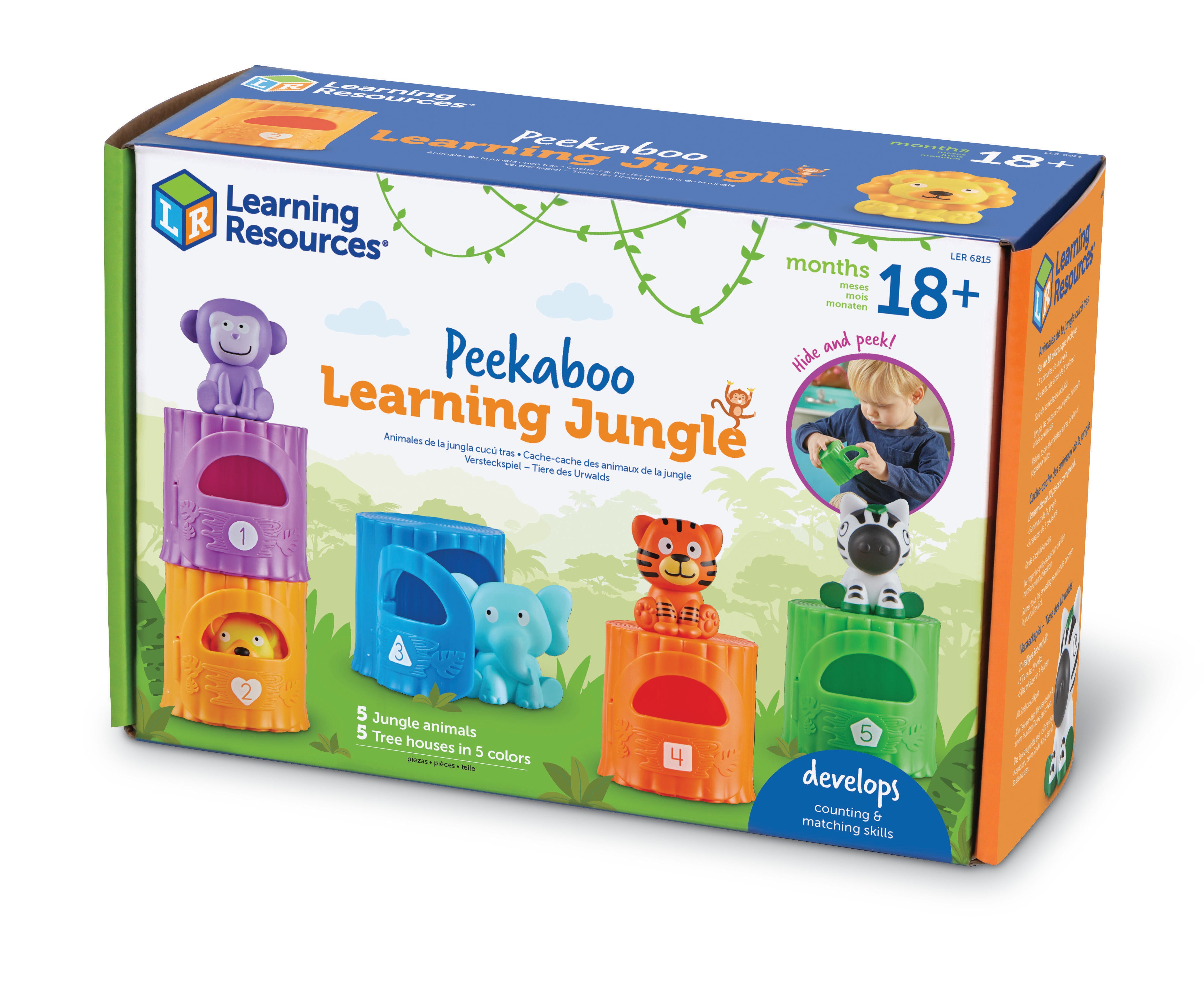 Stack up the fun with this fun Peekaboo Learning Jungle by Learning Resources. This set is built for ages 18 months and up, and comes with five animals paired with five stackable treehouses.