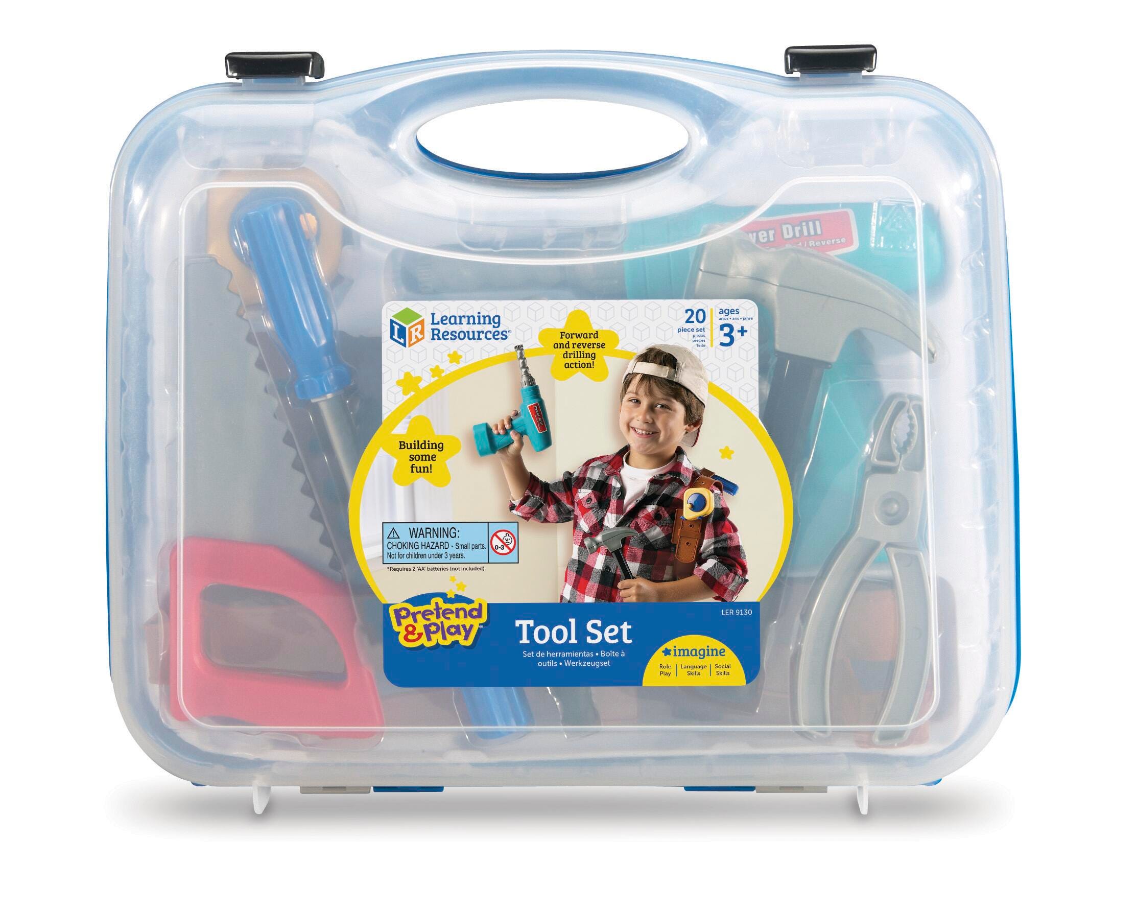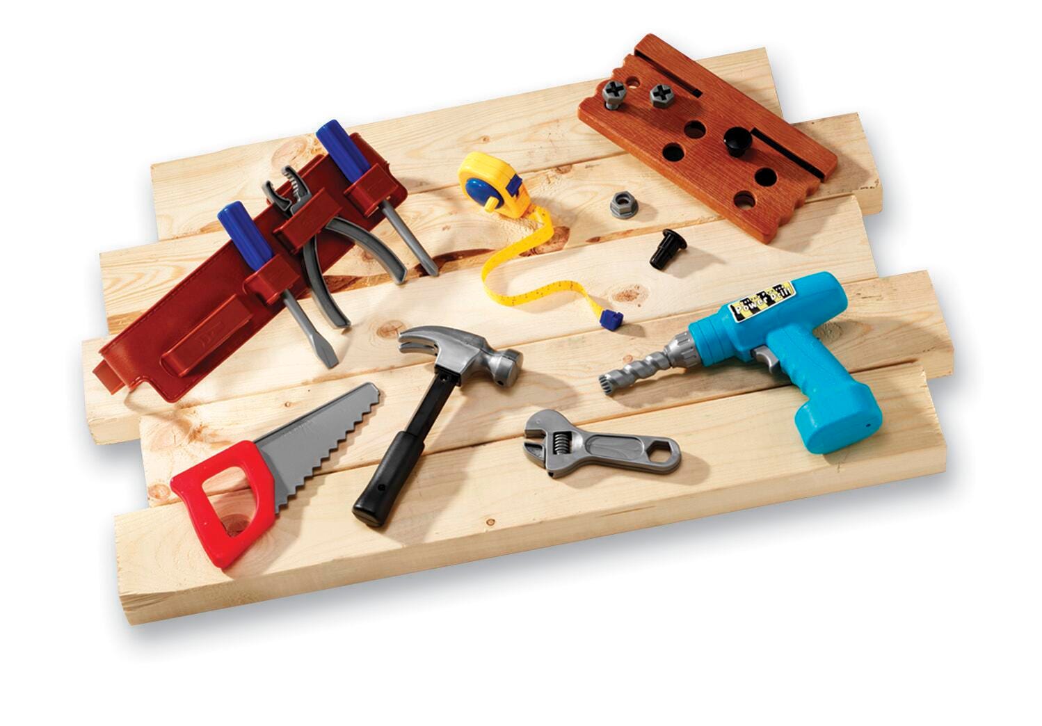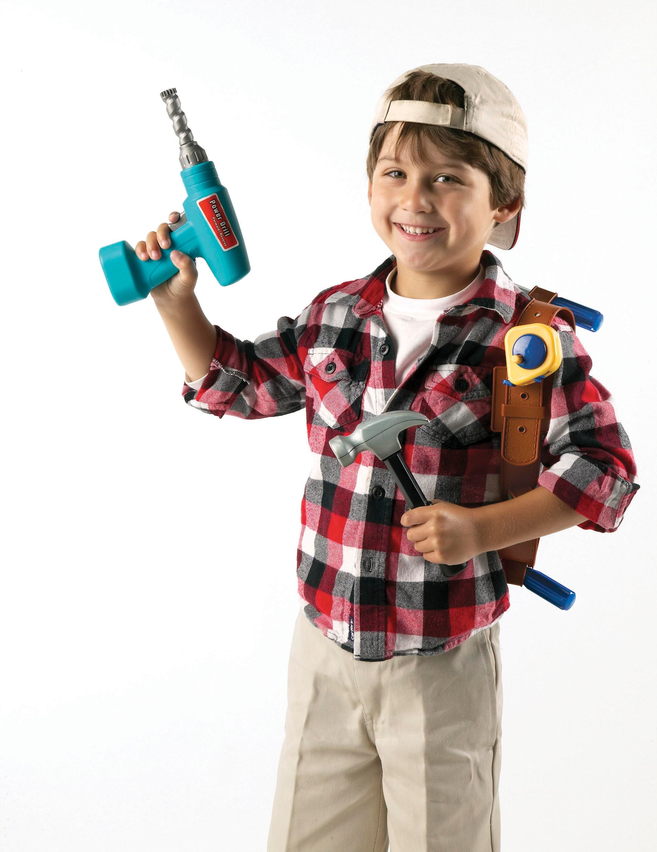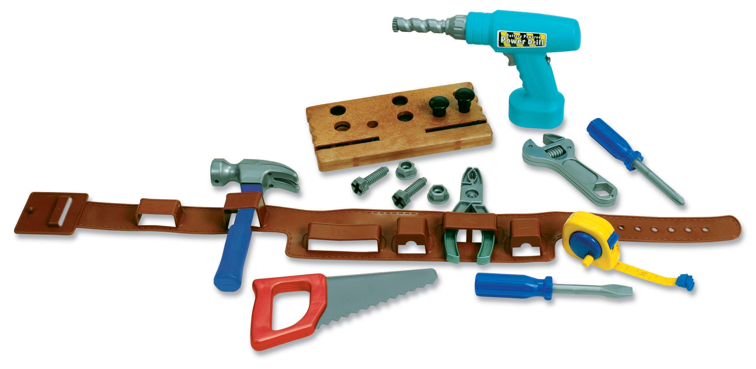 Strap on the handy tool belt and grab the battery-powered drill – there's building to do! This 20-piece set features a wood board with specialty-sized bolts for drilling. Everything stores in a sturdy 14 L x 3-1/2 W x 12 H inches carrying case. Drill requires 2 AA batteries, not included. Ages 3 to 6.Features
