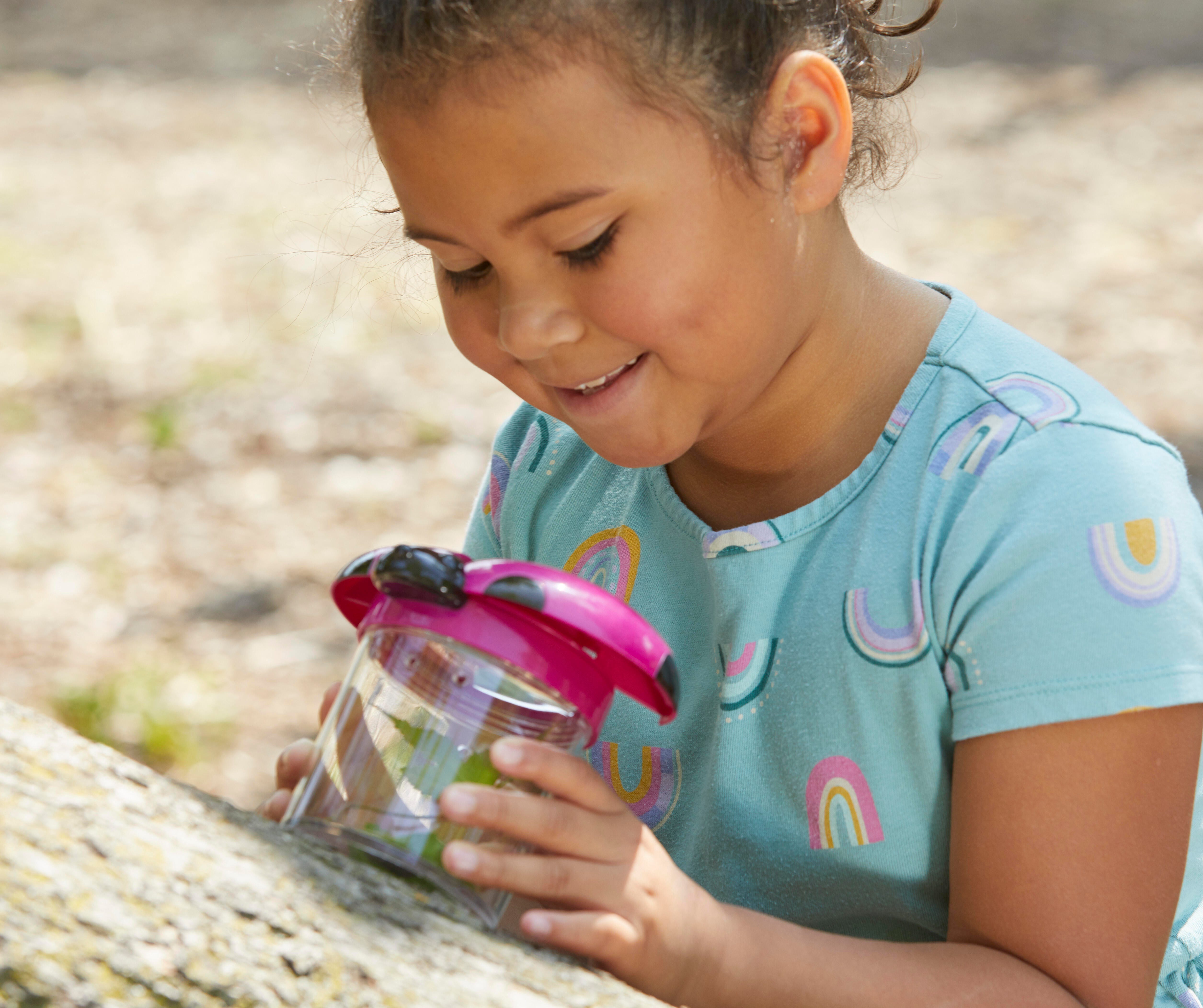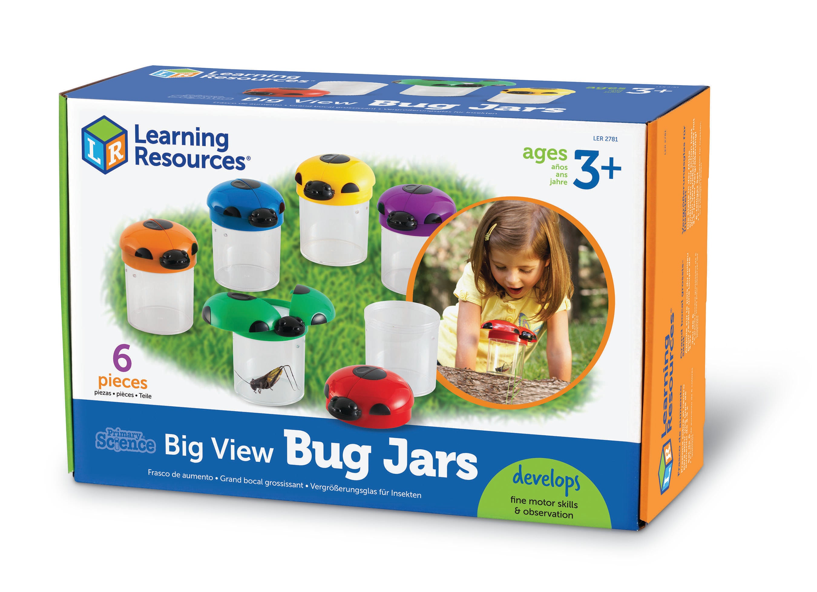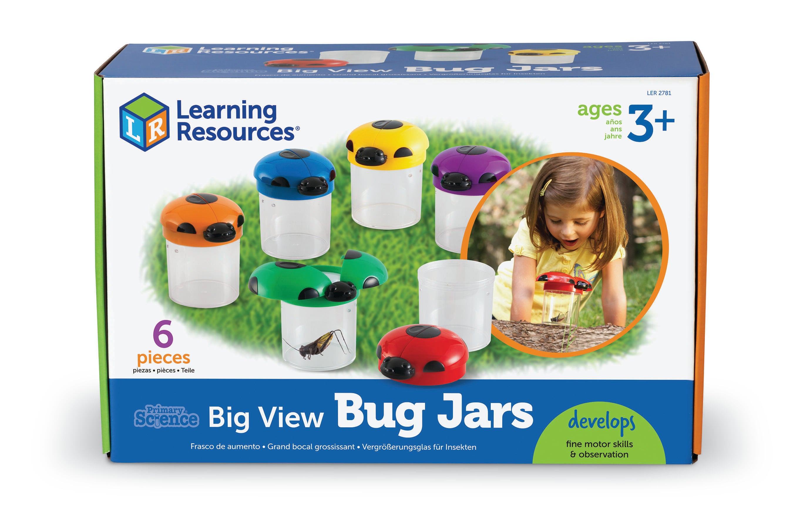 Learning Resources Big View Jars are colorful jars which have ladybug wings that open to invite little learners to investigate insects. Even children who normally shy away from bugs will be excited to capture and observe critters (and other items) in these engaging observation jars. Wings open to reveal a 3.5x magnifying lens. Screw-on cap and air vents keep specimens secure. Durable plastic jars measure 4-1/2 Dia x 3-1/2 H inches. Grades PreK and Above, Ages 3 and Above. Set of 6.